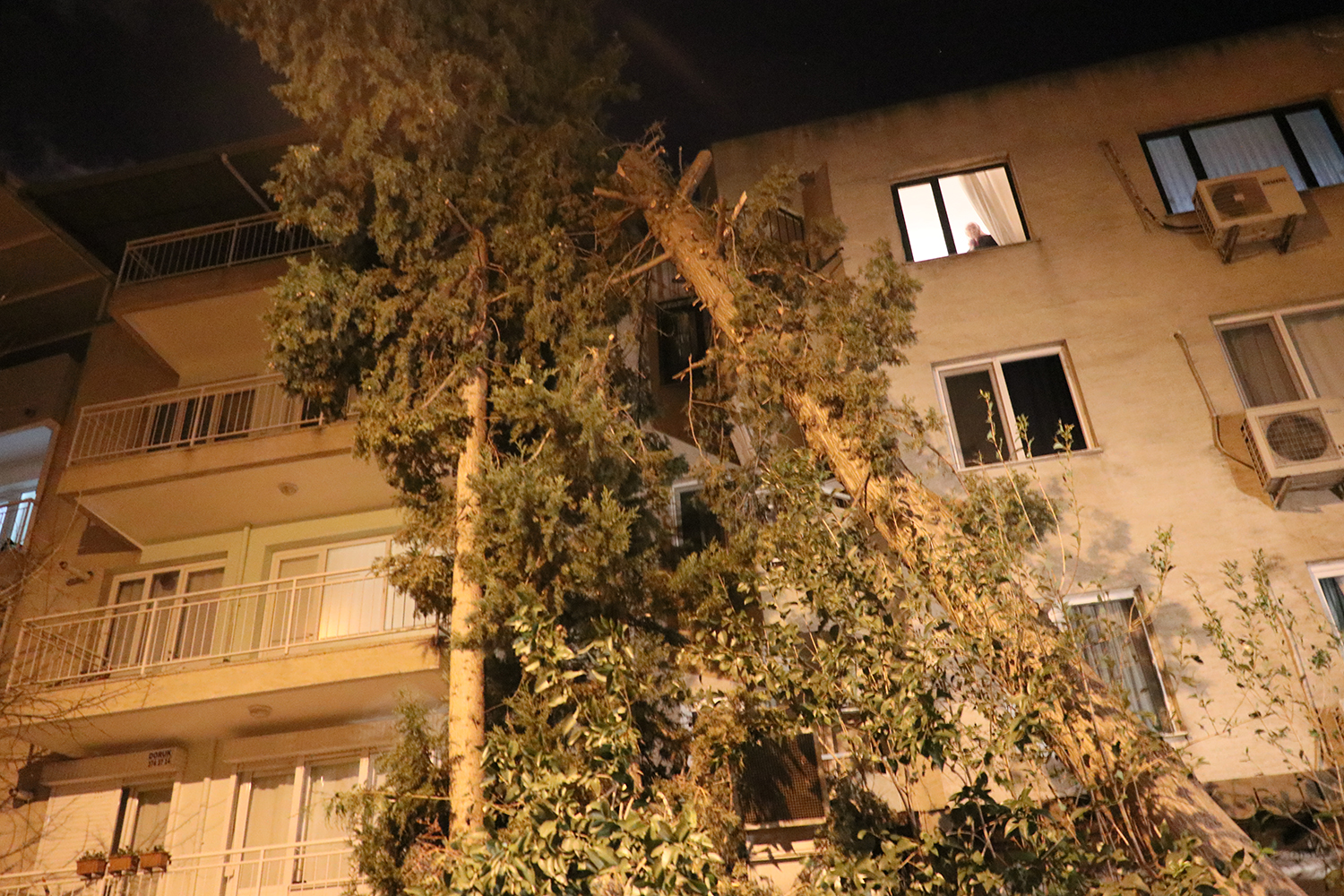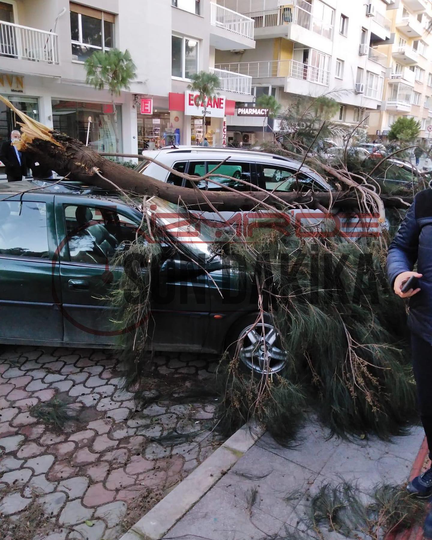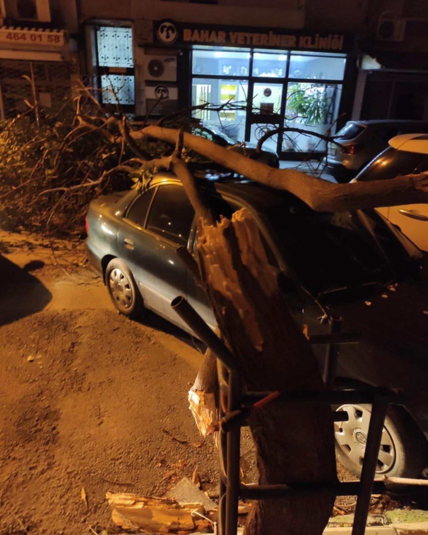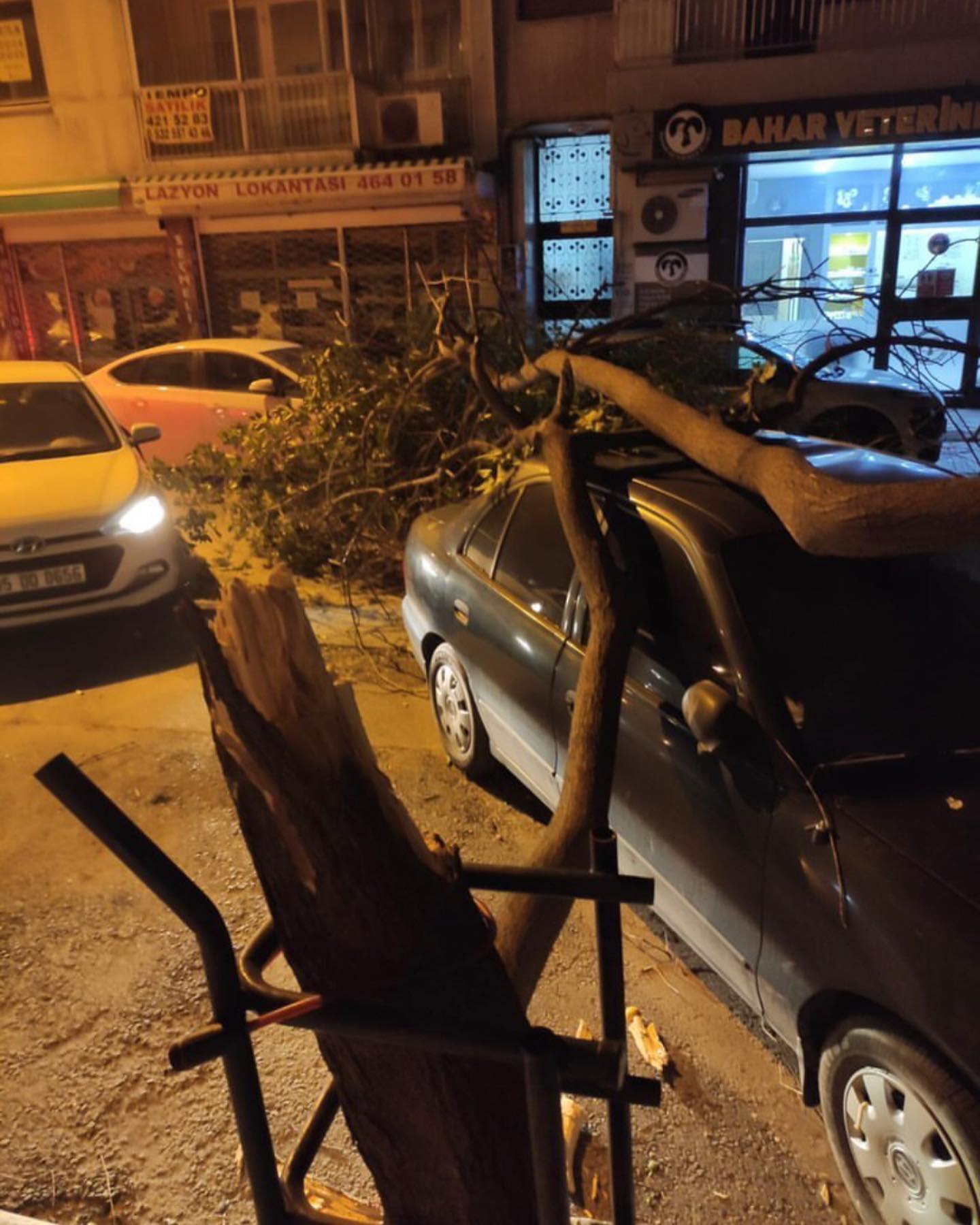 İzmir'de etkili olan fırtına nedeniyle ağaçlar devrildi, çatılar uçtu, tekneler alabora oldu.