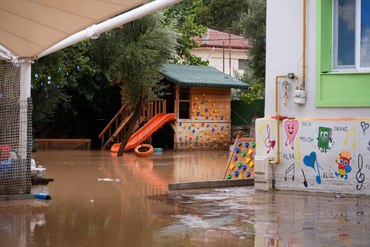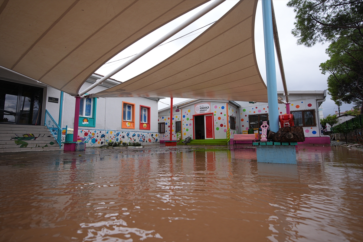 Yenifoça Anaokulu'nun çatısında hasar oluştu, yağış nedeniyle okulu su bastı. Öğrenciler, tedbiren tahliye edildi.