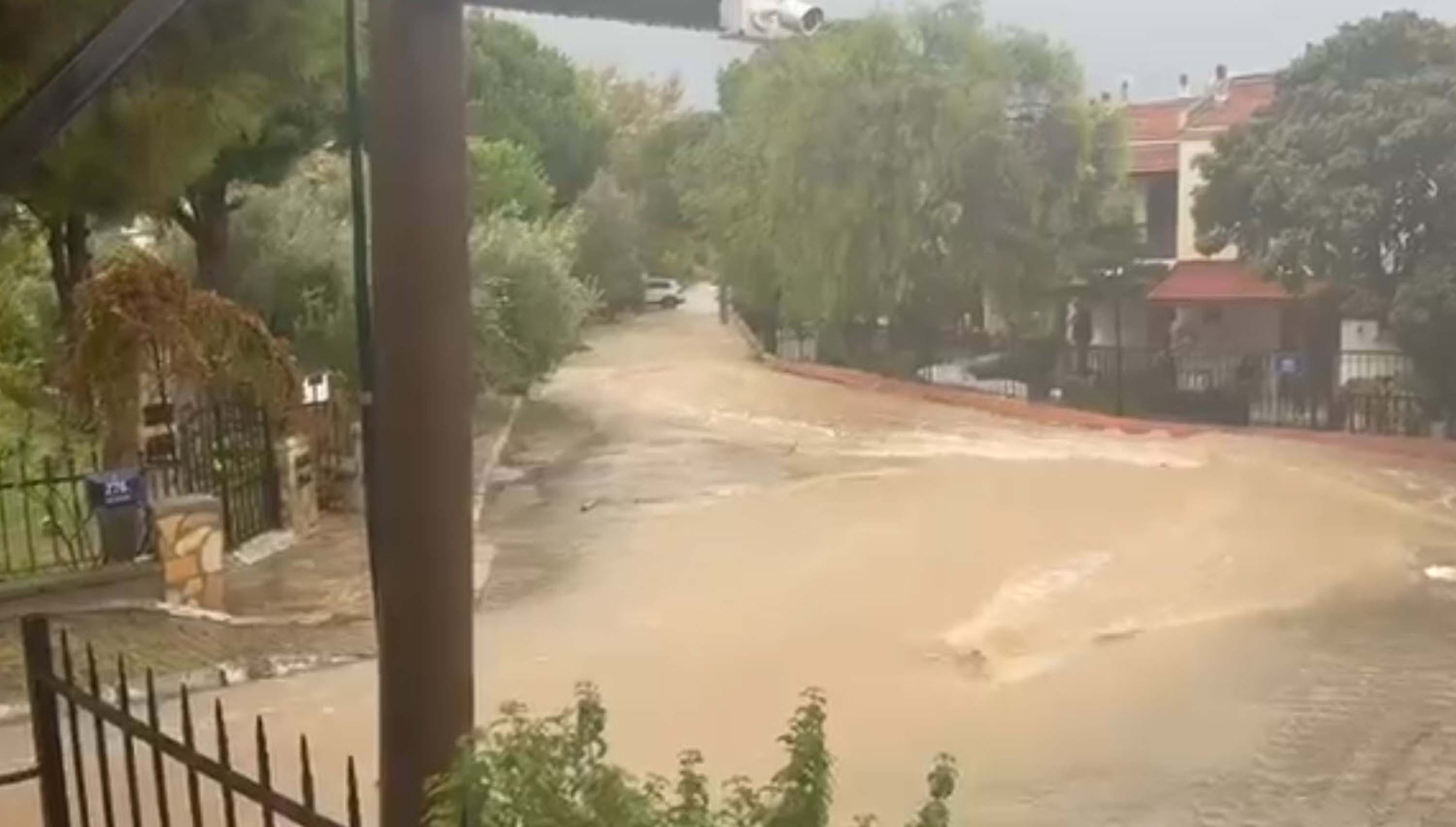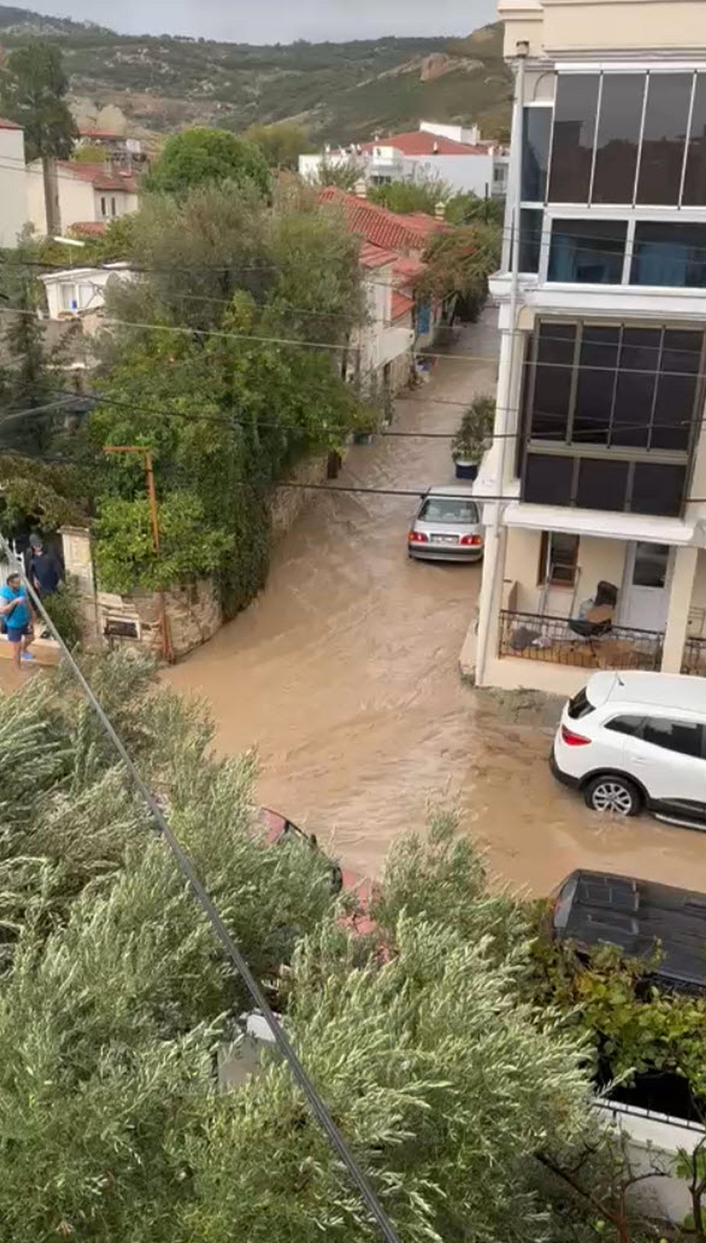 İzmir'in Foça ilçesinde etkili olan sağanak nedeniyle dere taştı, bazı ev ve iş yerlerini su bastı.