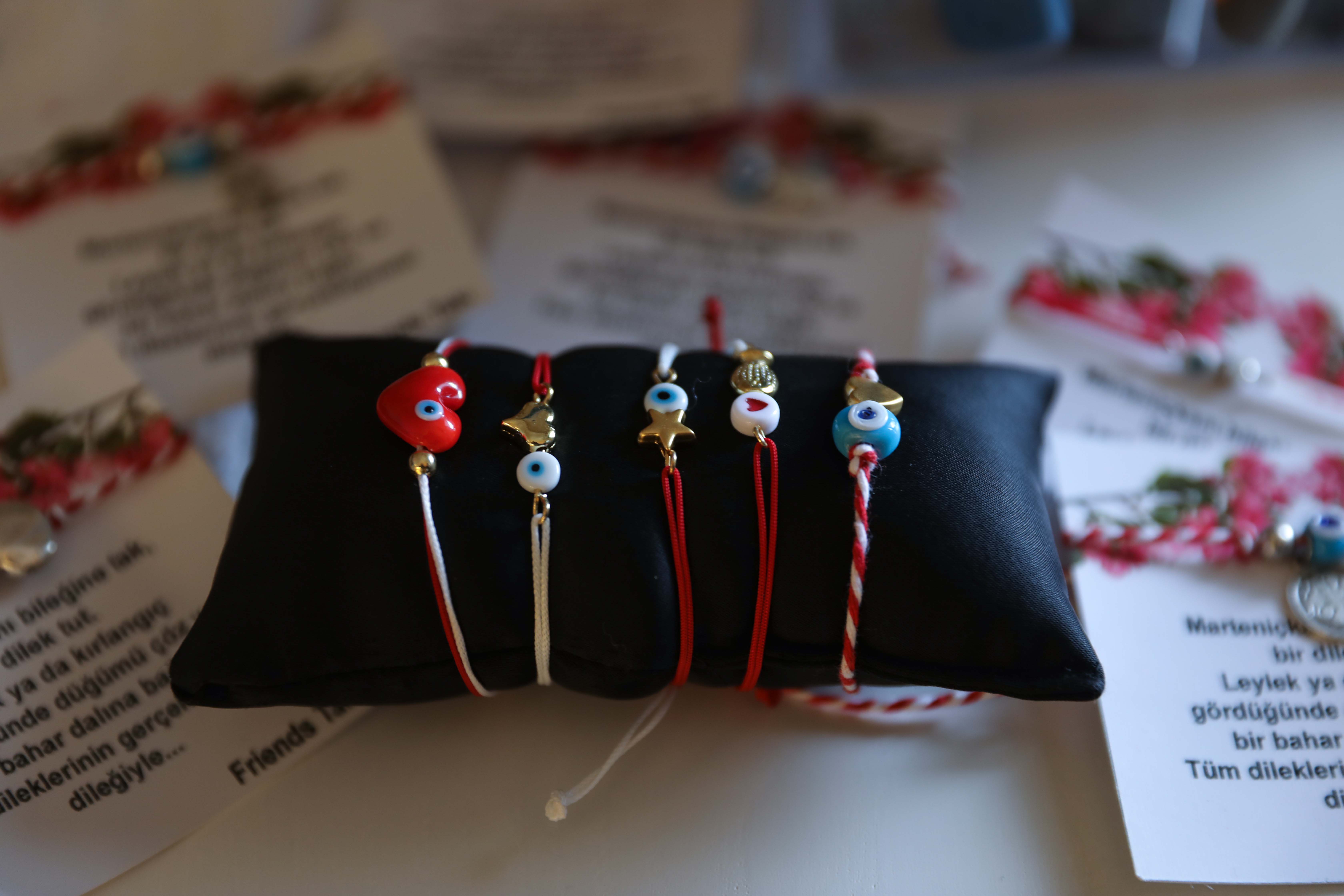 Marteniçka yapan takı tasarımcısı Demet Coşan da geleneğe uygun olarak kırmızı ve beyaz iplerle yapılan bilekliğe talebe göre kalp, yonca, fil gibi figürler de takılabildiğini, genellikle nazar boncuğuyla beraber tercih edildiğini dile getirdi.