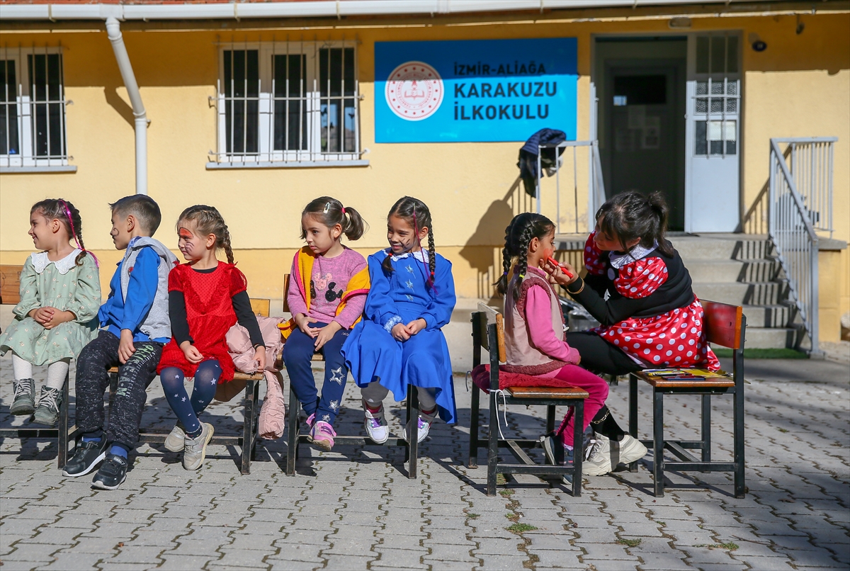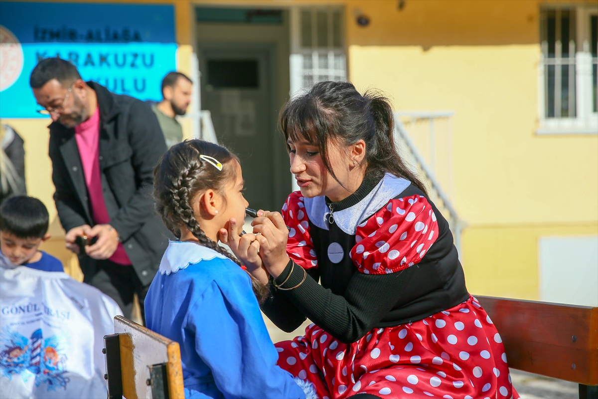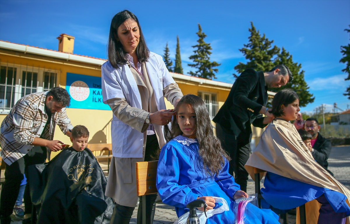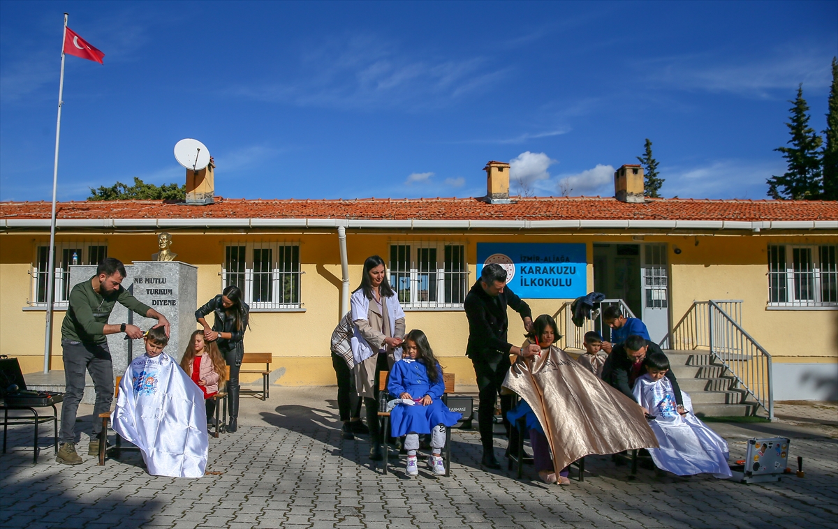 Bu kapsamda Aliağa ilçesine bağlı Karakuzu İlkokulu'na giden gönüllüler, miniklerle sohbet edip saçlarını kesti. Etkinlikte çocuklarla oyunlar oynandı ve kırtasiye, oyuncak ve kıyafetlerden oluşan hediyeler verildi.