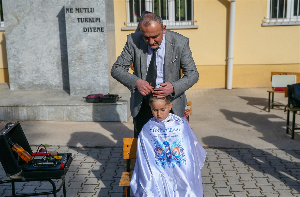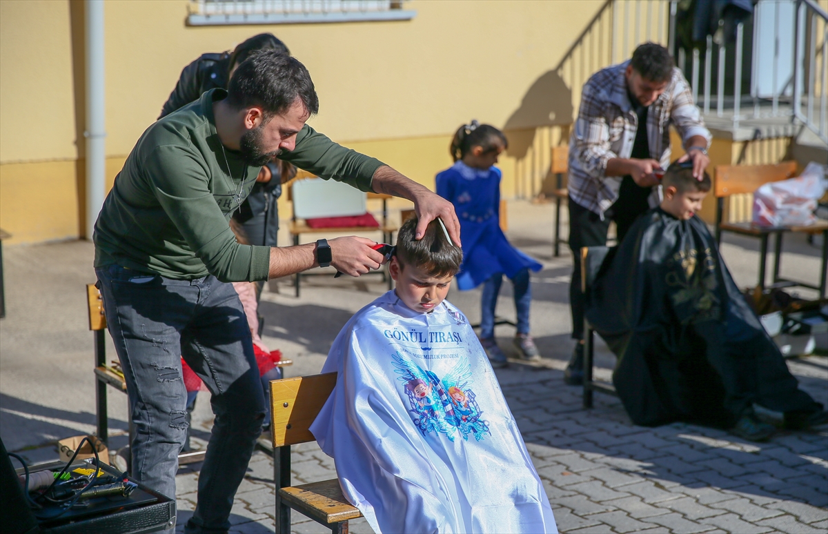 İzmir'de yürütülen "Gönül Tıraşı" projesi kapsamında Antalya, Isparta, Denizli, Uşak, Tekirdağ, Bursa ve Balıkesir'den kuaförler, kırsal mahalleleri gezerek çocukların saçlarını kesip hediyeler dağıtıyor.