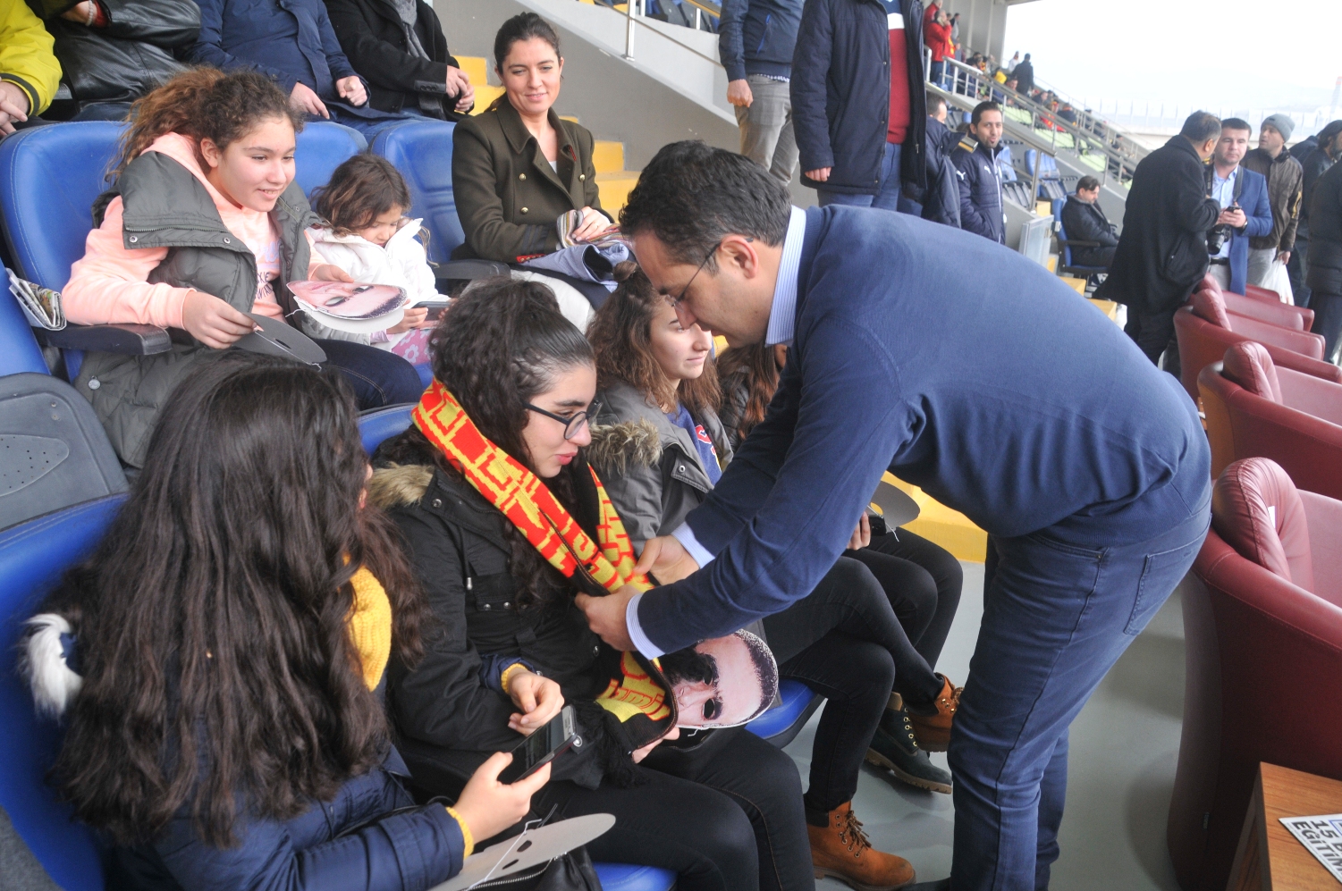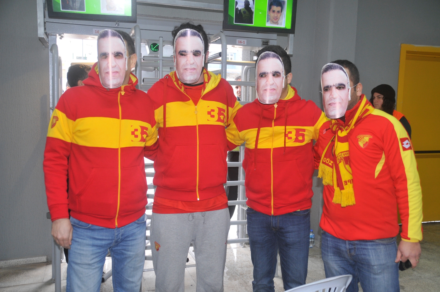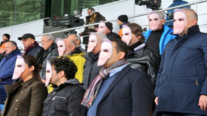 Bornova Başkanı Olgun Atila ve Göztepe Başkanı Mehmet Sepil’in bulunduğu protokol tribününde herkes kahramanın maskesini taktı.