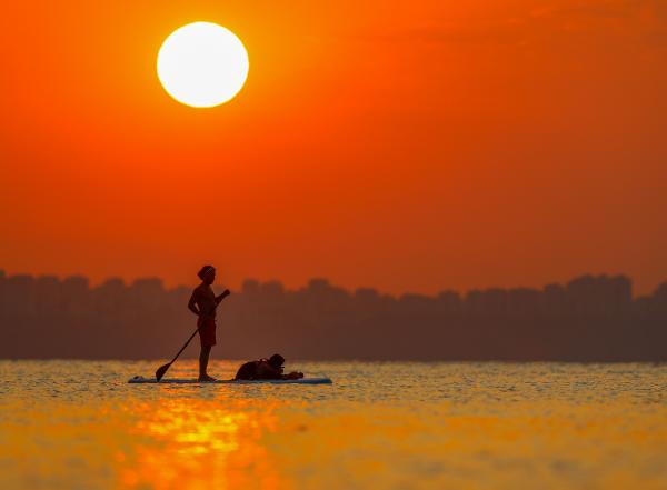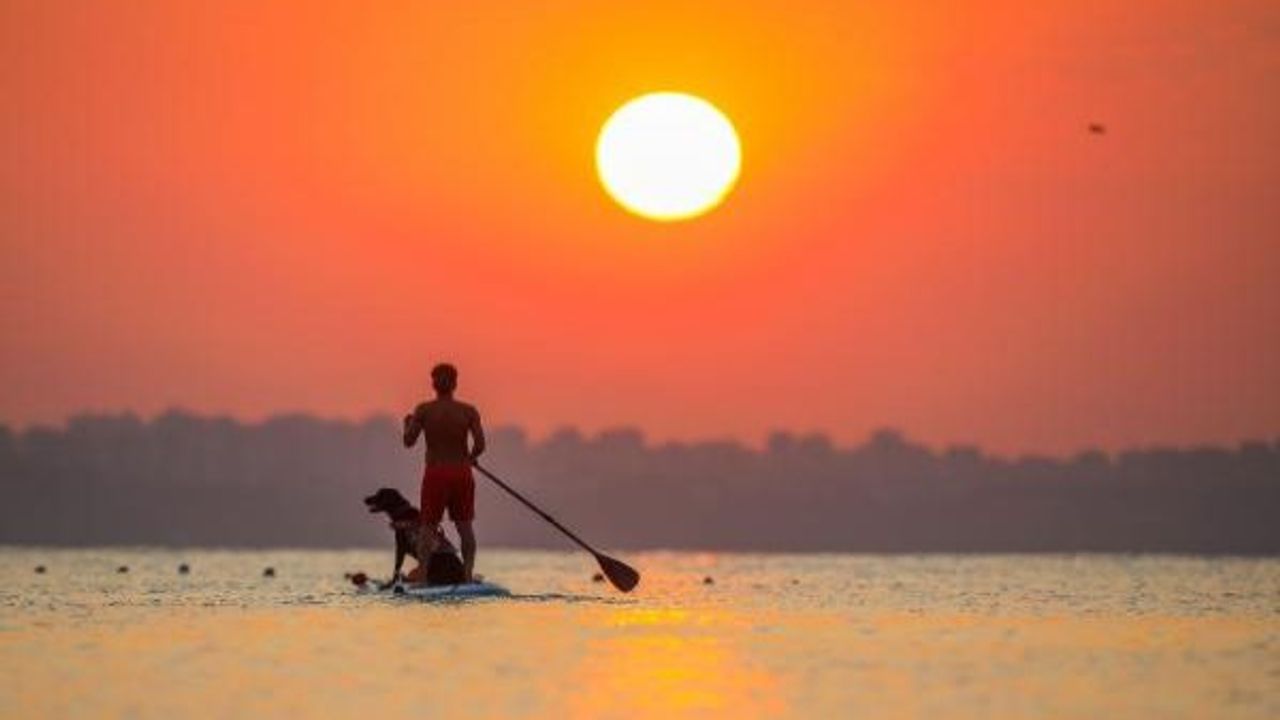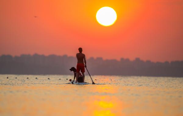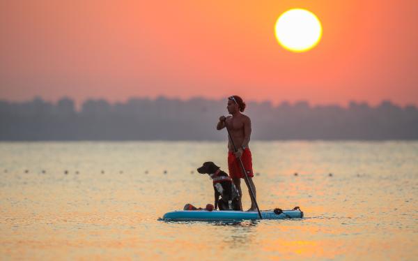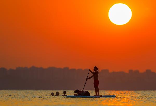 Antalya'da cankurtaran Tayfun Güneysulu (42), her sabah gün doğumunda köpekleriyle birlikte kürek sörfü antrenmanı yapıyor.