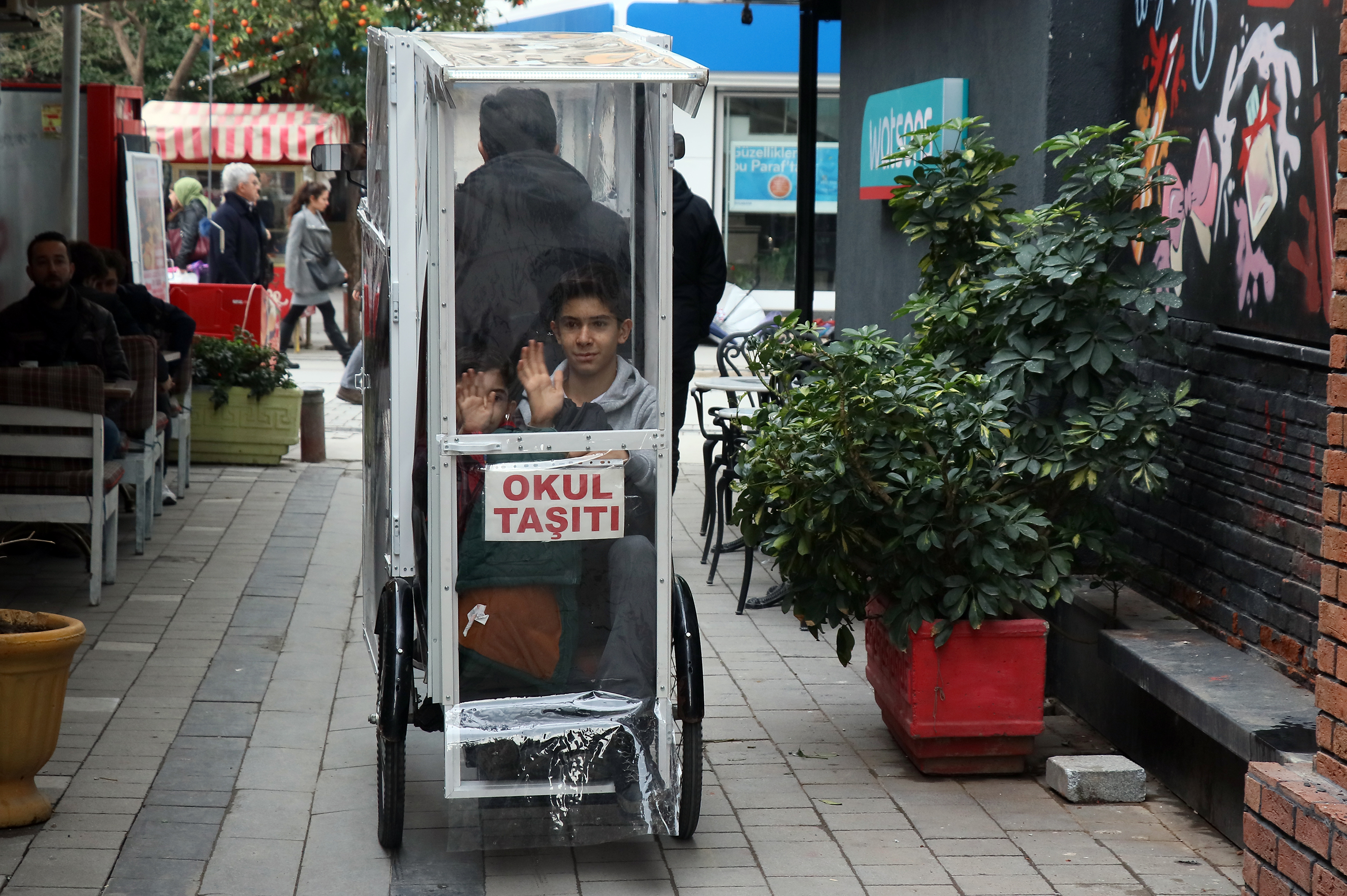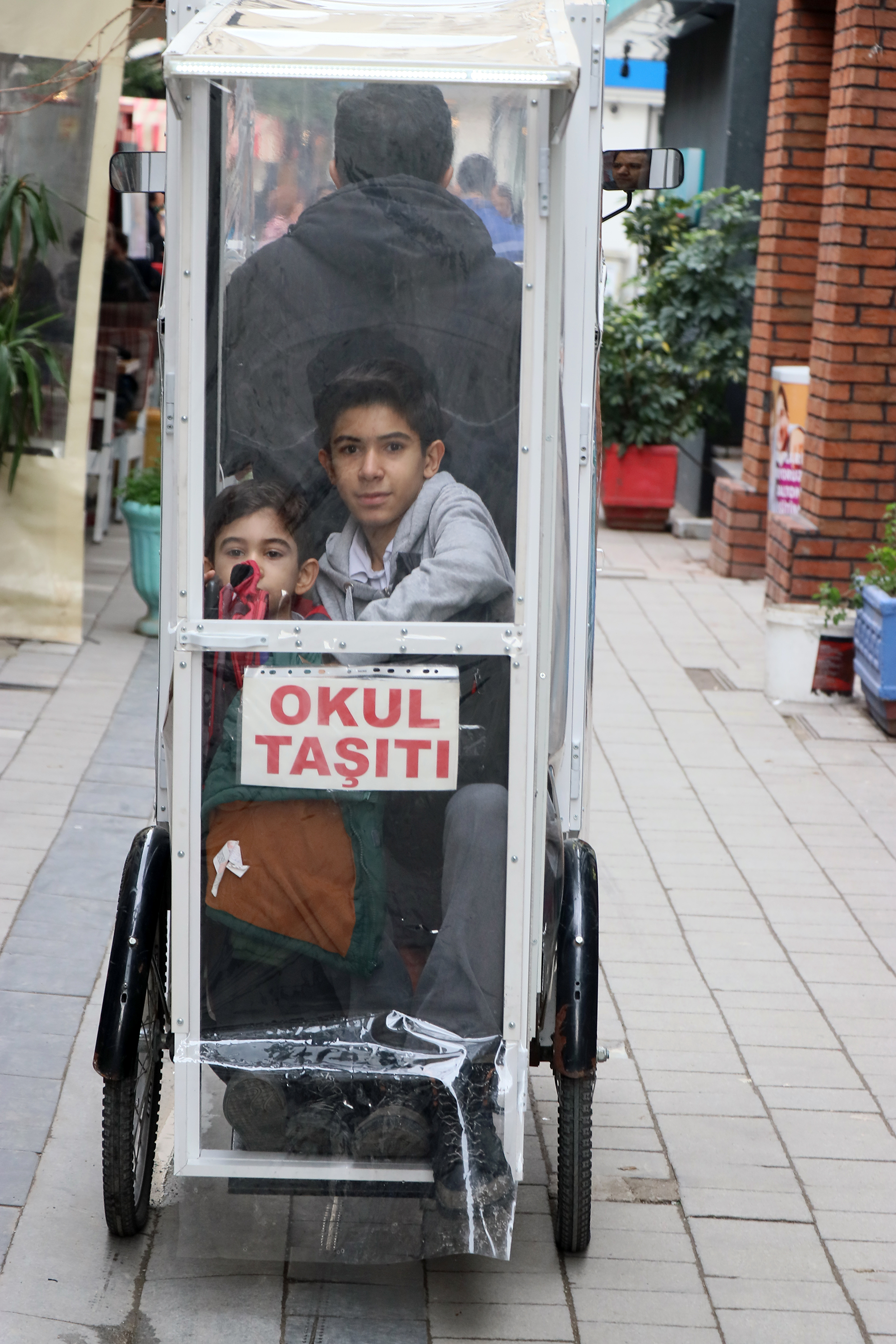 Emrah Özkılıçaslan'ın 14 yaşındaki oğlu Ali Özkılıçaslan da babasının yaptığı "okul taşıtı"nın yağmurlu ve soğuk günlerde işlerine yaradığını dile getirdi.