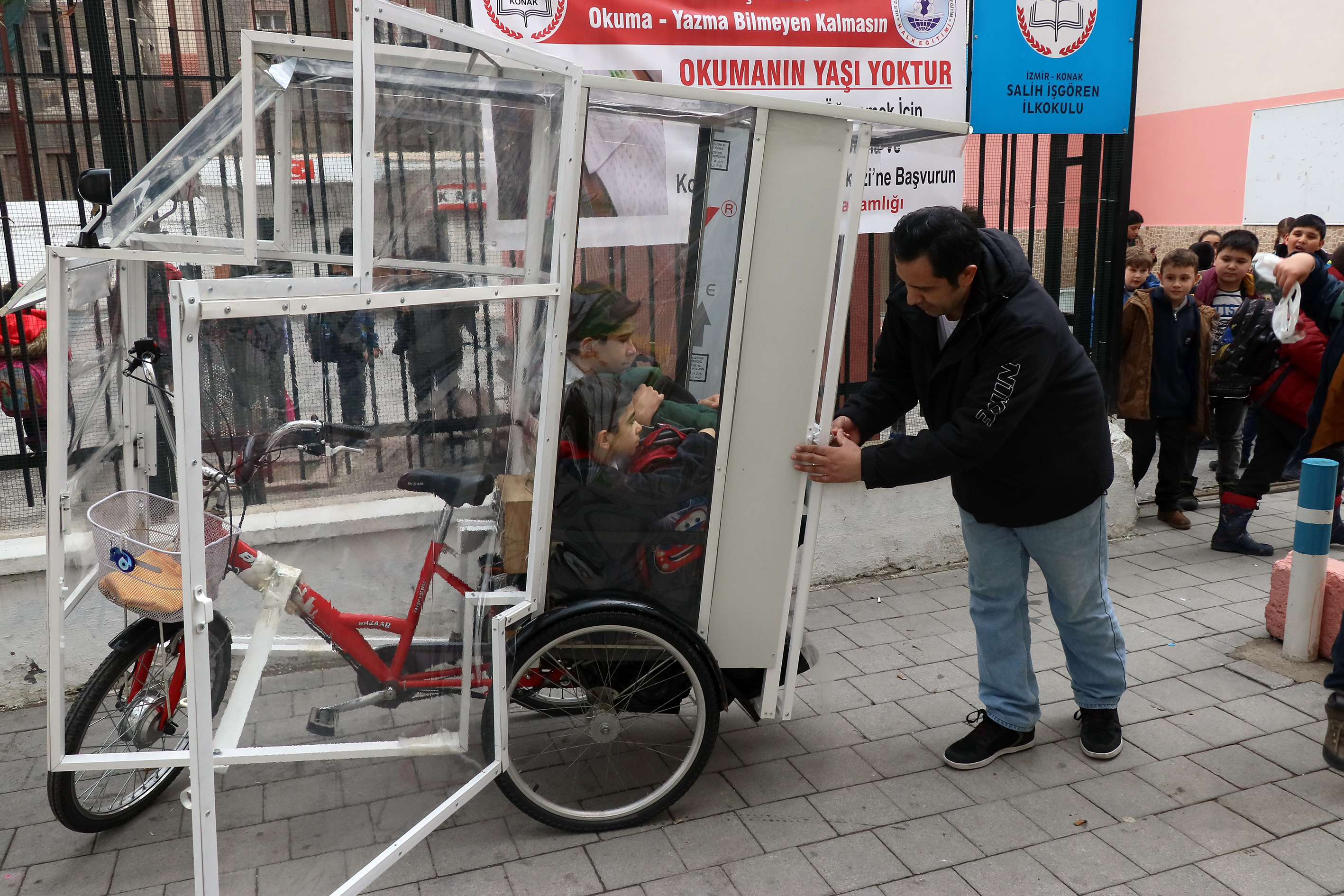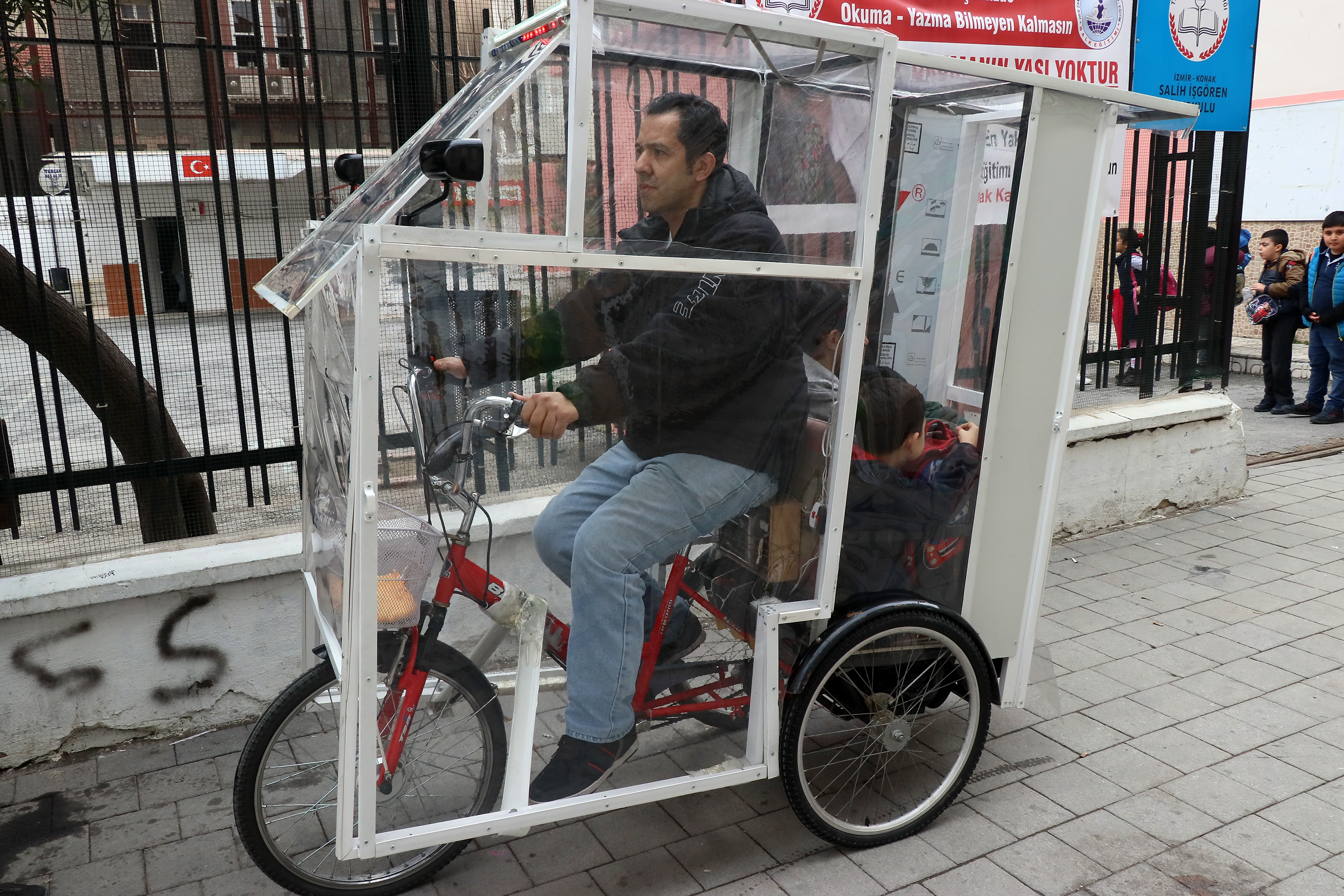 İzmir'de yaşayan Emrah Özkılıçaslan, 2 çocuğunu, üstünü alüminyum doğramayla, etrafını şeffaf naylonla kapattığı üç tekerlekli bisikletle okula götürüp getiriyor.