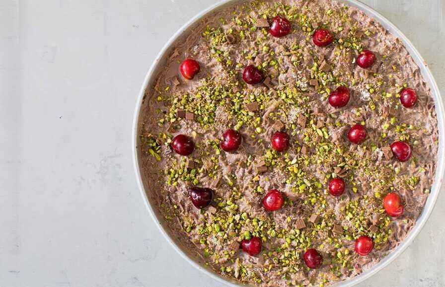 Güzel renkli ve bütün olanları üstü için saklayın. 6 kat daha yaptıktan sonra kalan çikolataları, fıstıkları, Hindistan cevizini ve kirazları yerleştirip dolapta 1-2 saat soğumaya bırakın.