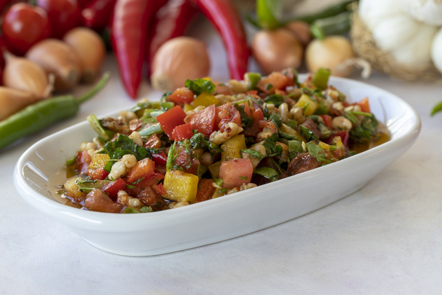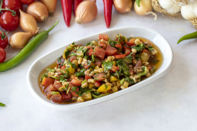 Domates, biber ve salatalıkları mümkün olduğunca küçük küpler halinde doğrayın. Gavurdağı salatasının özelliği malzemelerin ufak doğranmasıdır.