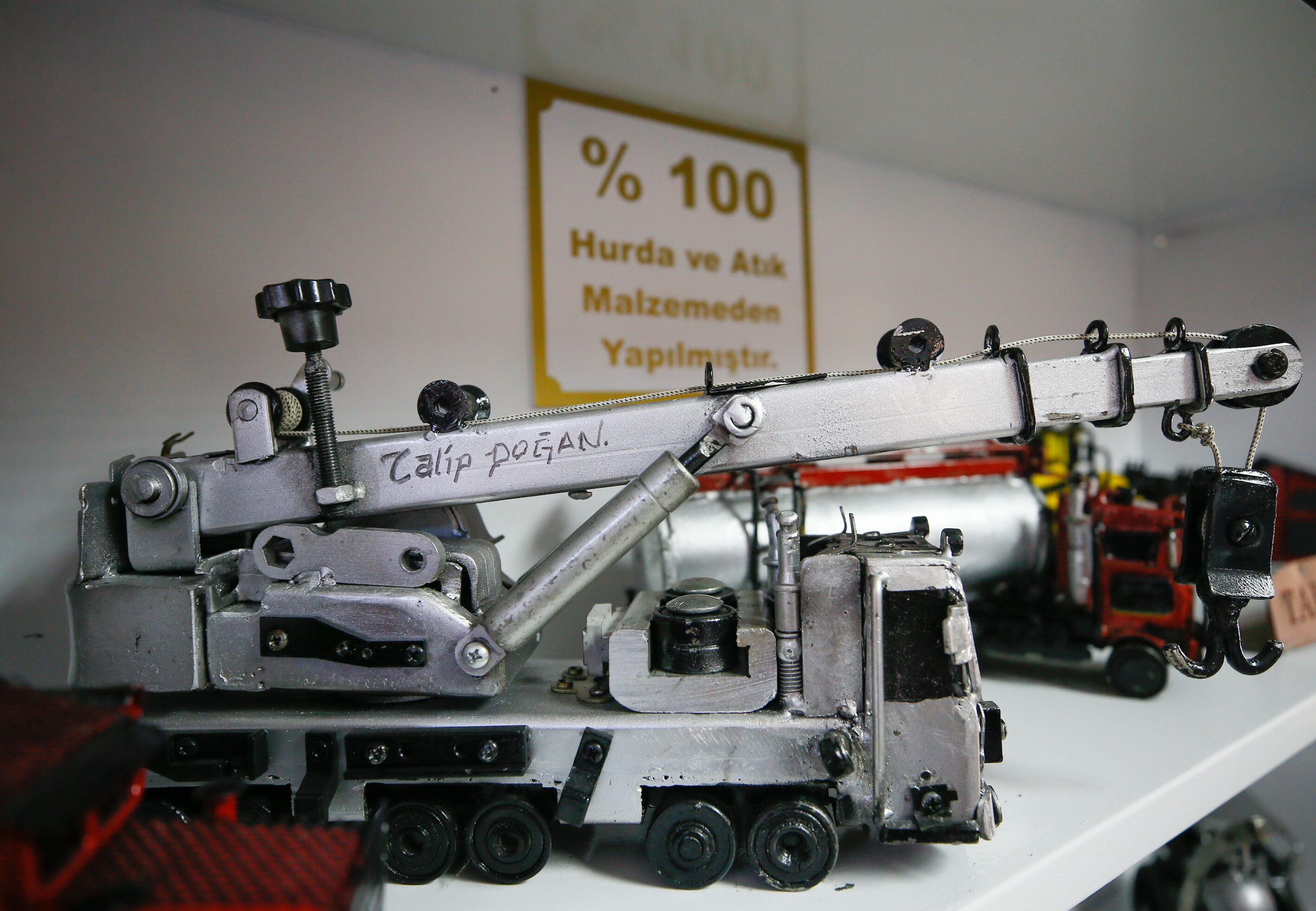 İzmir'de Sağlık Bilimleri Üniversitesi (SBÜ) İzmir Bozyaka Eğitim ve Araştırma Hastanesinde teknik eleman olarak çalışan Talip Doğan'ın hastanede hurdaya çıkan malzemelerden yaptığı iş makineleri, helikopter, motosiklet ve uçak gibi minyatür oyuncaklar, hastanede özel olarak sergileniyor.