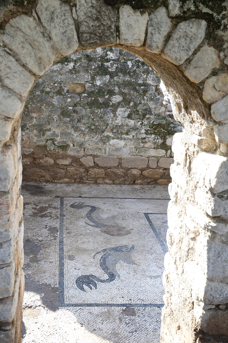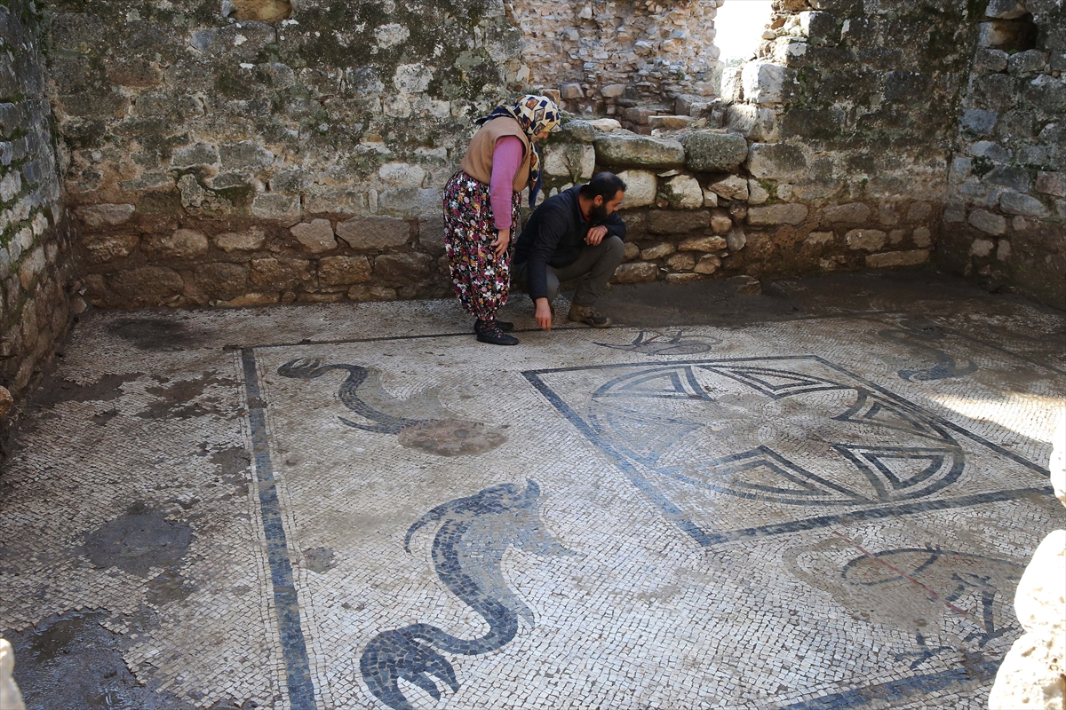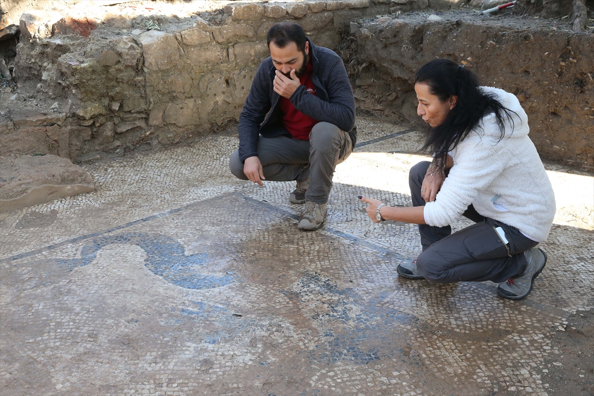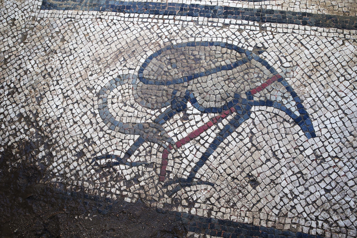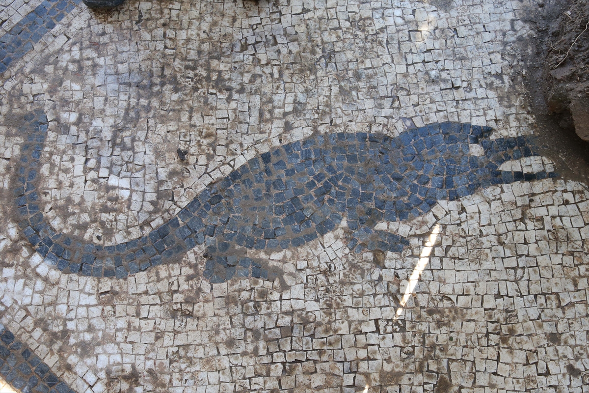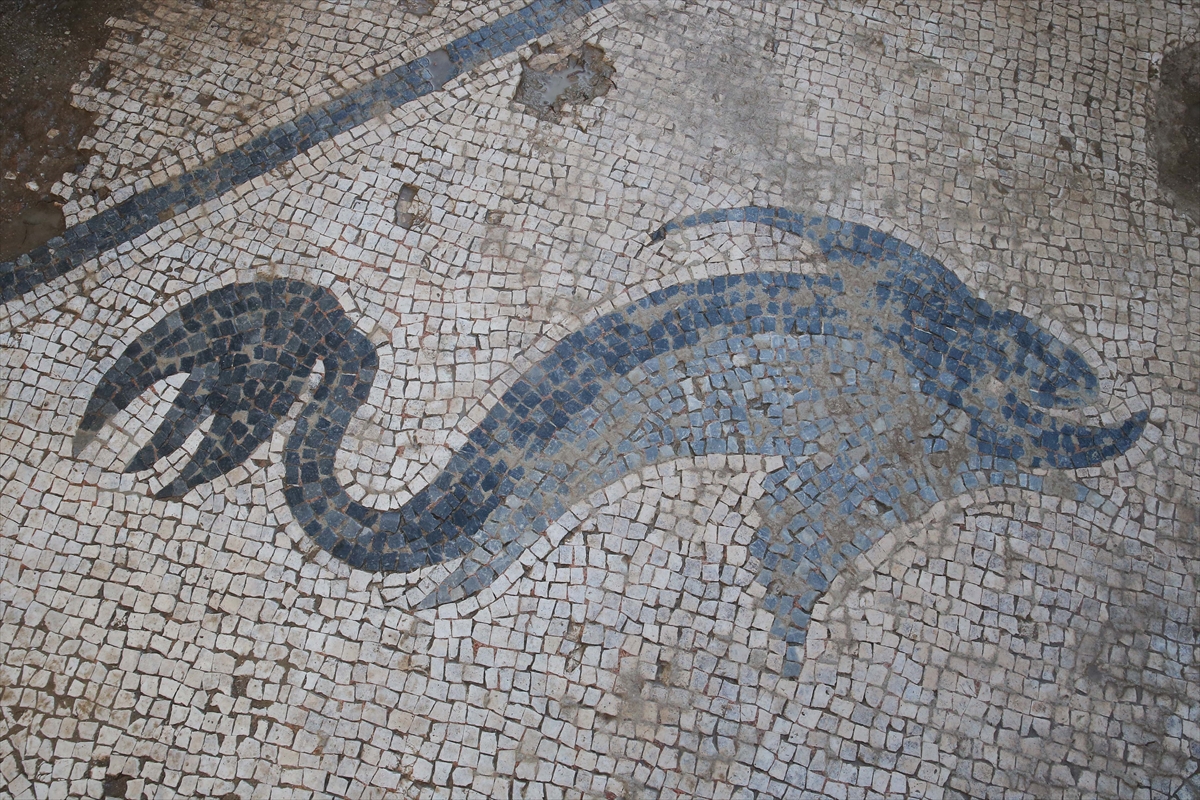 Hamamdaki ısı kaybını önlemek için yapılan ılık mekanda da yine sağlam korunmuş bir mozaik tabanının açığa çıkarıldığını kaydeden Büyüközer, "Burada ise köşelere yerleştirilmiş 4 yunusun arasında flamingolar ve enteresan flamingoların ağzında da kırmızı renkli taşlardan yapılmış yılan balıkları var. Yılan balığı bu coğrafya için çok önemli bir hayvan. Flamingolar da hala günümüzde bu alanda yaşamaya devam eden kuş türlerinden. Aslında sanatçı burada coğrafyada gördüğü hayvanları resmetmiş." diye konuştu.