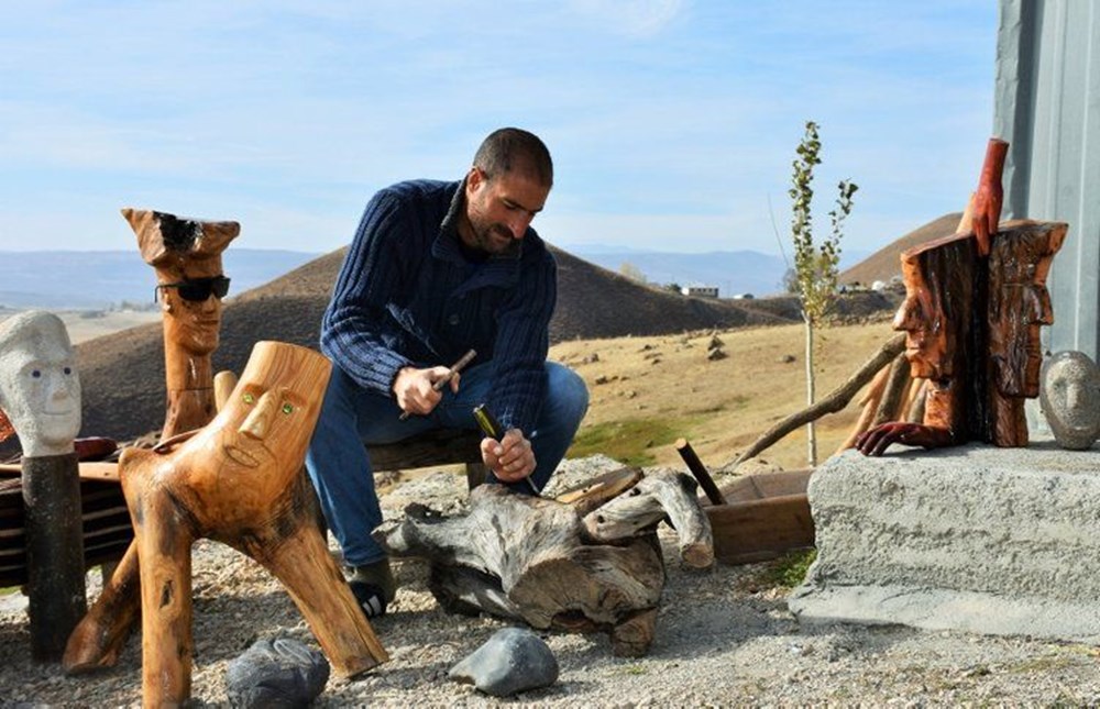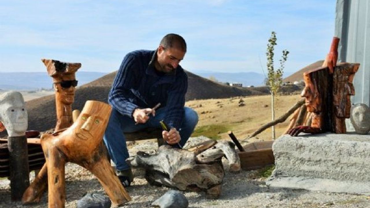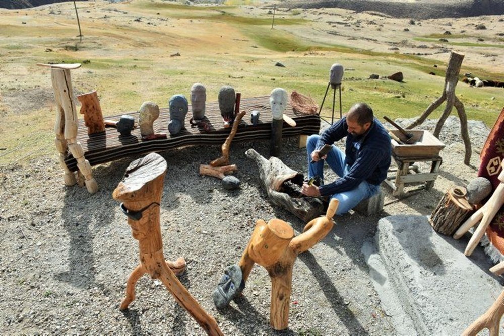 Koyunları otlatırken aynı zamanda taş ve ağaçları birer sanat eserine dönüştüren Yalçın, yeterli sayıda heykel yaparak köyde ilk sergisini açmanın hayalini kuruyor.