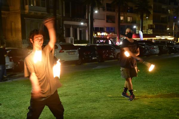 İzmirlilerin sıkça uğradığı Alsancak Kordon, dün akşam saatlerinde ilginç bir gösteriye ev sahipliği yaptı. Yiğit Gürbüz'ün ateş topları ile yaptığı tehlikeli dans, görenleri hayrete düşürdü. Birçok vatandaşın cep telefonları ile görüntülediği ateş dansı, renkli karelere sahne oldu.