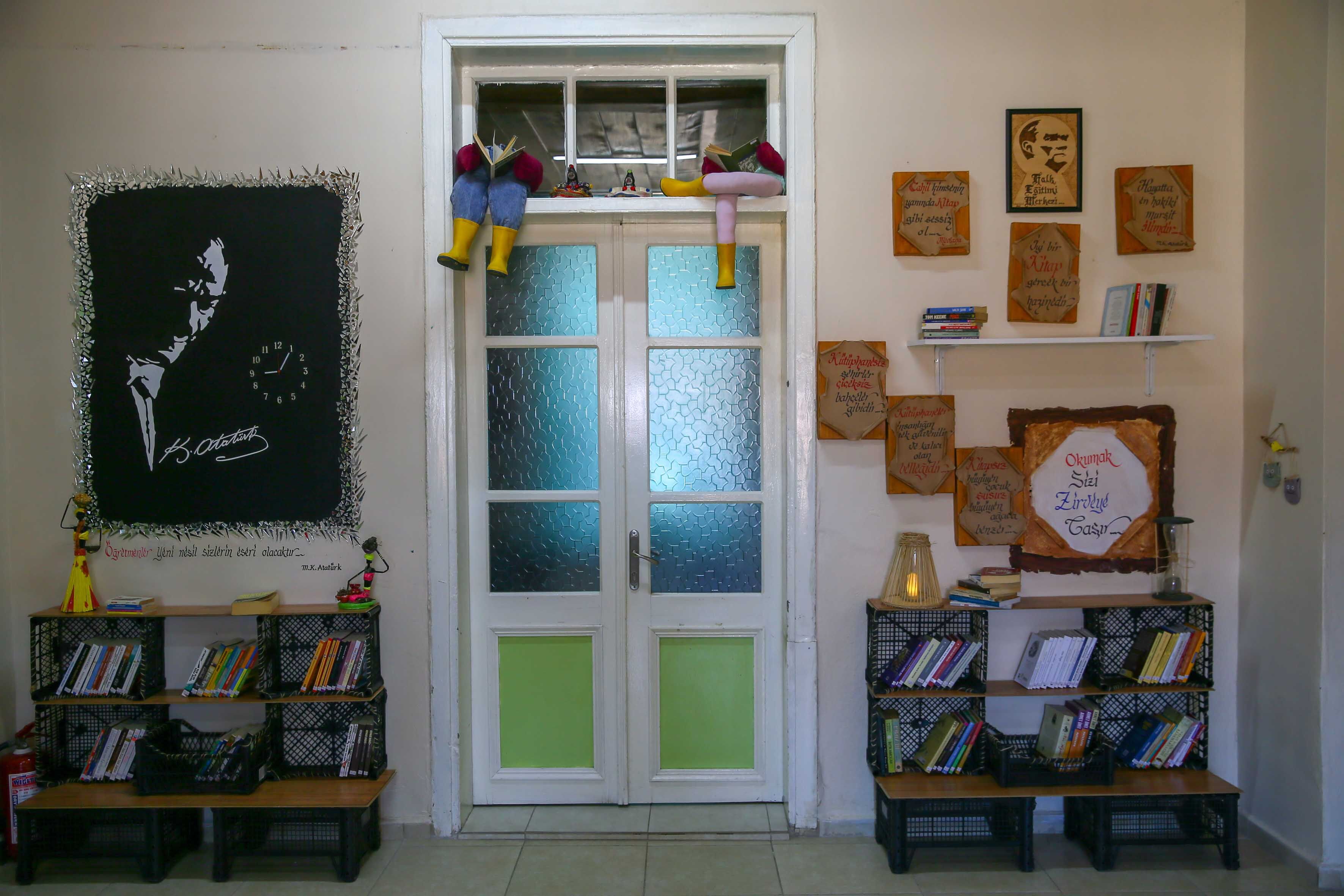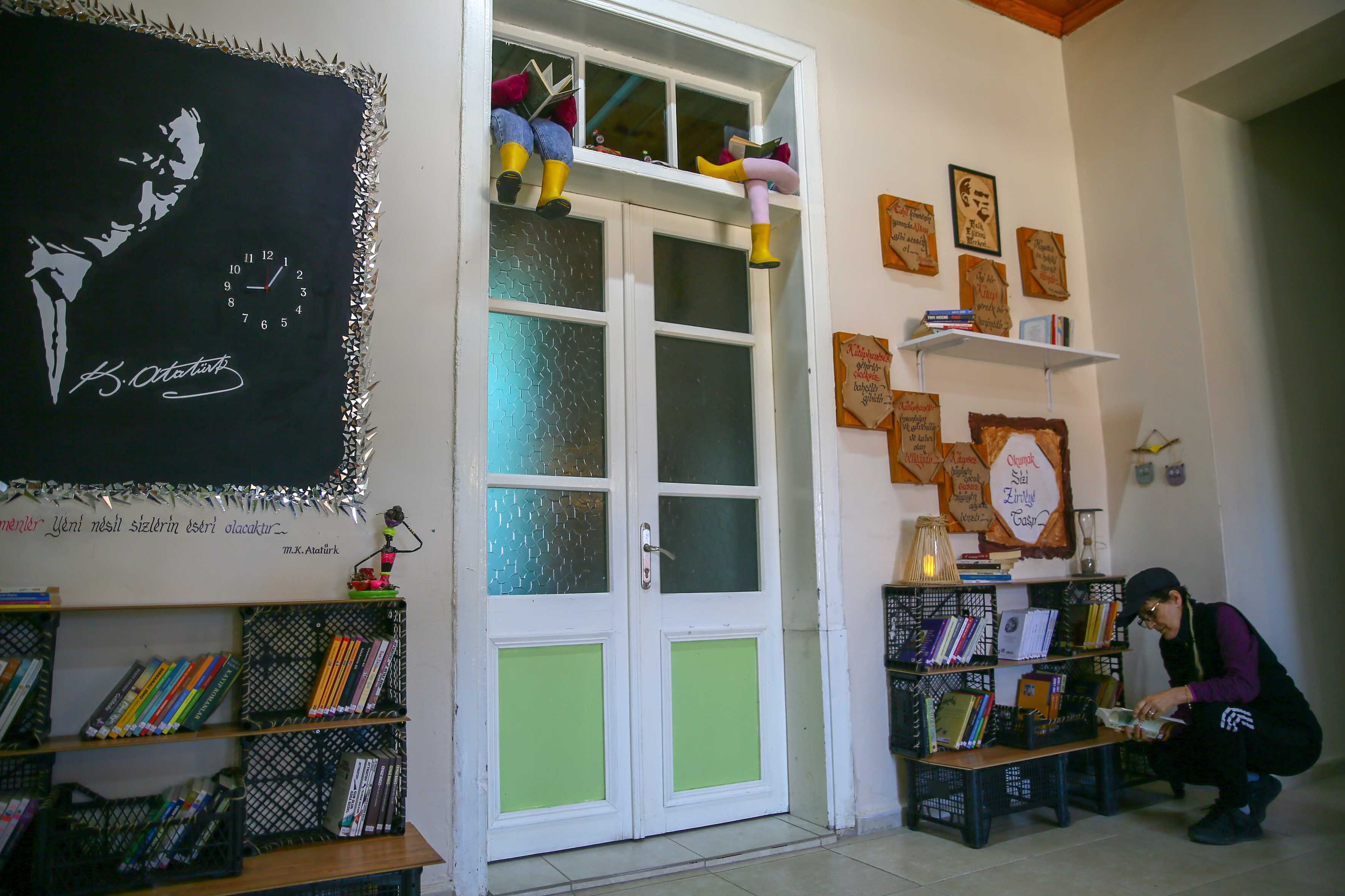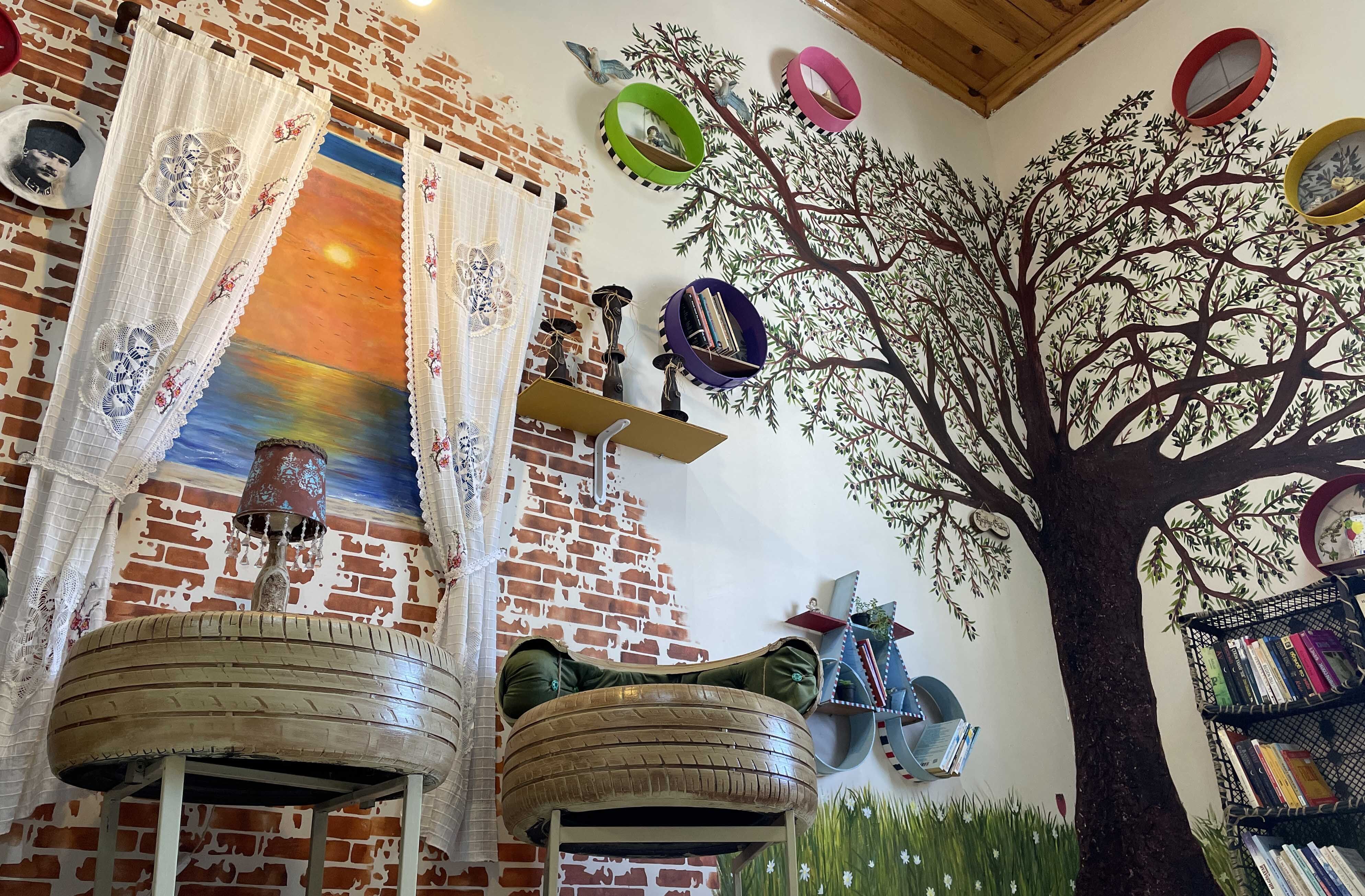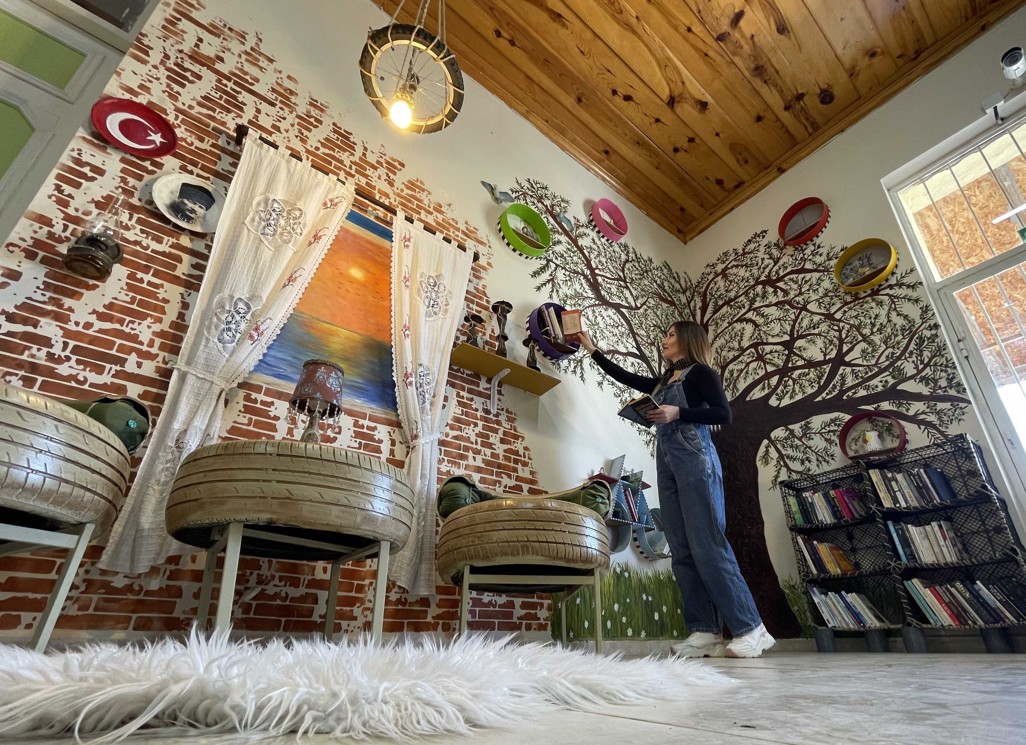 İlçedeki tarihi yapılar arasında yer alan Halk Eğitim Merkezi'ne girenleri, meyve kasalarından raflar, araç lastiklerinden oturma grupları, ayakkabıdan kalemlikler, gazoz şişelerinden tablolar, bisiklet lastiğinden avizeler ve rengarenk duvarlarıyla "Sıfır Atık Kütüphanesi" karşılıyor.