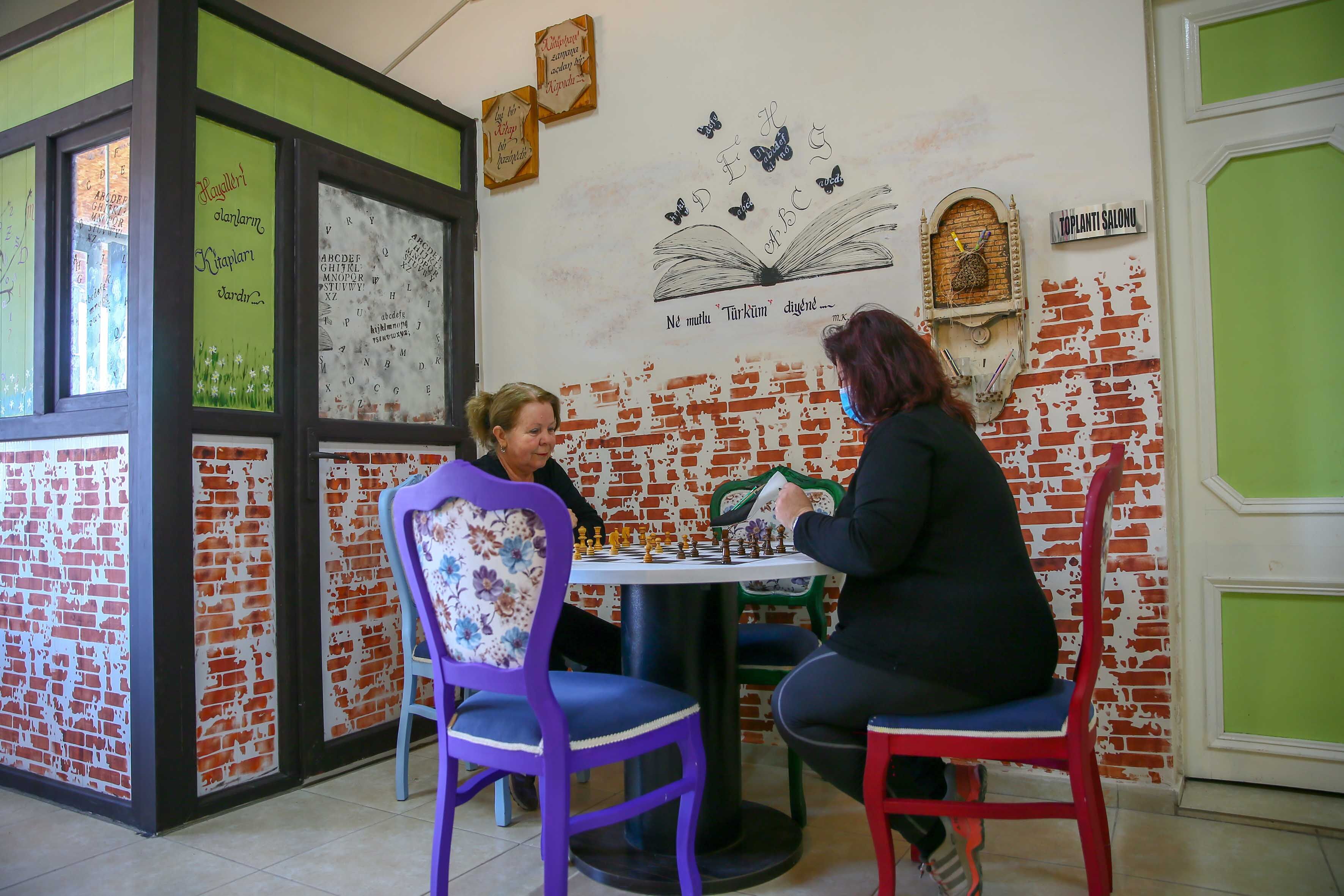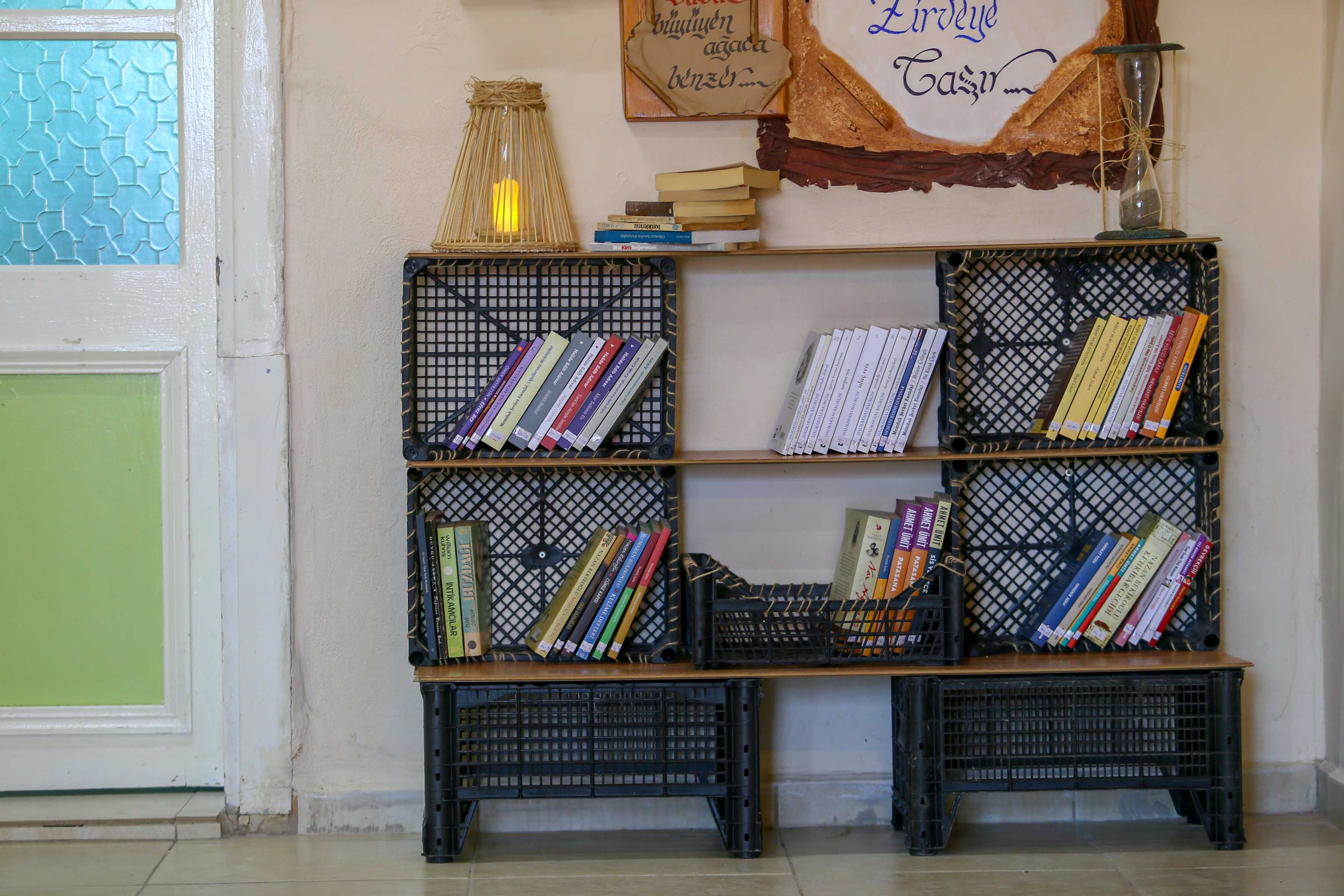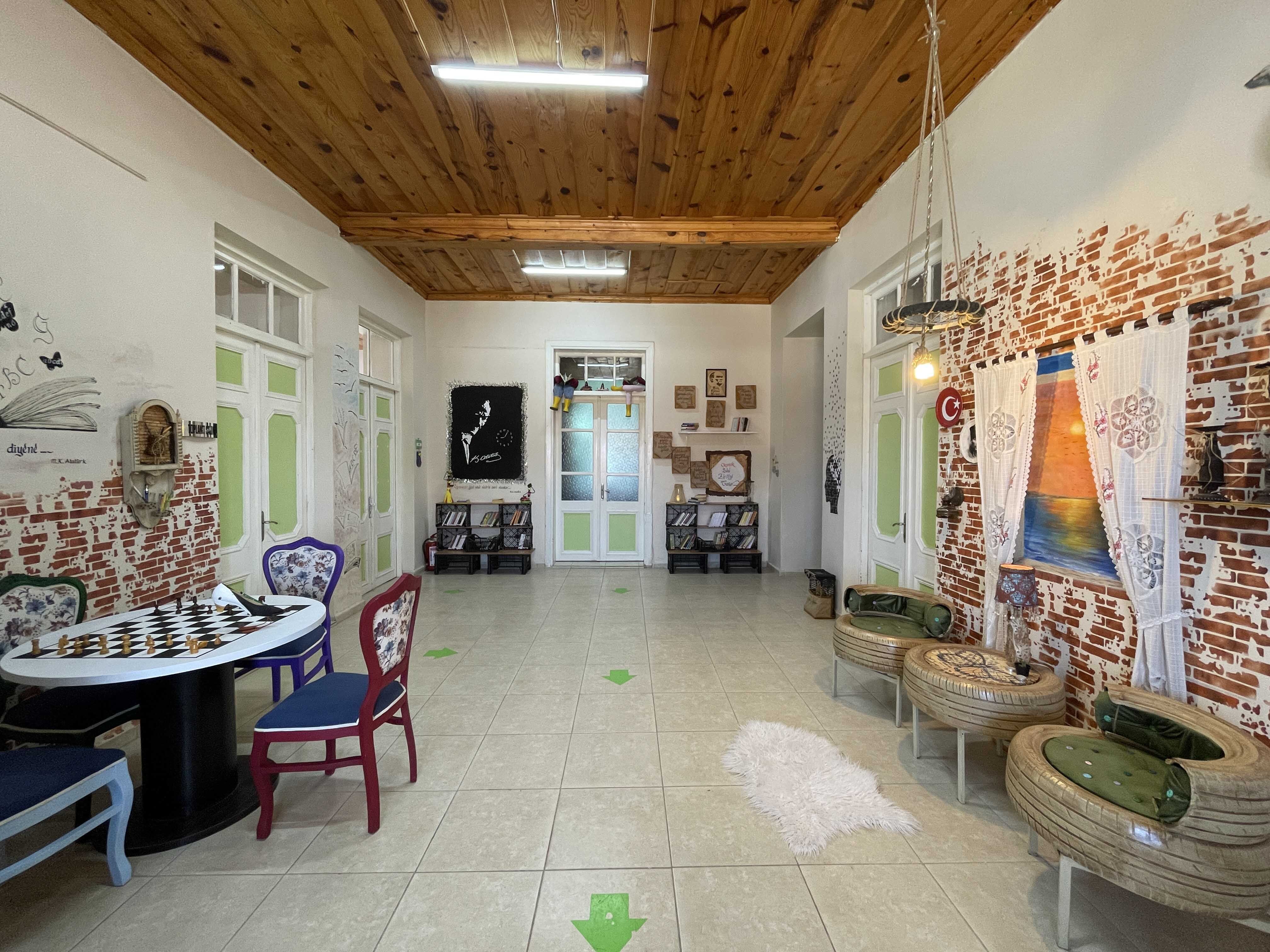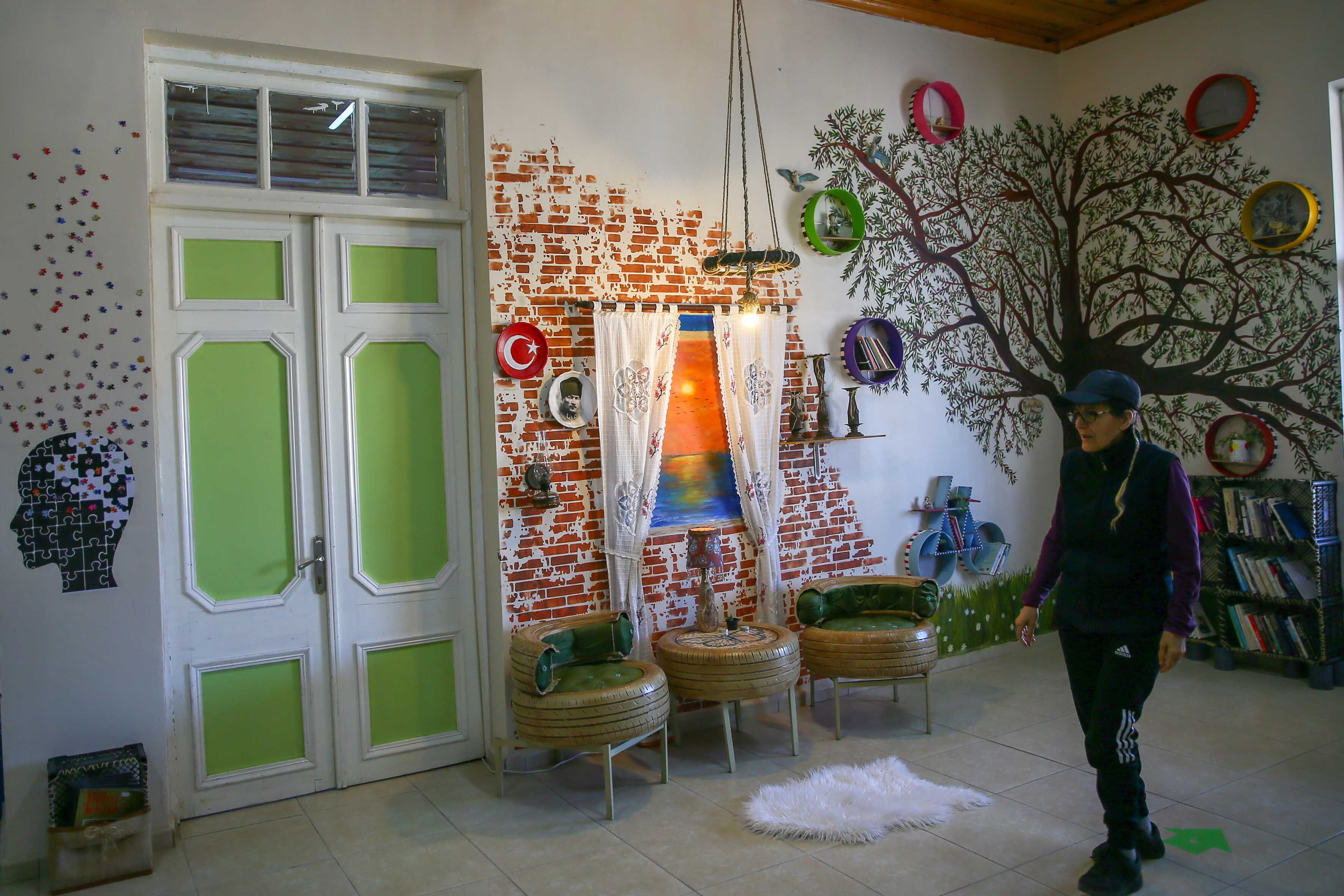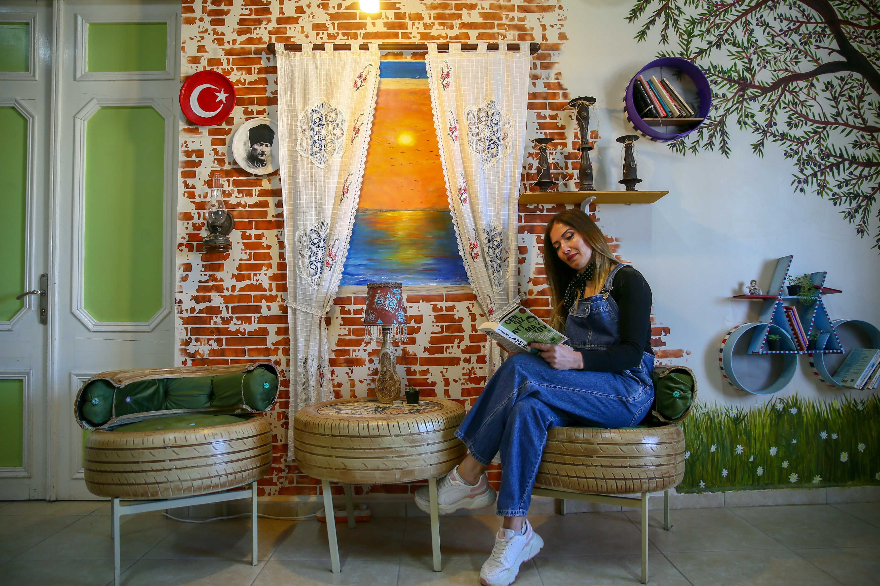 İlçedeki tarihi yapılar arasında yer alan Halk Eğitim Merkezi'ne girenleri, meyve kasalarından raflar, araç lastiklerinden oturma grupları, ayakkabıdan kalemlikler, gazoz şişelerinden tablolar, bisiklet lastiğinden avizeler ve rengarenk duvarlarıyla "Sıfır Atık Kütüphanesi" karşılıyor.