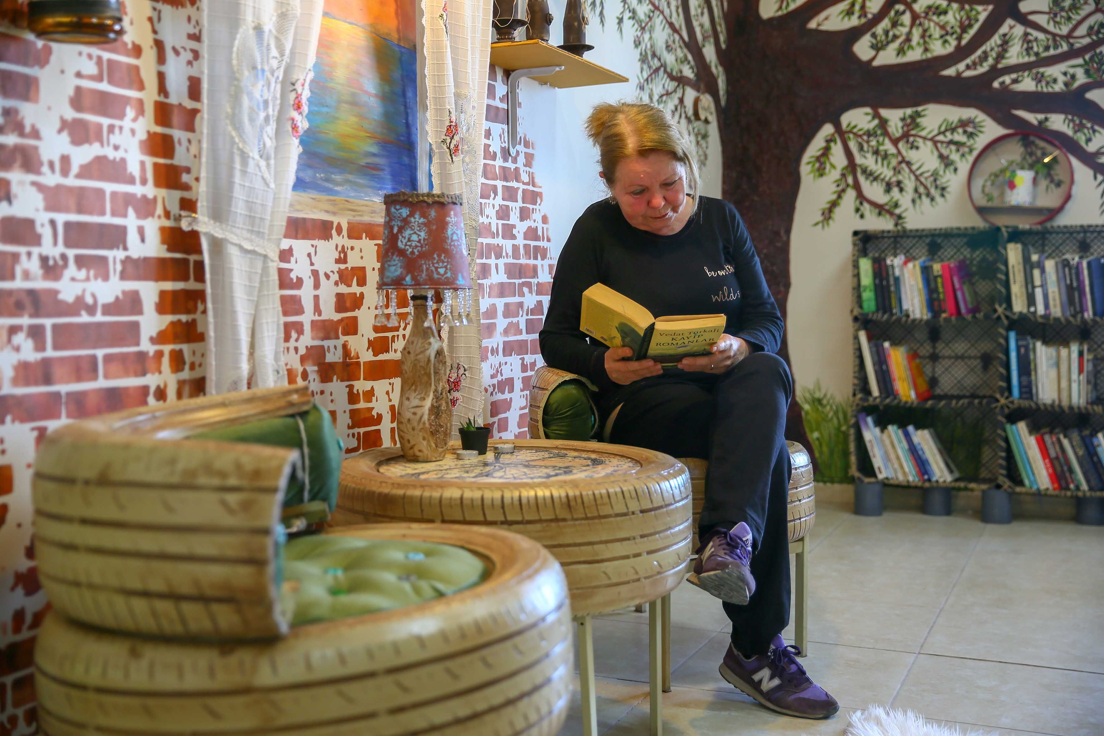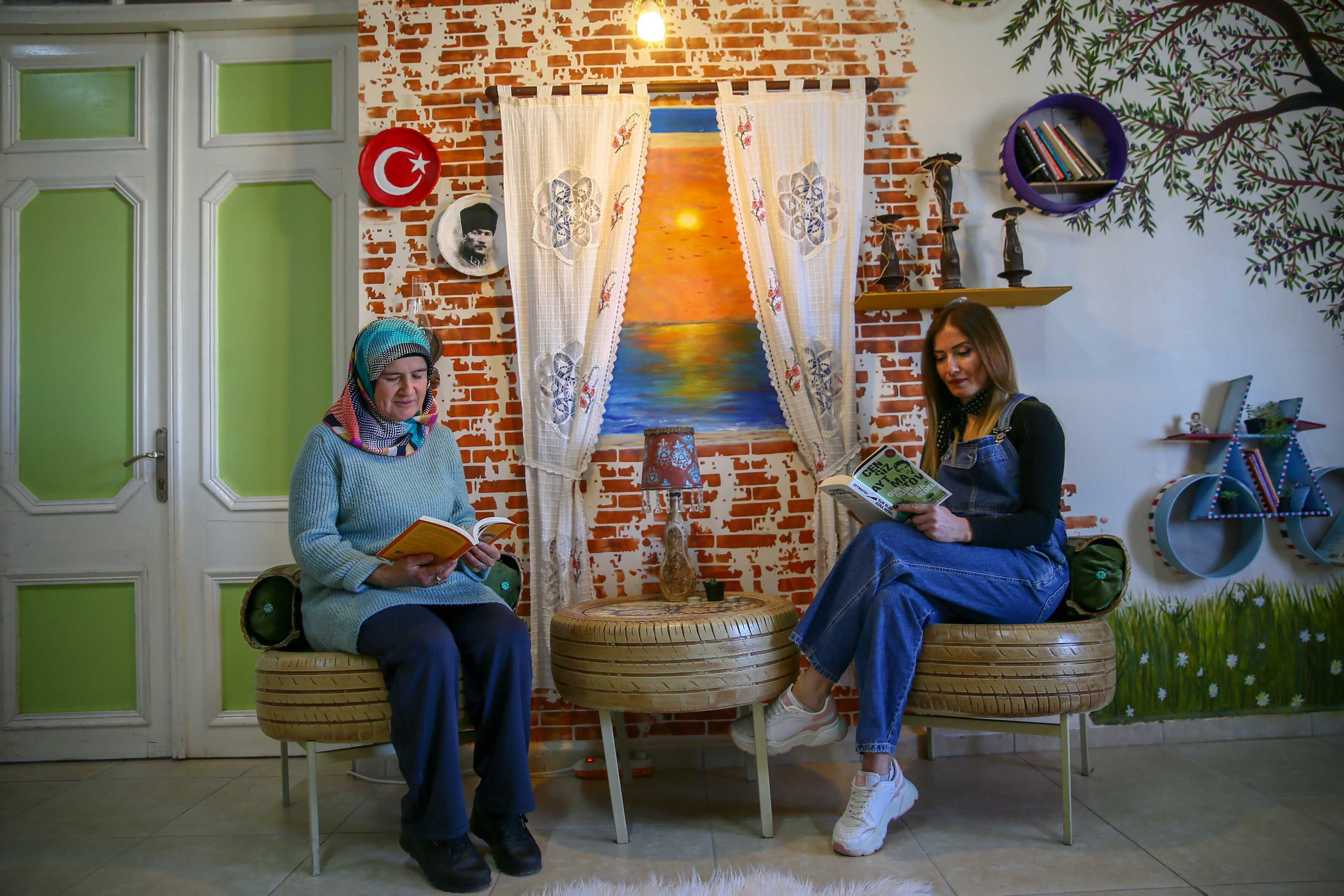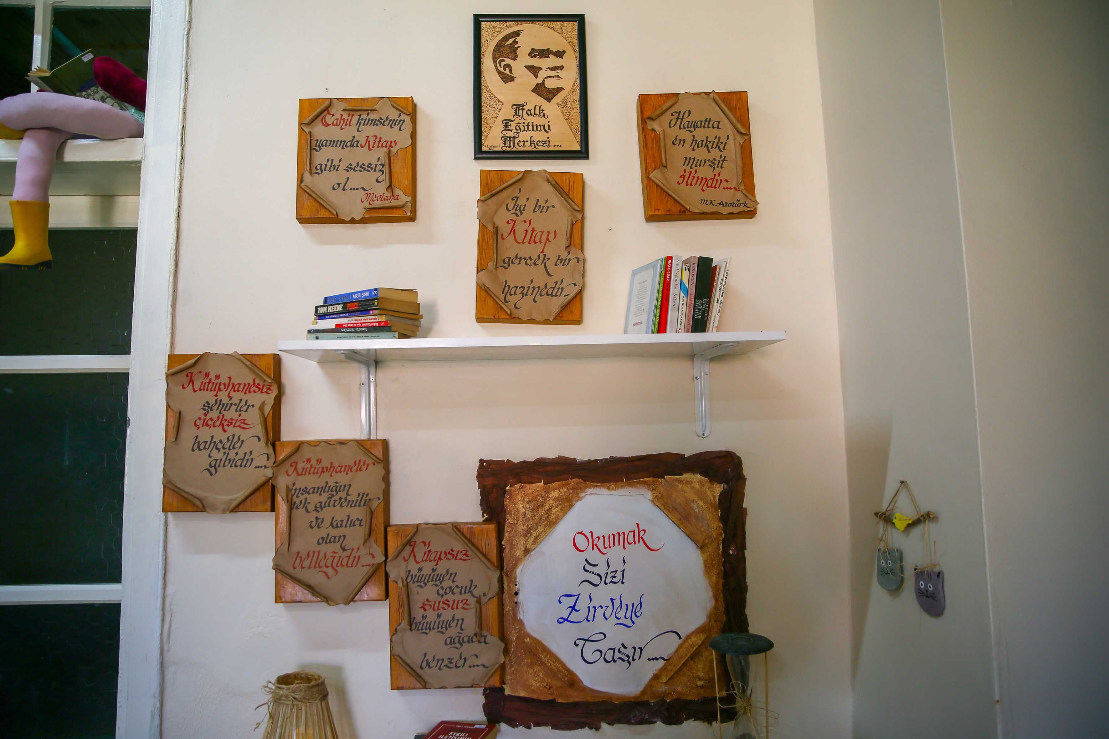 "Eski araba parçaları, sebze kasaları, düğmeler, aynalar, perdeler, danteller, kanaviçeler... El emeğiyle birleşerek birer ürün haline geldi ve güzel bir kütüphane oluşturduk. Amacımız kursiyerlerimizin yoğun temposunda kitap okuyarak dinlenmelerini sağlamaktı.
