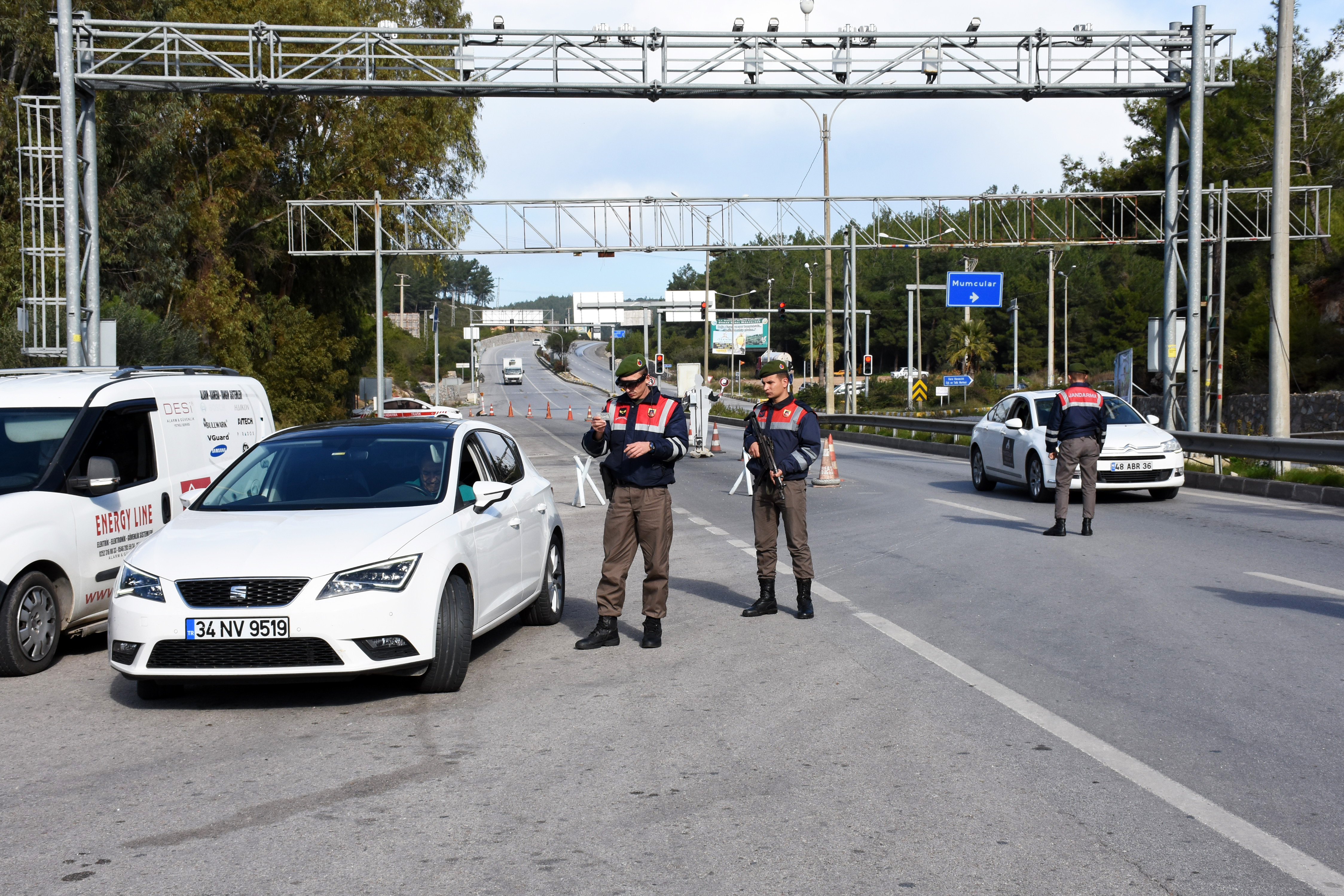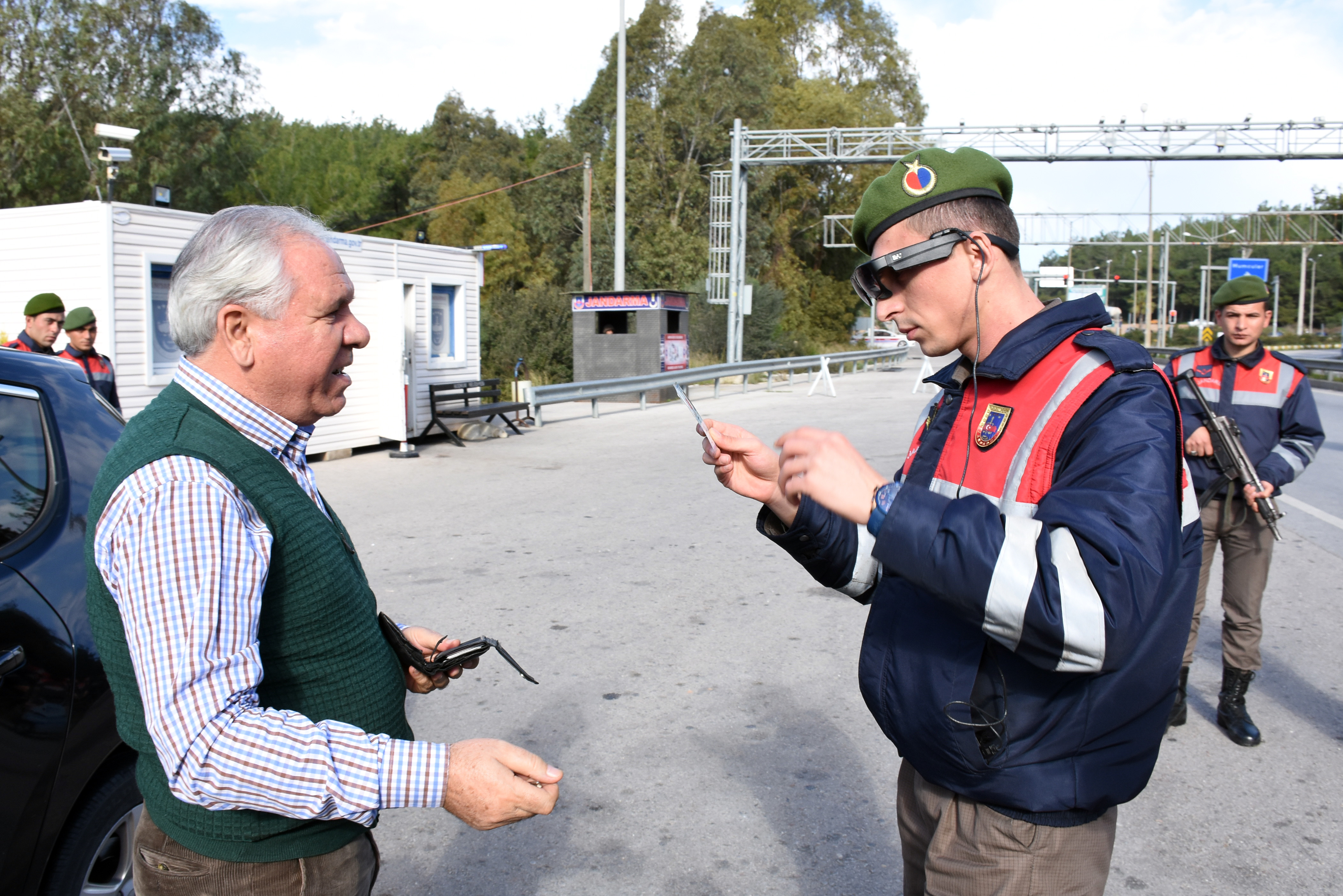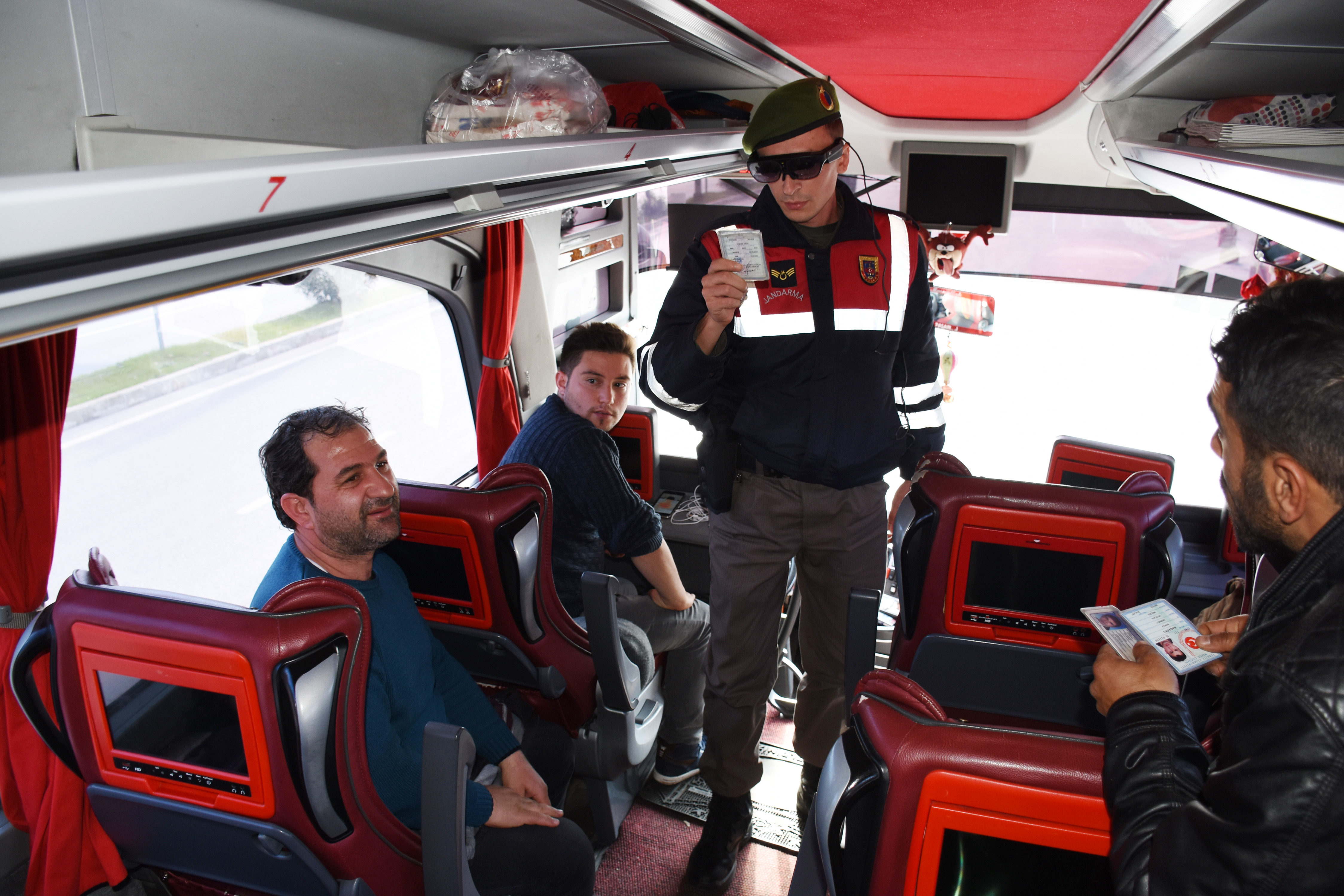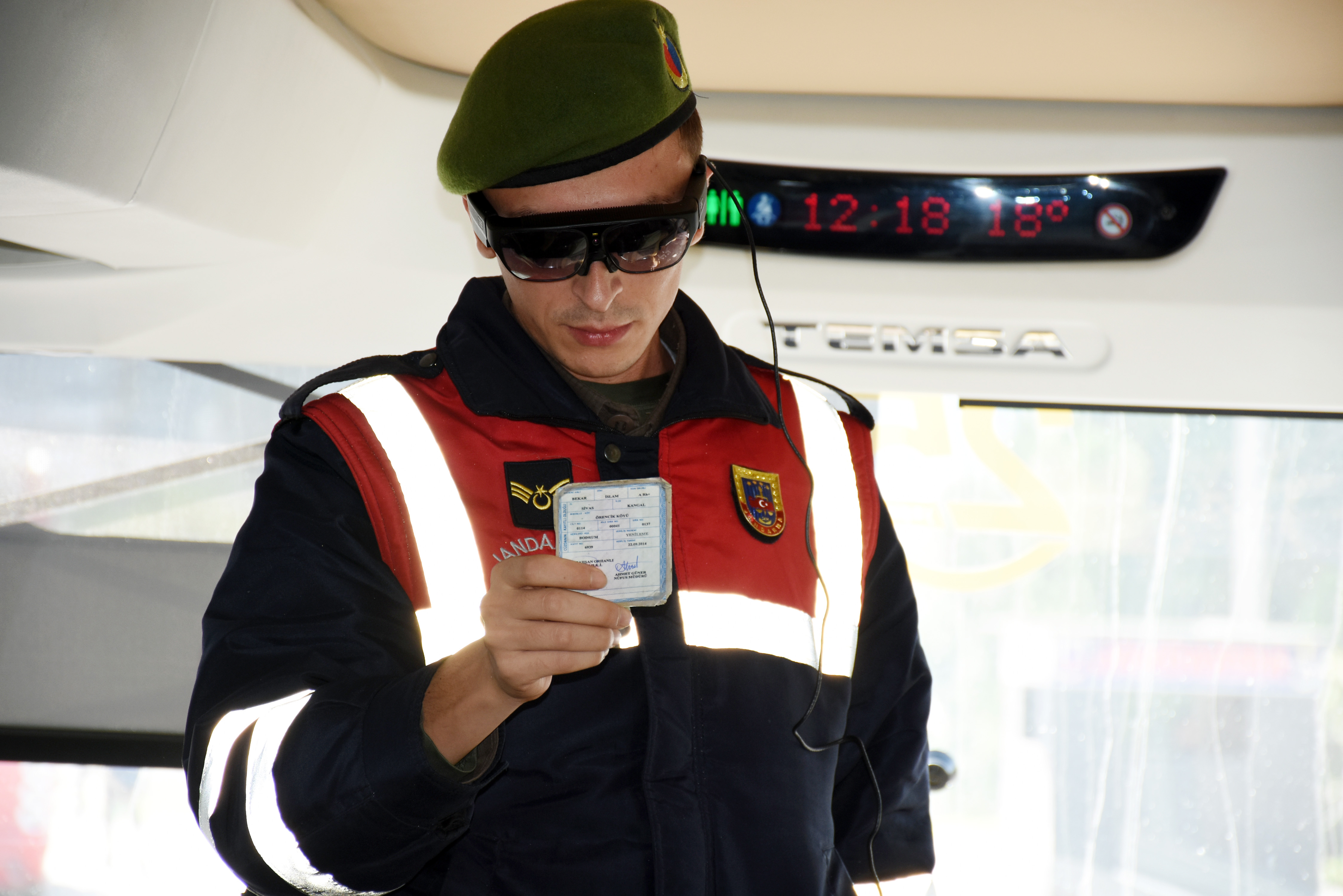 Gözlüğü takan jandarma personeli sürücülerin ehliyetlerini, yolcuların kimliklerini ve araç plakalarını kontrol etti.