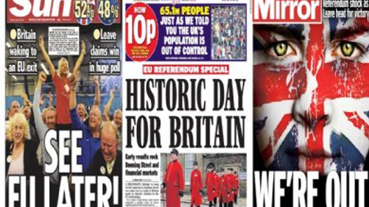 İngiliz bulvar gazetesi The Sun referandum öncesi tarafını belirleyerek "AB'den ayrılalım" demişti. The Sun bugün de çarpıcı bir manşetle çıktı. Manşetinde kelime oyunu yapan "The Sun" alaylı bir şekilde "See you later"ı Avrupa Birliği'nin kısaltması "EU" şeklinde değiştirerek "See EU later" "AB görüşürüz" başlığına dönüştürdü. "The Sun" gazetesi alt başlıkta ise, "Birleşik Krallık, Avrupa Birliği'nden ayrılmaya uyandı" cümlesini kullandı.