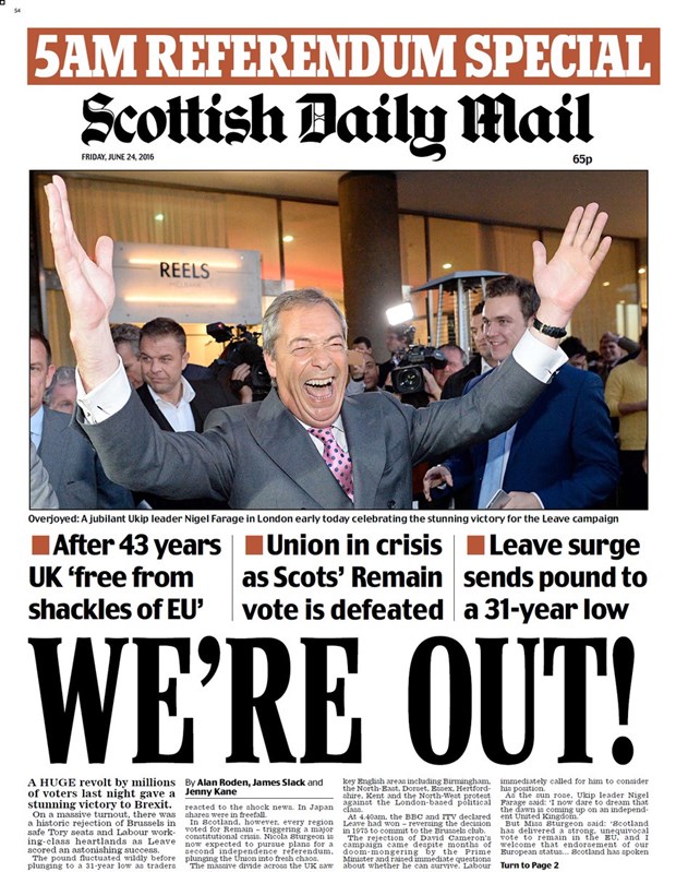İskoçya'daki seçmenlerin büyük çoğunluğu "AB'de kalalım" yönünde oy kullandı. İskoçya'ya yayımlanan "Scottish Daily Mail" gazetesi ise, "Biz ayrıldık" manşetini attı. "Scottish Daily Mail" gazetesi "43 yıl sonra Birleşik Krallık AB prangasından kurtuldu" alt başlığını kullandı.