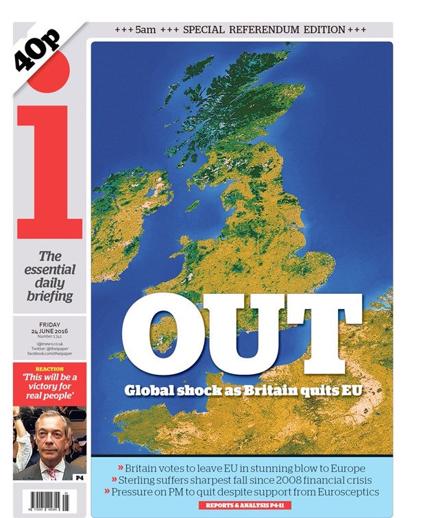 Bir diğer günlük gazete "I" ise "Ayrıldık, Birleşik Krallık'ın AB'den ayrılması küresel şok yarattı" manşetini kullandı. Gazete, "İngilizlerin AB'den ayrılma yönünde oy kullanması Avrupa için büyük bir hezimet oldu" yorumunu yaptı.
