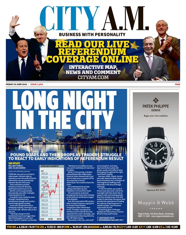 "City A.M." gazetesi de, "Şehirde uzun gece" manşetini kullandığı haberinde, "Referandum sonucu sonrası İngiliz sterlini tepe taklak" yorumunu yaptı.