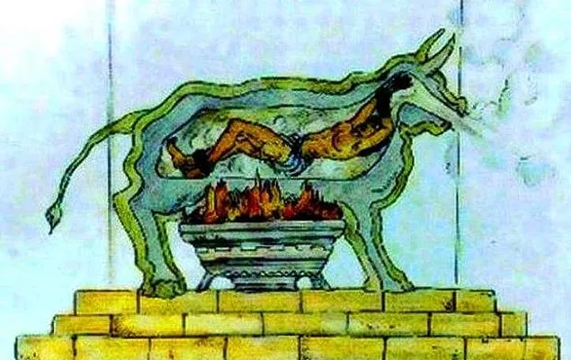 Bu aynı zamanda bronz boğa olarak da bilinirdi. Bir tarafına küçük bir kapı takılı olan ve tamamen bronzdan yapılmış olan boğa figüründe insanlar canlı canlı ateşe verilirdi. İnsanların çığlıkları, boruların içinden geçerek boğa sesine dönüşürdü ve olay daha korkunç bir hale gelirdi.