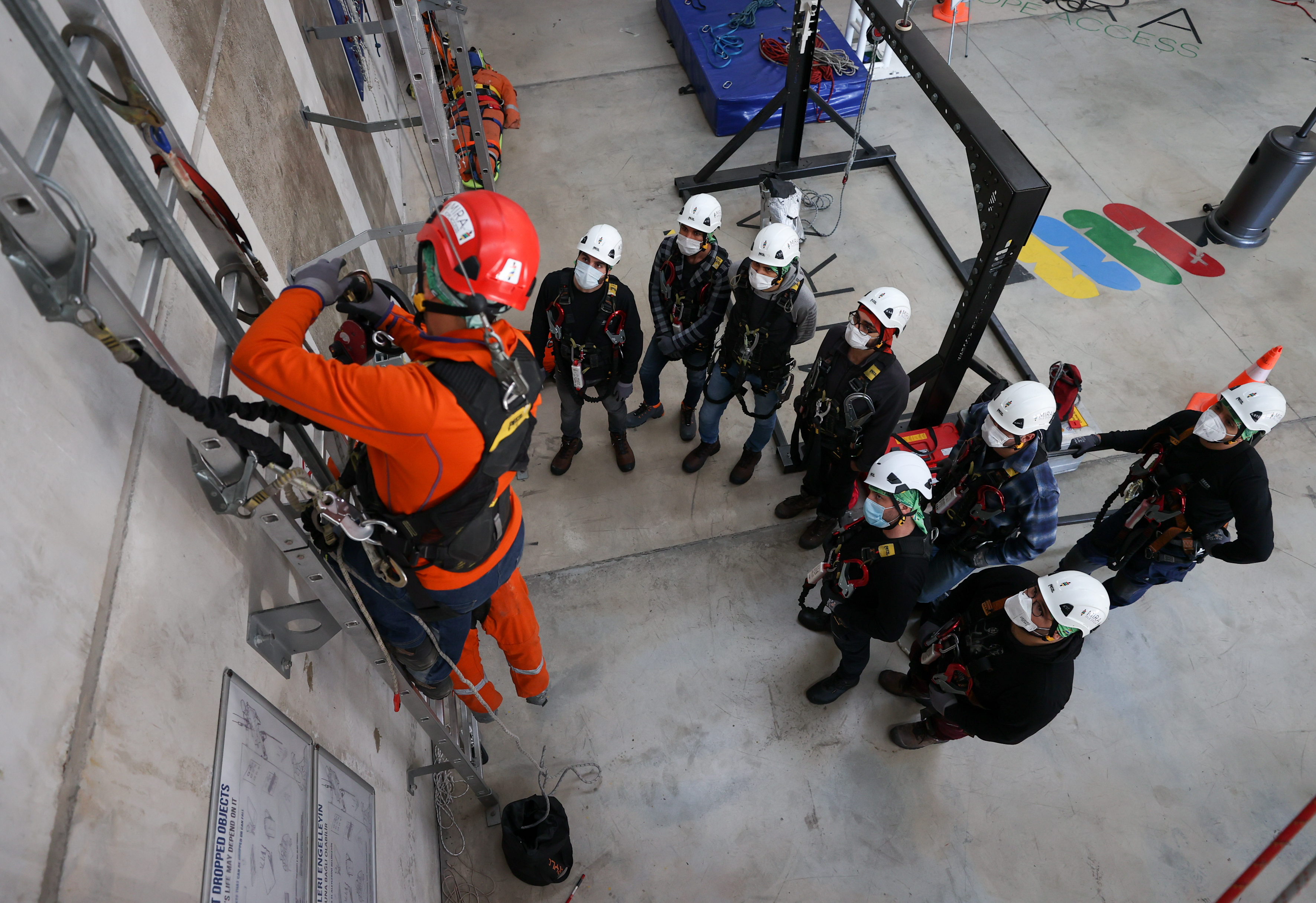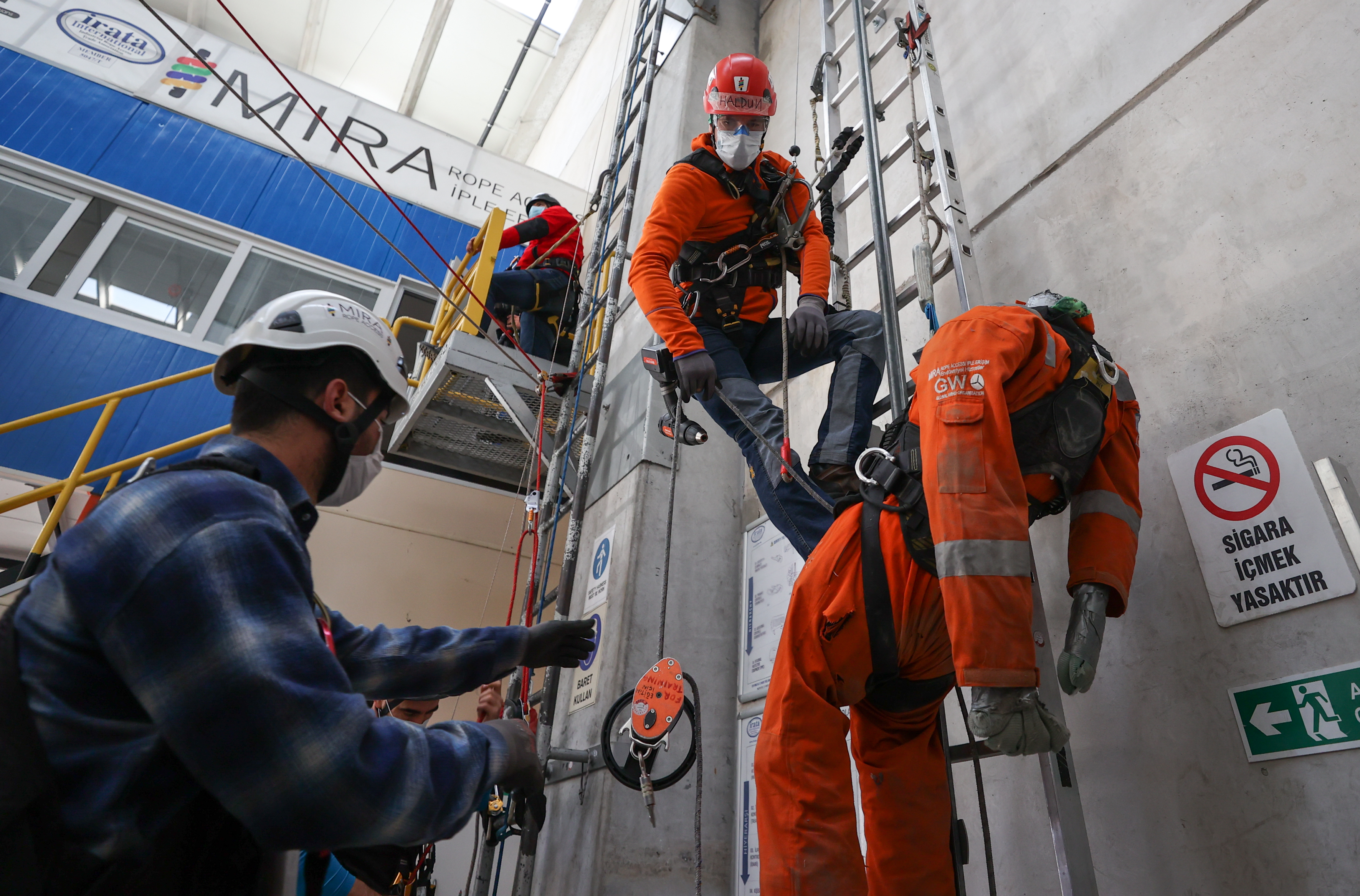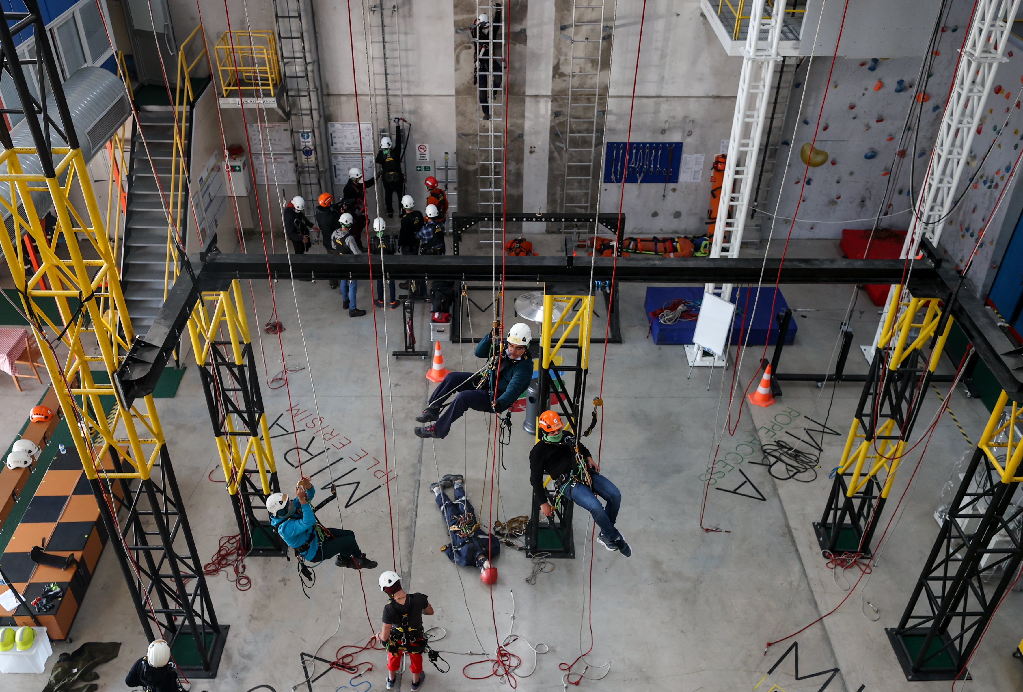 Bir depo içinde hazırlanan ve yaklaşık 15 metre yüksekliğe kadar çıkan kursiyerler, dağcı gibi tırmanma faaliyetlerine katılıyor. Yüksekte meydana gelebilecek bütün senaryolara hazırlanan ekipler, kimi zaman yangın tatbikatı yapıyor kimi zaman ise baygınlık geçiren bir arkadaşını nasıl kurtaracağının eğitimini alıyor.
