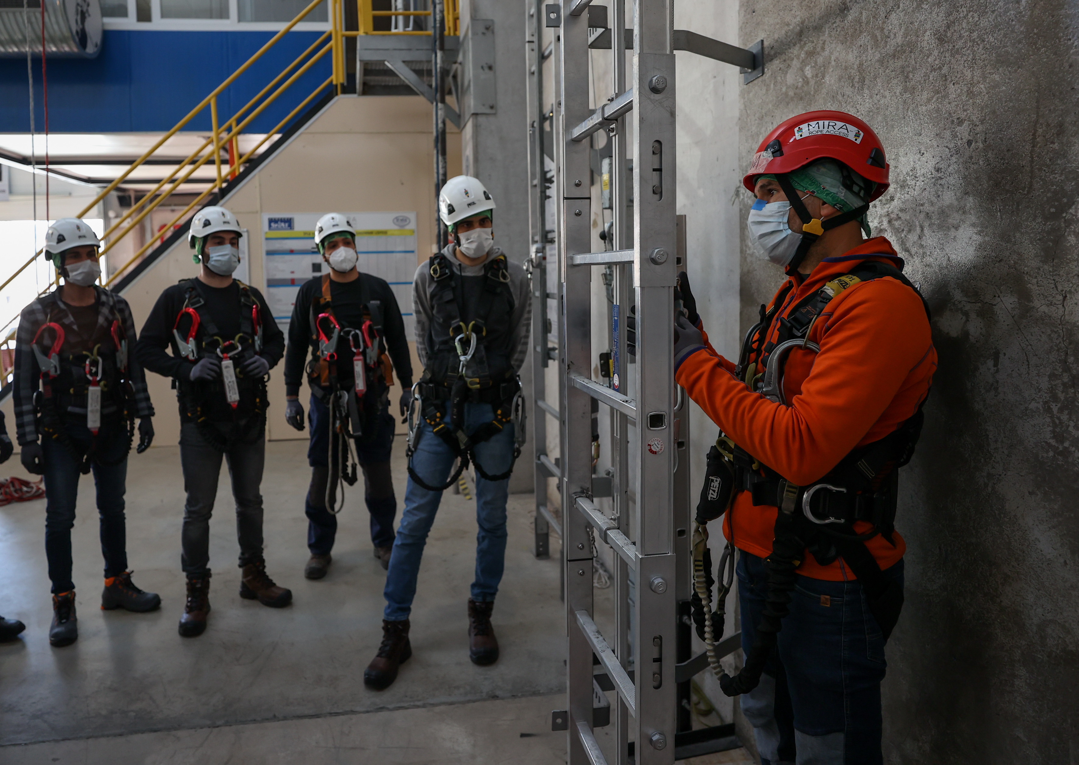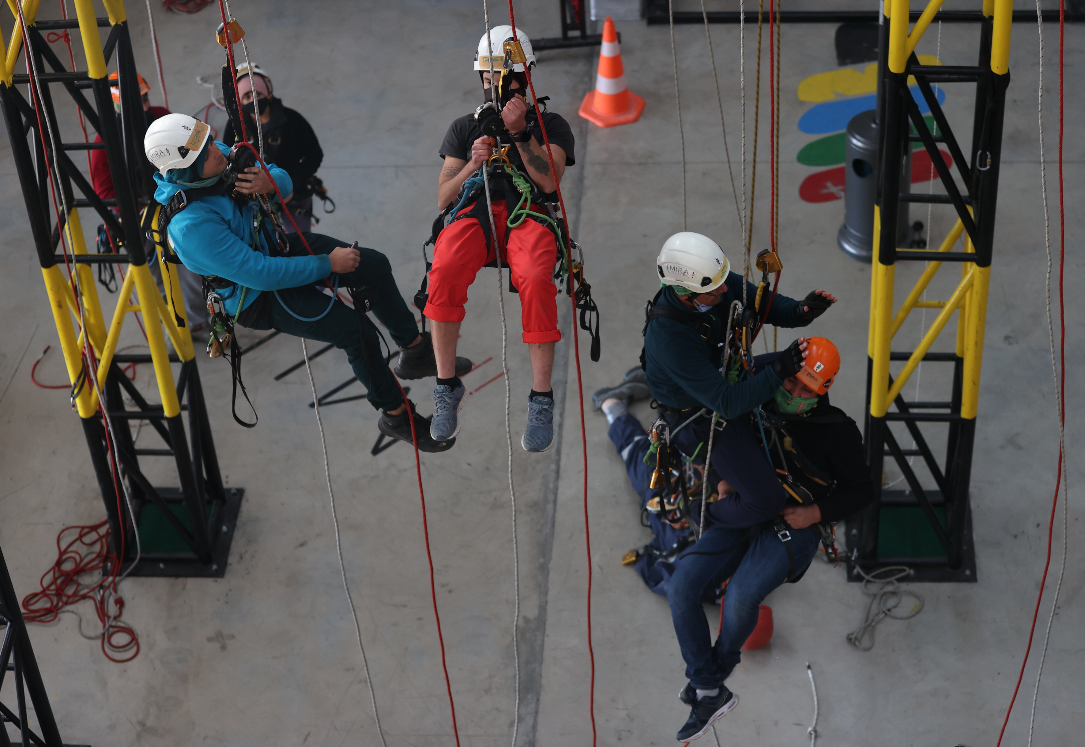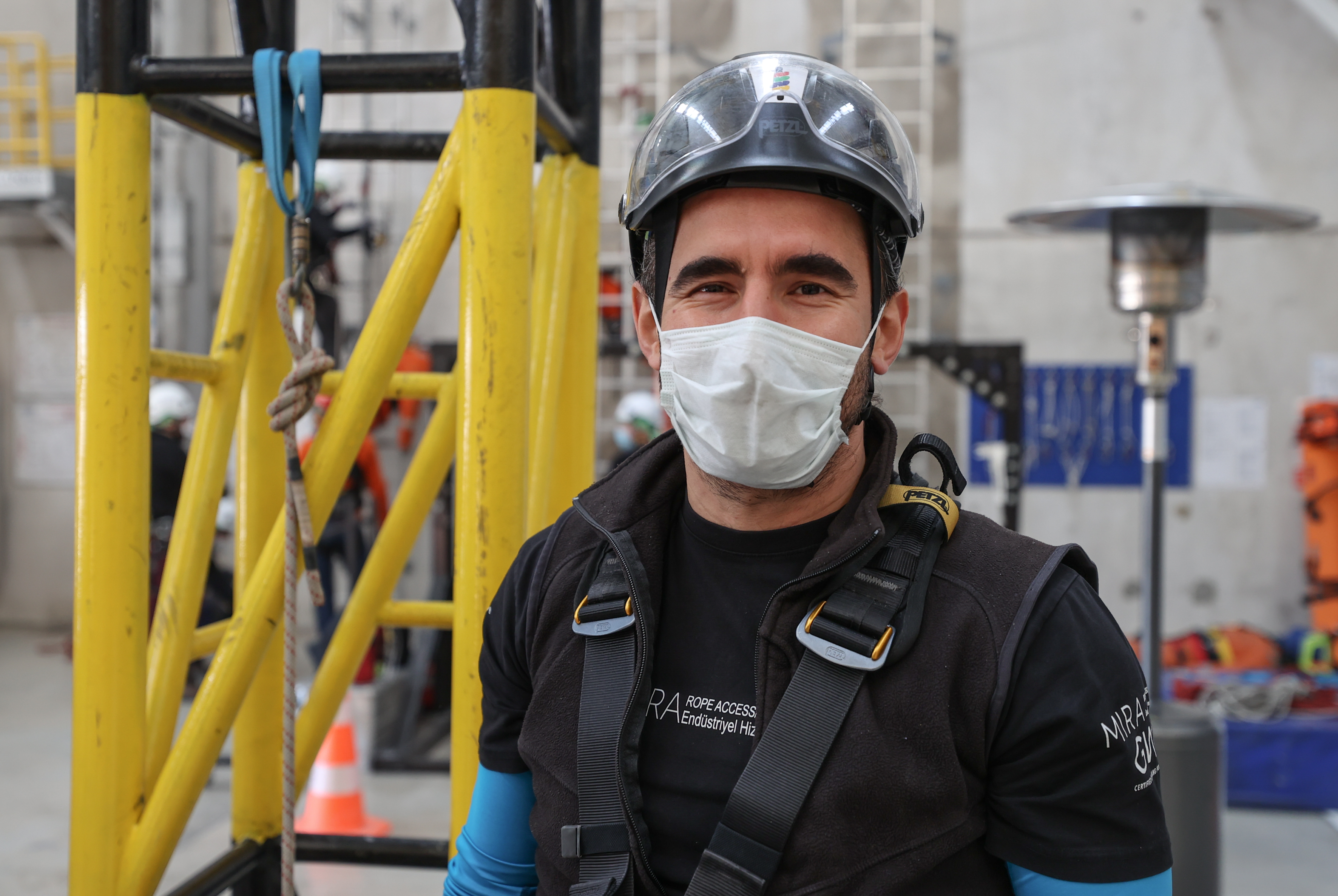 Bir depo içinde hazırlanan ve yaklaşık 15 metre yüksekliğe kadar çıkan kursiyerler, dağcı gibi tırmanma faaliyetlerine katılıyor. Yüksekte meydana gelebilecek bütün senaryolara hazırlanan ekipler, kimi zaman yangın tatbikatı yapıyor kimi zaman ise baygınlık geçiren bir arkadaşını nasıl kurtaracağının eğitimini alıyor.
