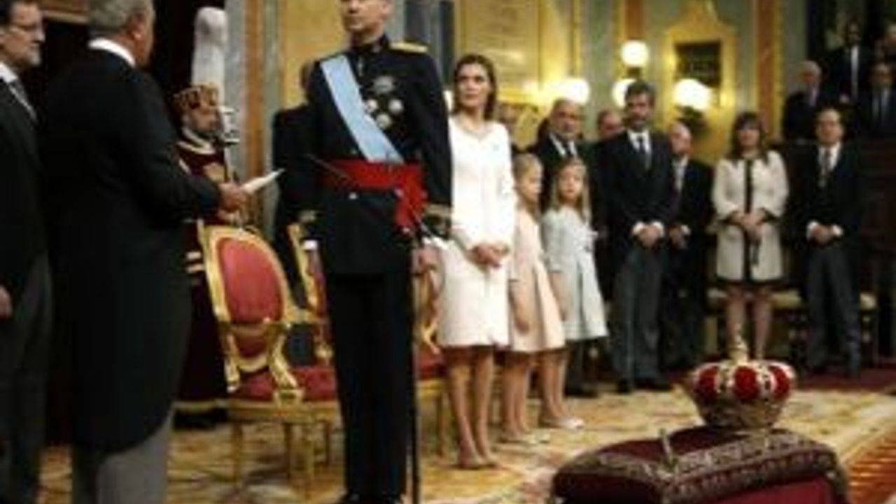 Dünyadaki diğer monarşilerden farklı olarak 6'ncı Felipe, 1975 yılında babası Juan Carlos'un krallık töreninde olduğu gibi taç giymeyecek. 6'ncı Felipe'nin İspanyol Anayasası üzerine yemin ettiği tören sırasında kürsüde, İspanyol monarşisinin sembolü olan taç ve kral asası altın kaplamalı bir sandığın üzerinde durdu. 6'ncı Felipe, İspanya Silahlı Kuvvetler'in en üst komutanı olarak mareşal nişanının takılı olduğu Kara Kuvvetleri'ne ait resmi davet üniformasıyla törene katıldı. Törende eşi Kraliçe Letizia ile küçük kızları Prenses Sofia ve Leonor da hazır bulundu. Törende, Felipe'nin teyzesi, Lugo Düşesi Elena gözyaşlarını tutamadı.