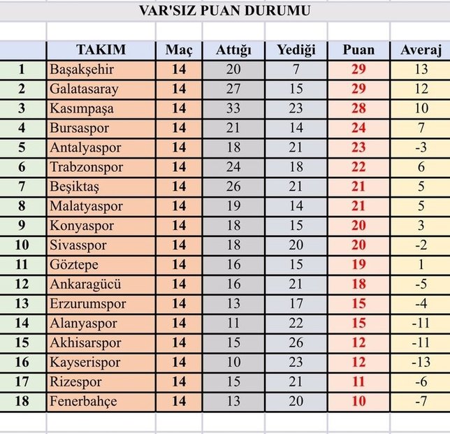 Süper Lig'de 14. hafta müsabakaları tamamlanırken, her hafta farklı bir takım tarafından tartışılan Video Hakem Sistemi (VAR) kullanılmasaydı, ligde oluşan puan durumu hesaplandı.