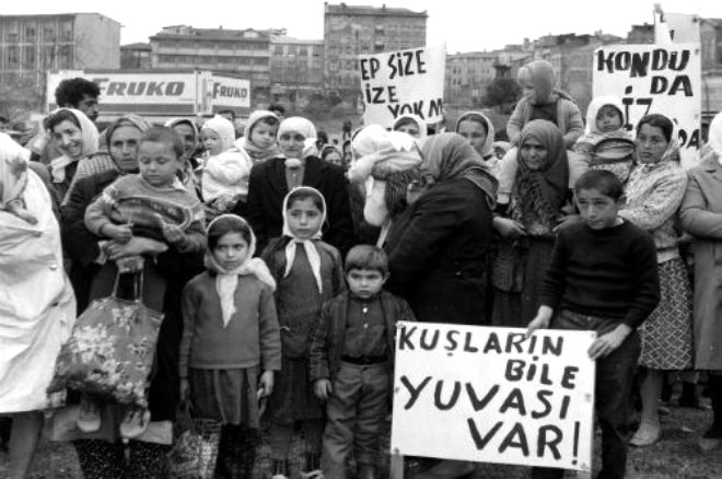 Konut hakkı için çoluk çocuk yürüyen insanlar; "Gecekonduda biz, Teşvikiye'de siz", "Kuşların bile yuvası var" pankartlarıyla...