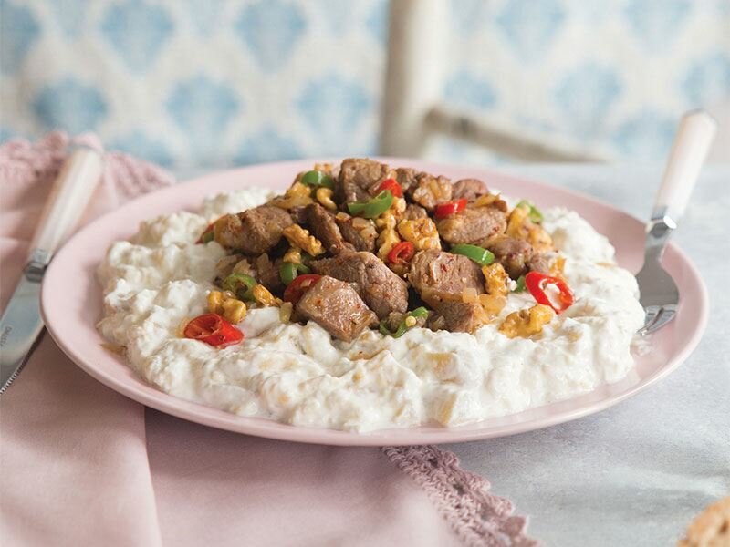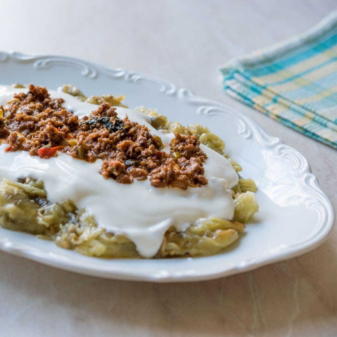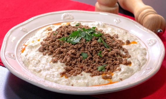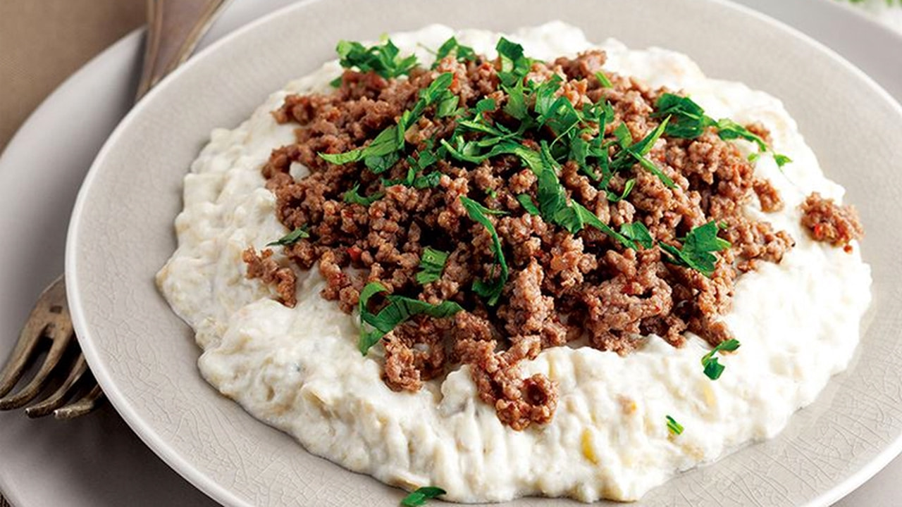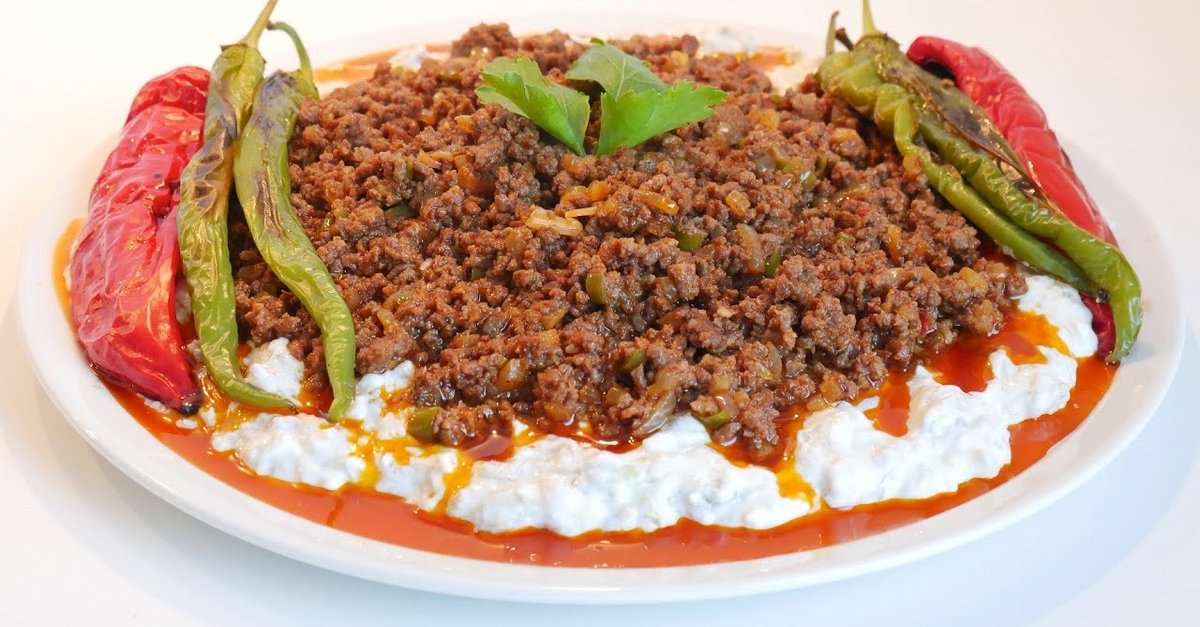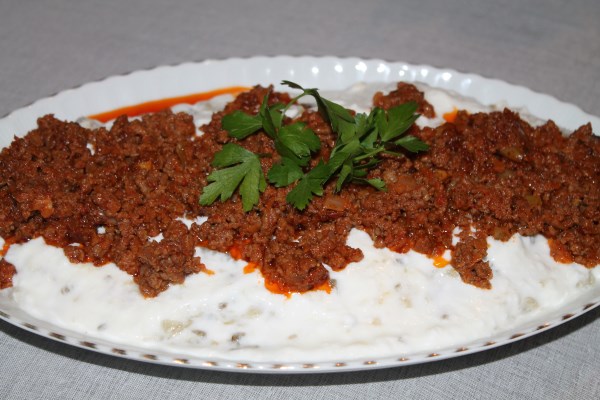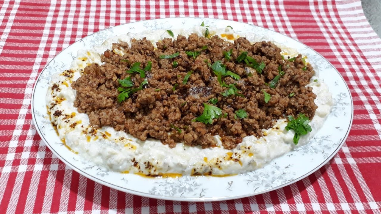 Pişen kıyma, servis tabağına alınan yoğurt ve patlıcanlı karışımın üzerine dökülerek servis ediliyor.