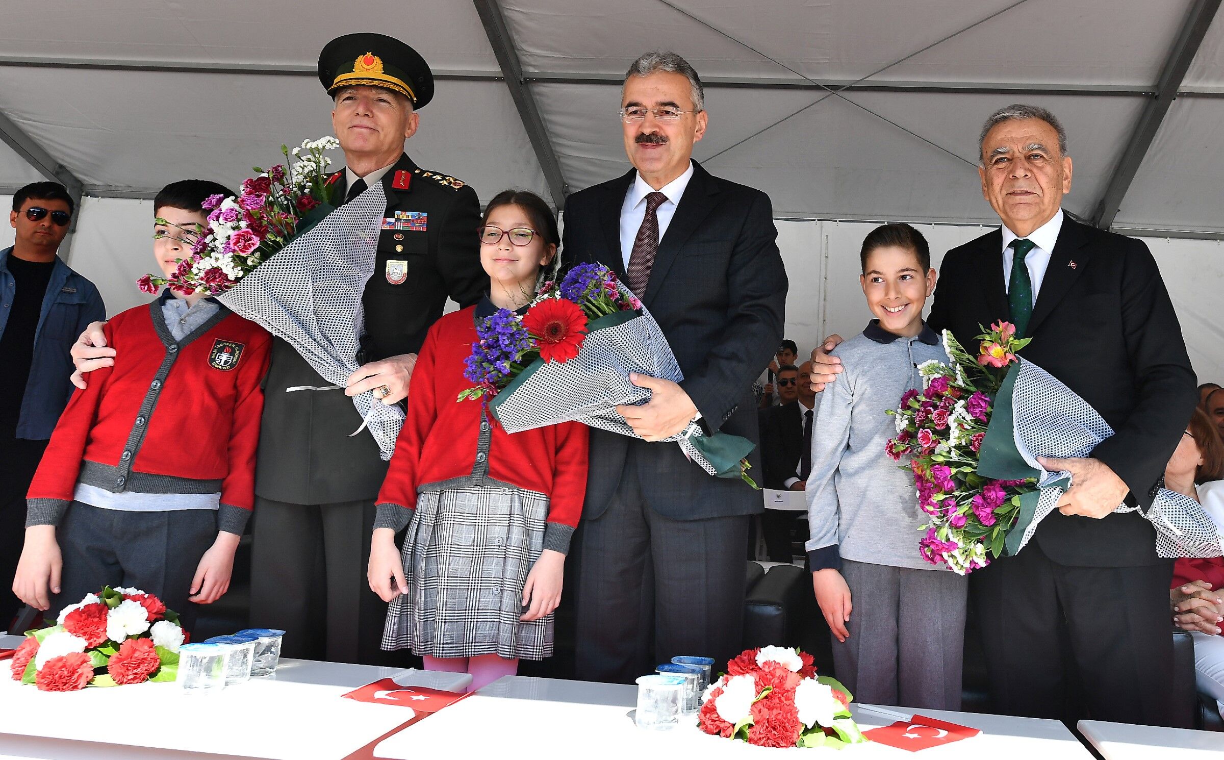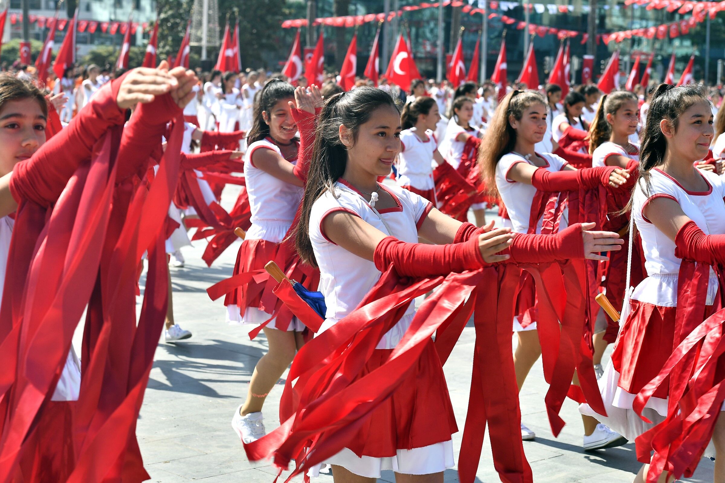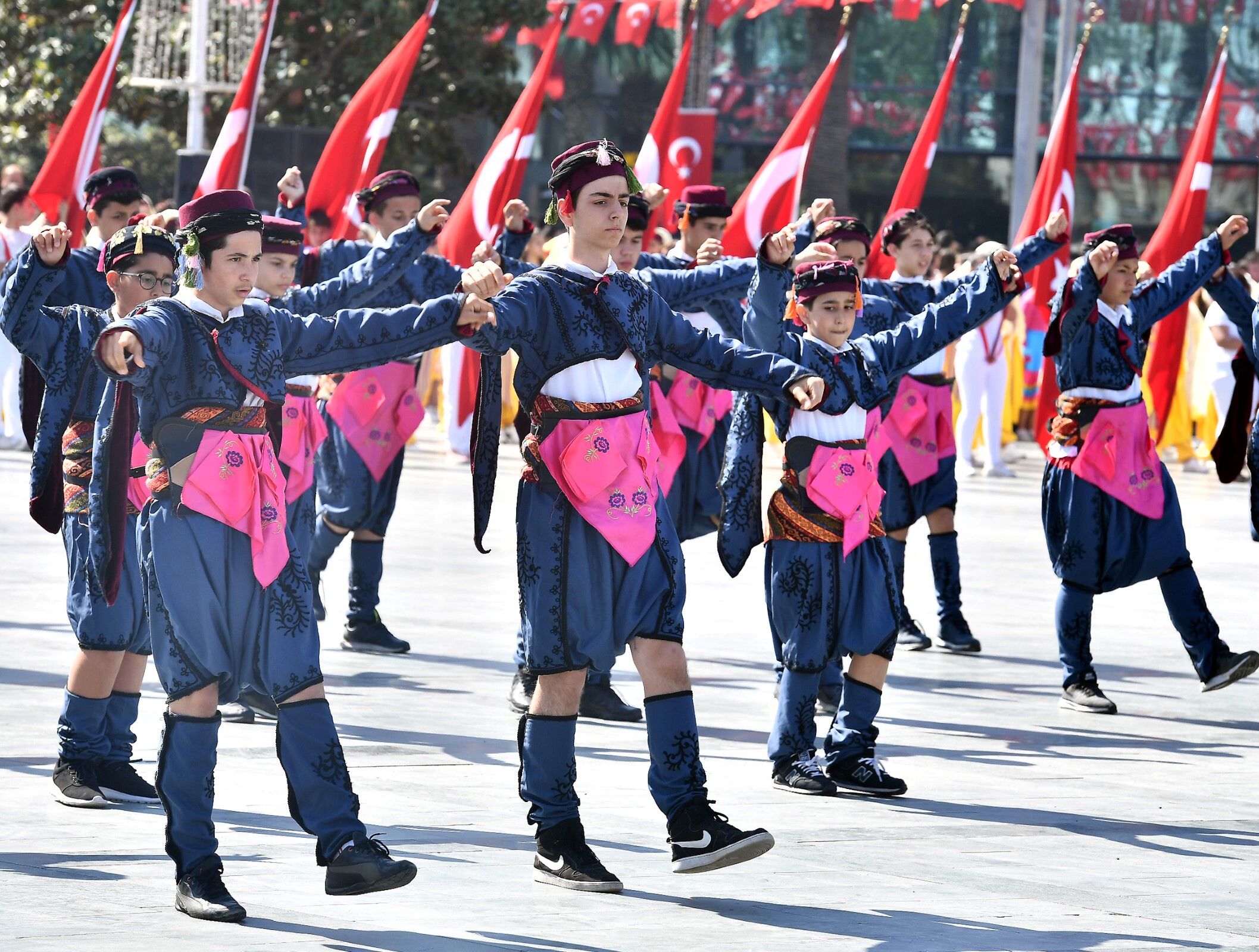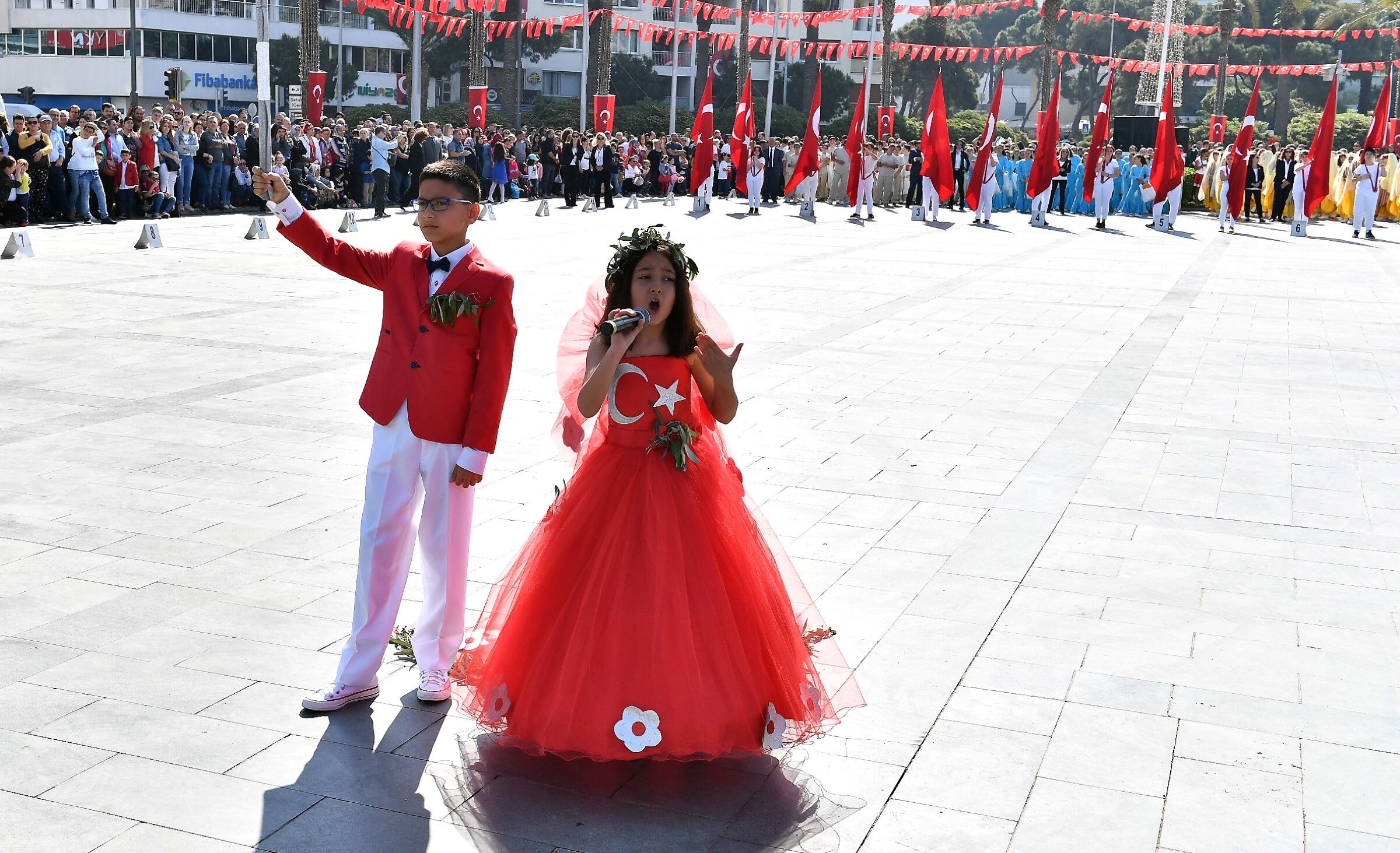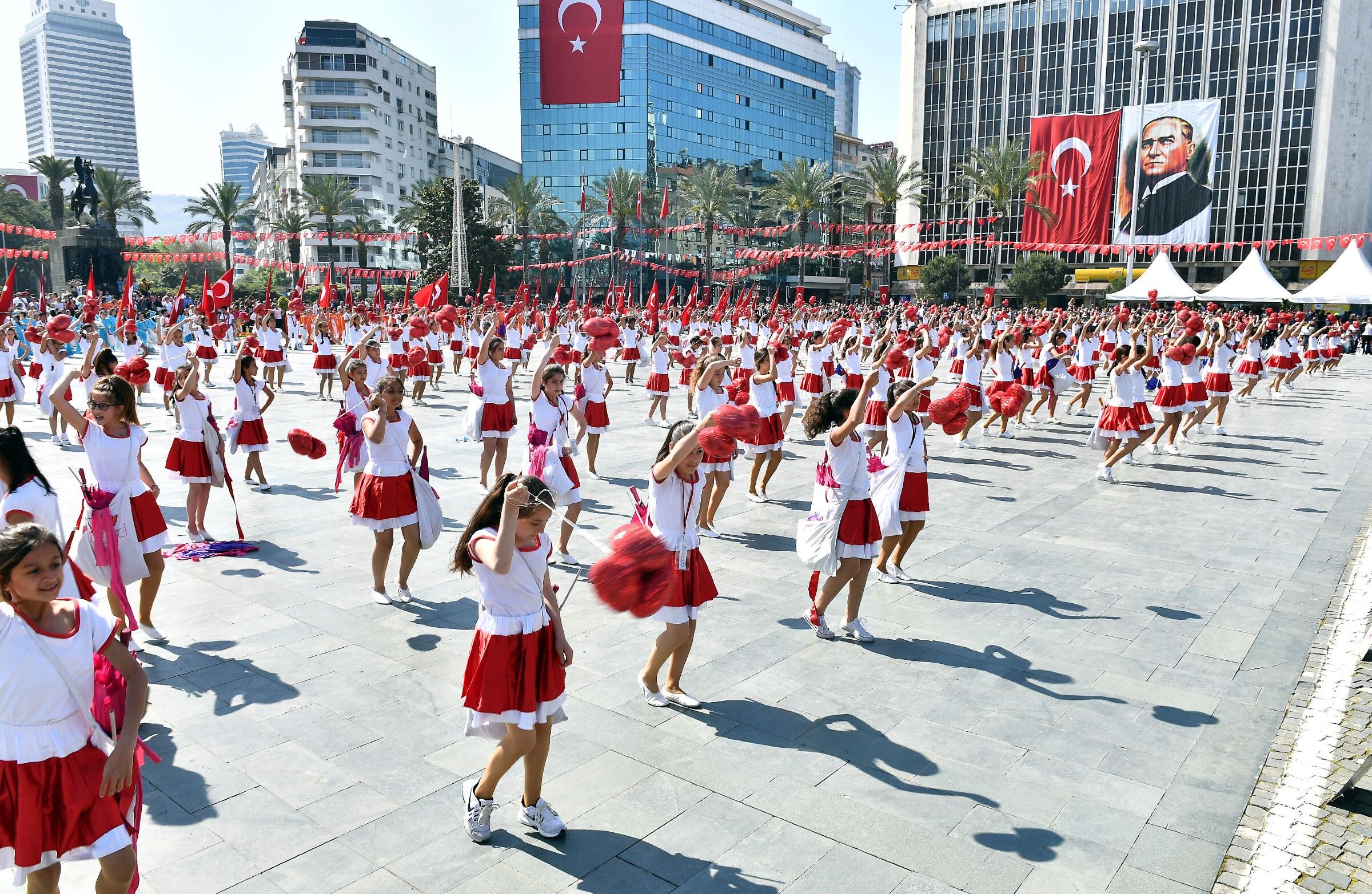 Cumhuriyet Meydanı'ndaki resmi tören, İzmir Valisi Erol Ayyıldız, Ege Ordusu Komutanı Orgeneral Abdullah Recep ve İzmir Büyükşehir Belediye Başkanı Aziz Kocaoğlu'na öğrenciler tarafından çiçekler verilmesiyle başladı.