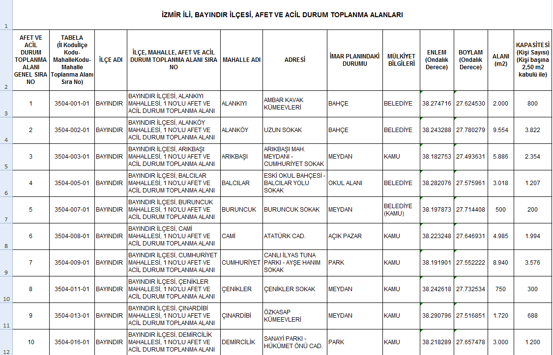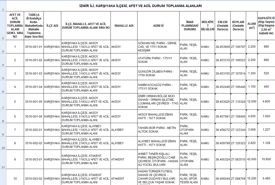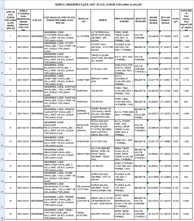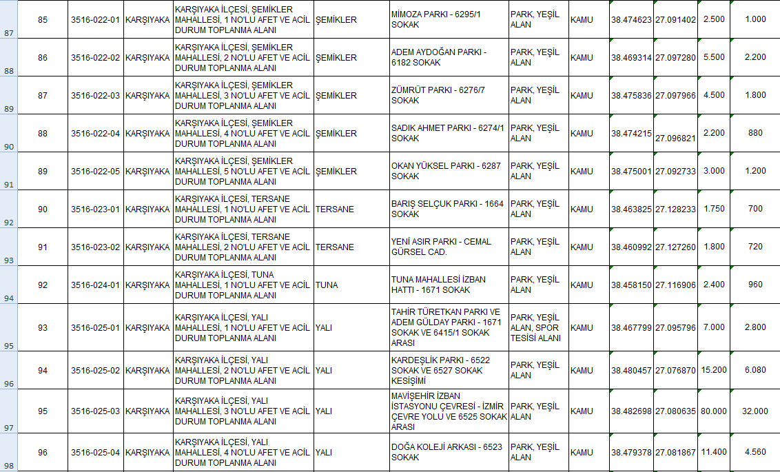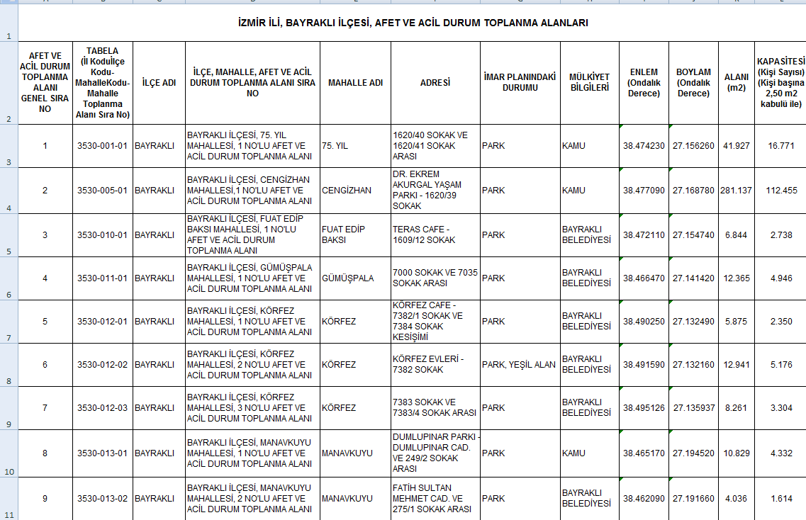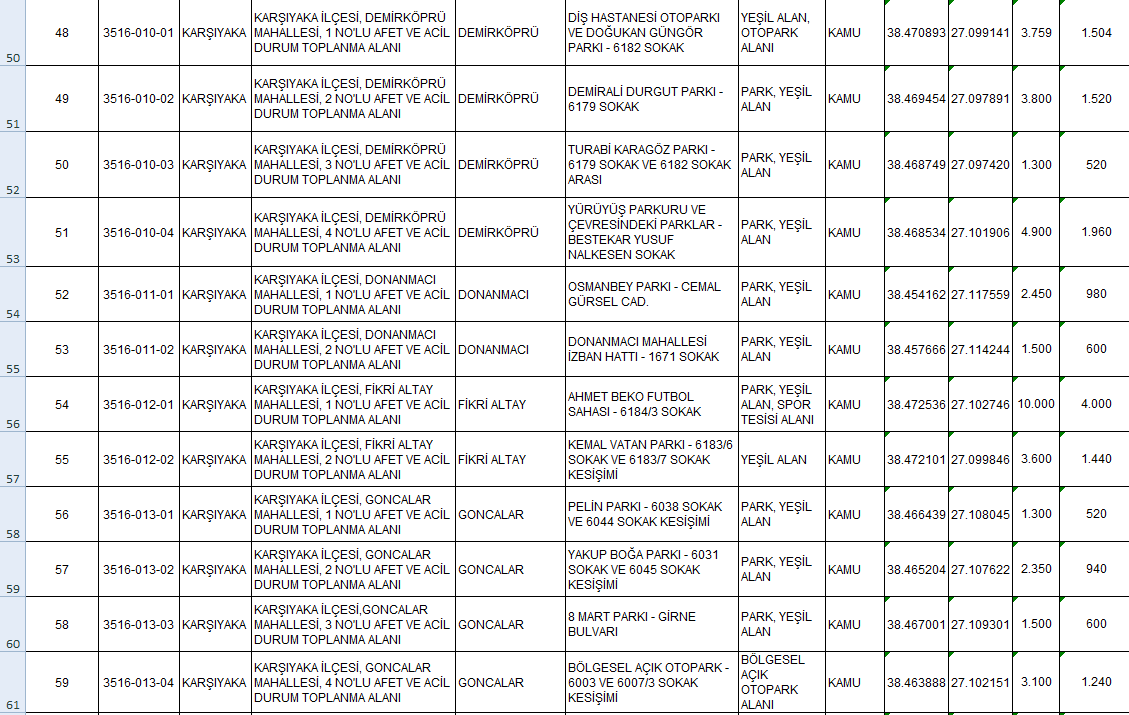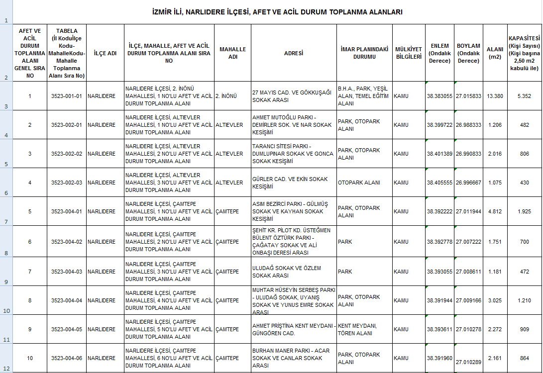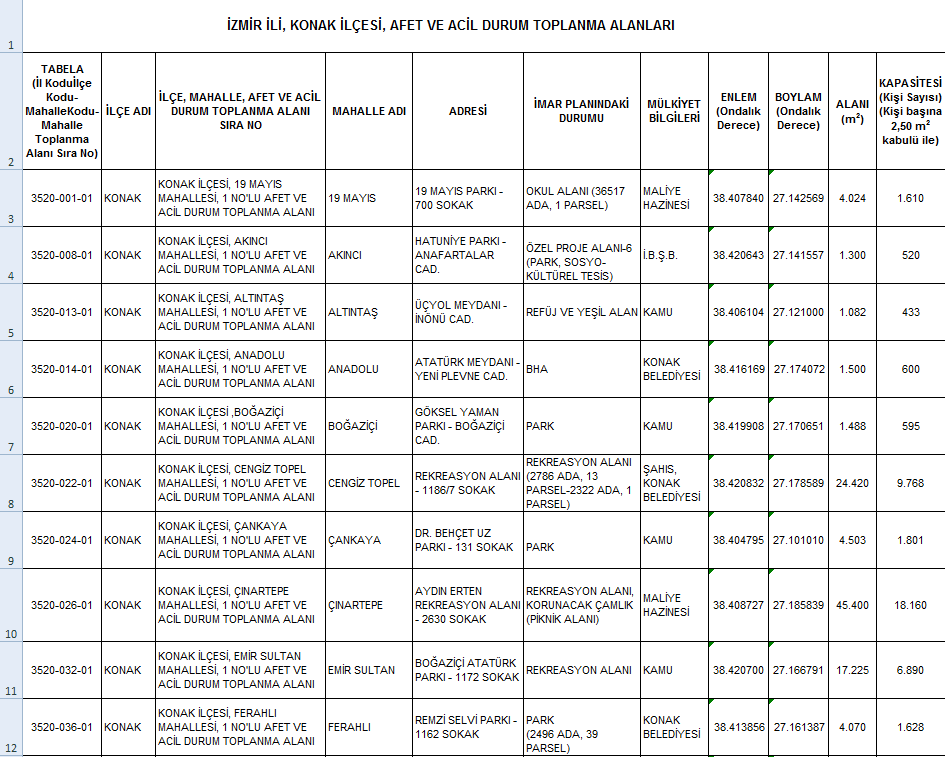 İzmir'de olası bir afet sonrası toplanma alanlarının (korunaklı alanlar) ilçe ilçe, mahalle mahalle listesi...