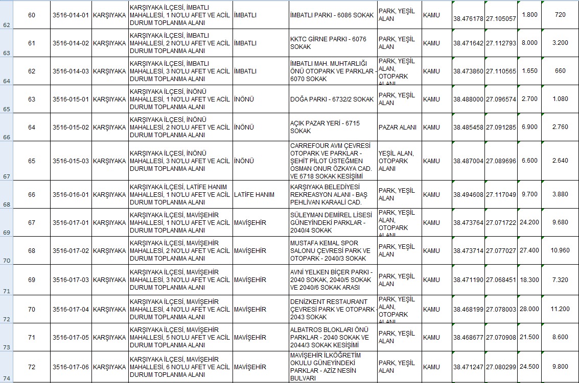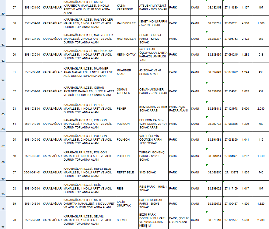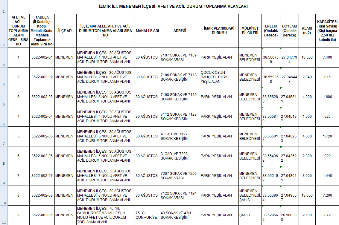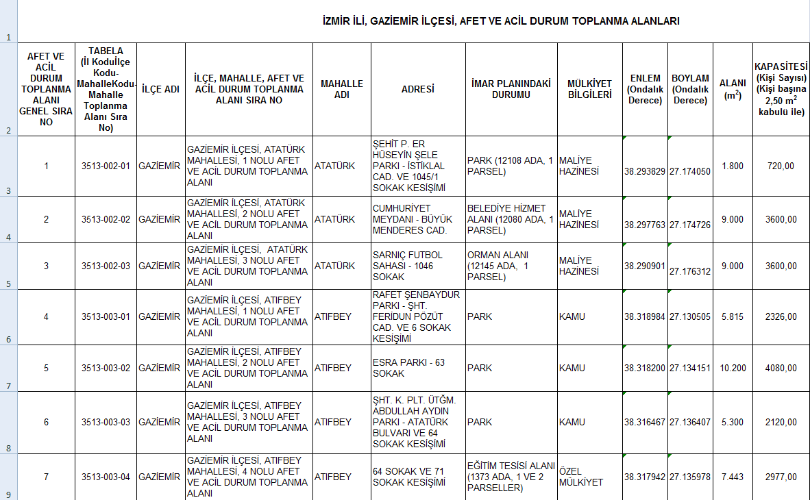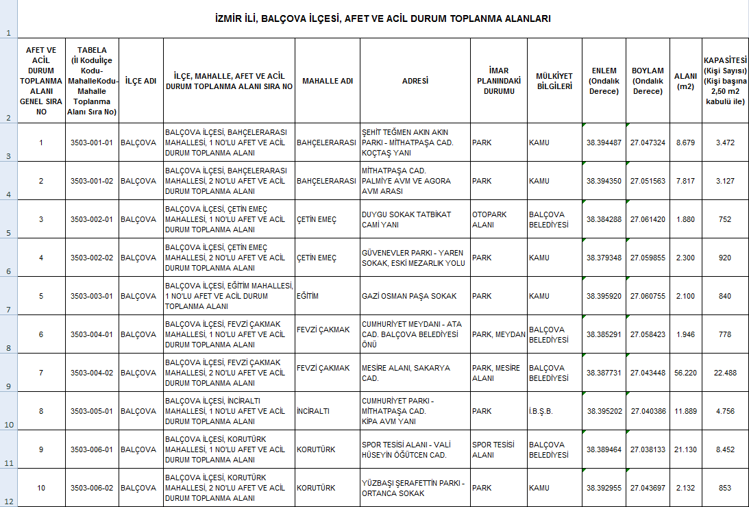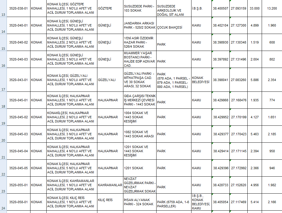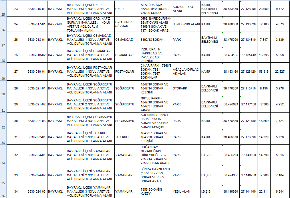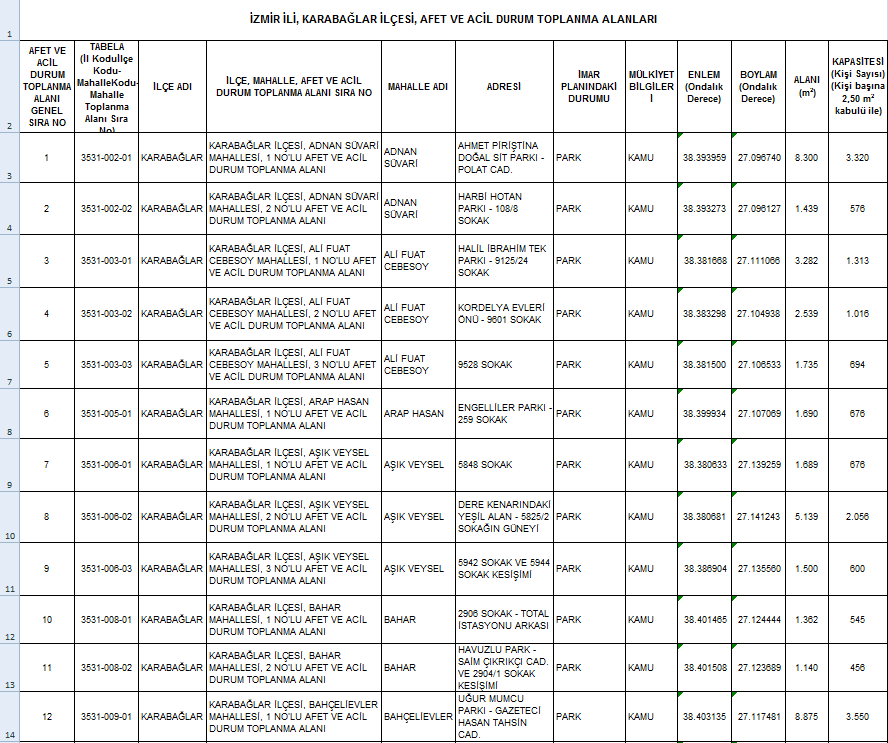 İzmir'de olası bir afet sonrası toplanma alanlarının (korunaklı alanlar) ilçe ilçe, mahalle mahalle listesi...