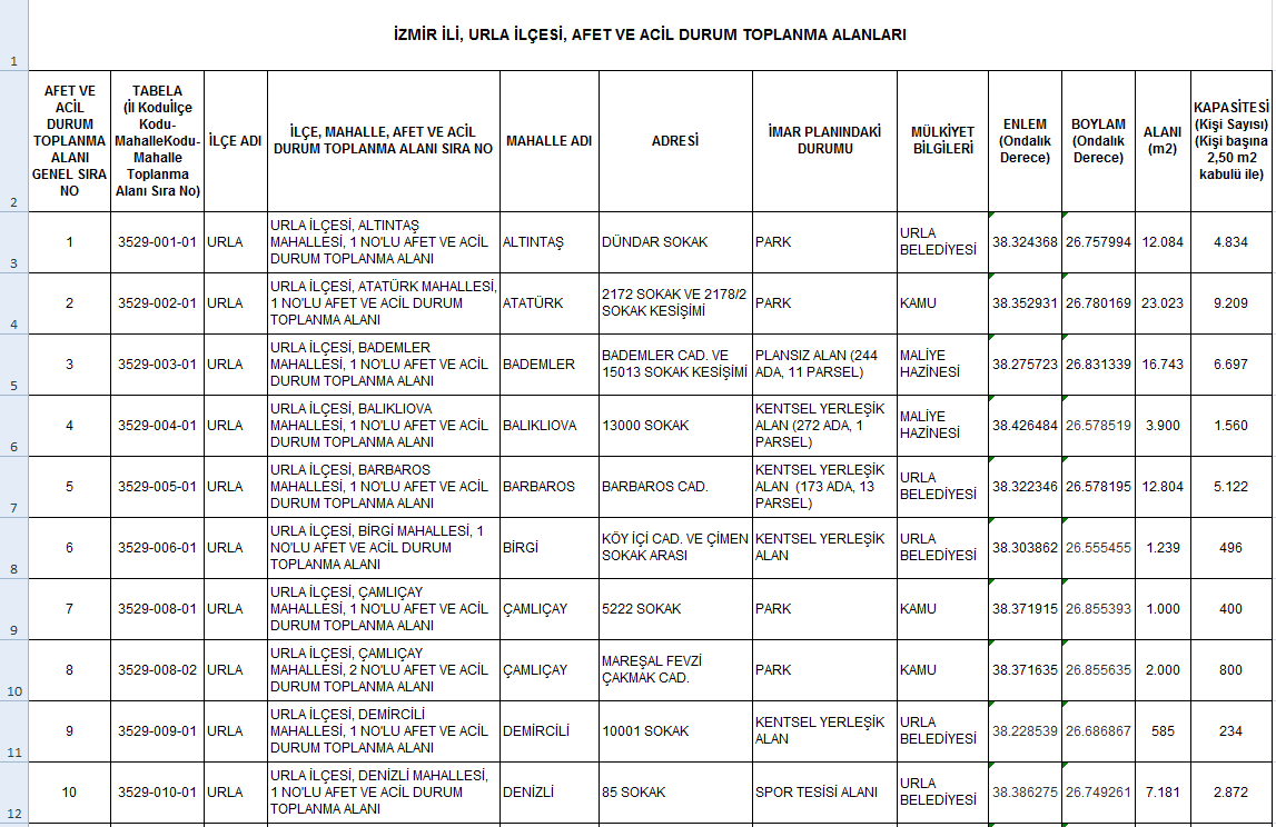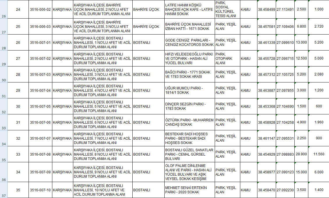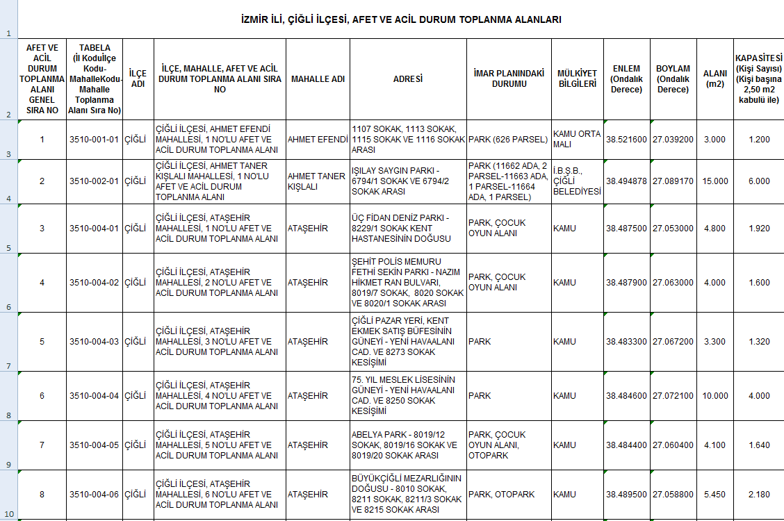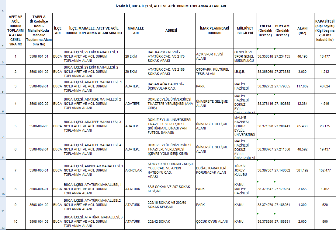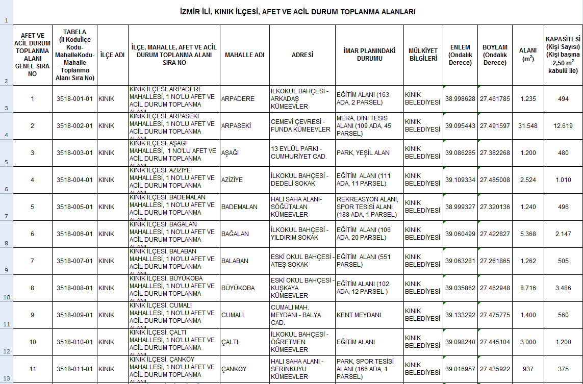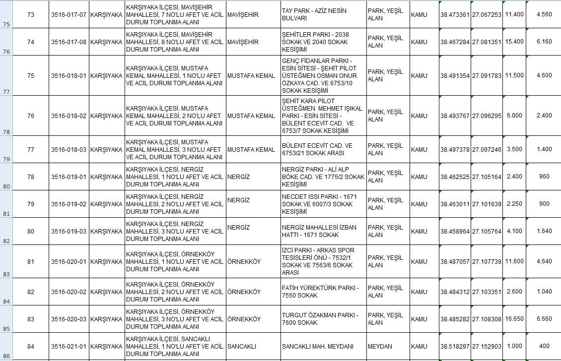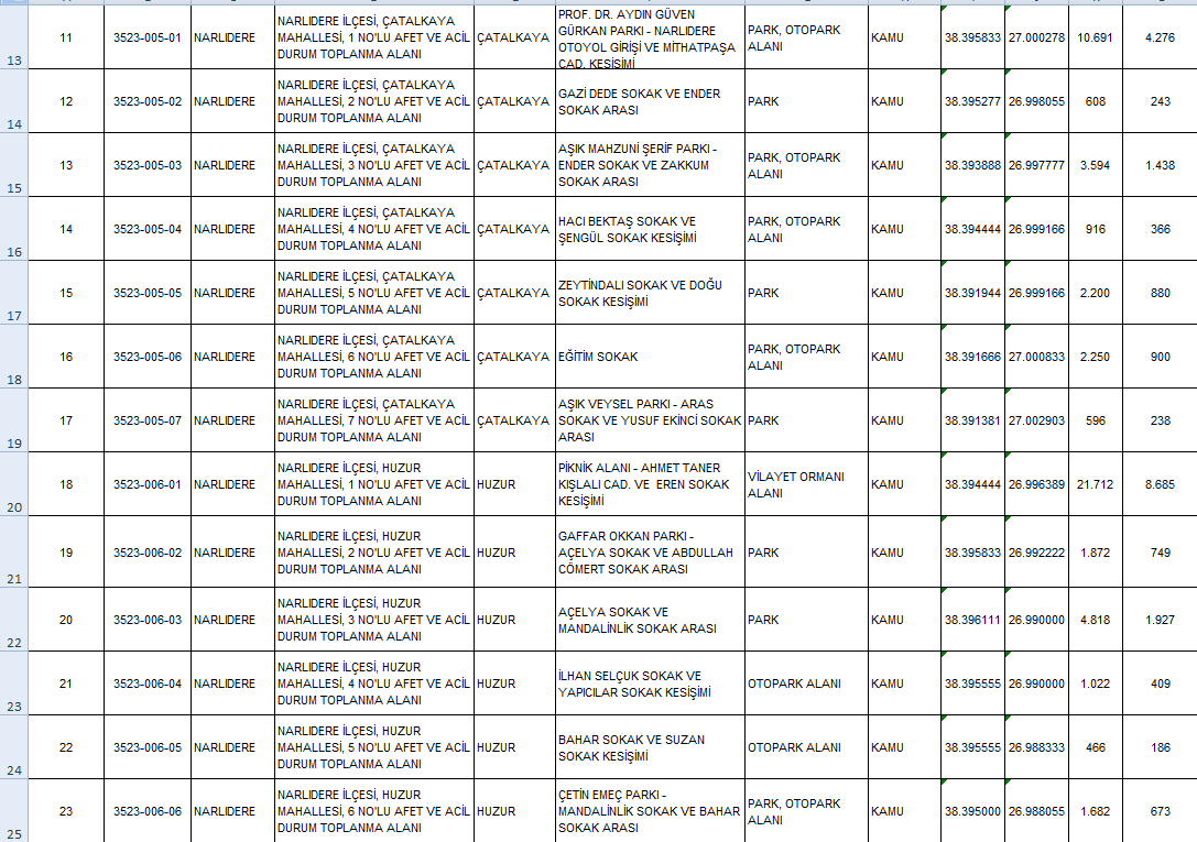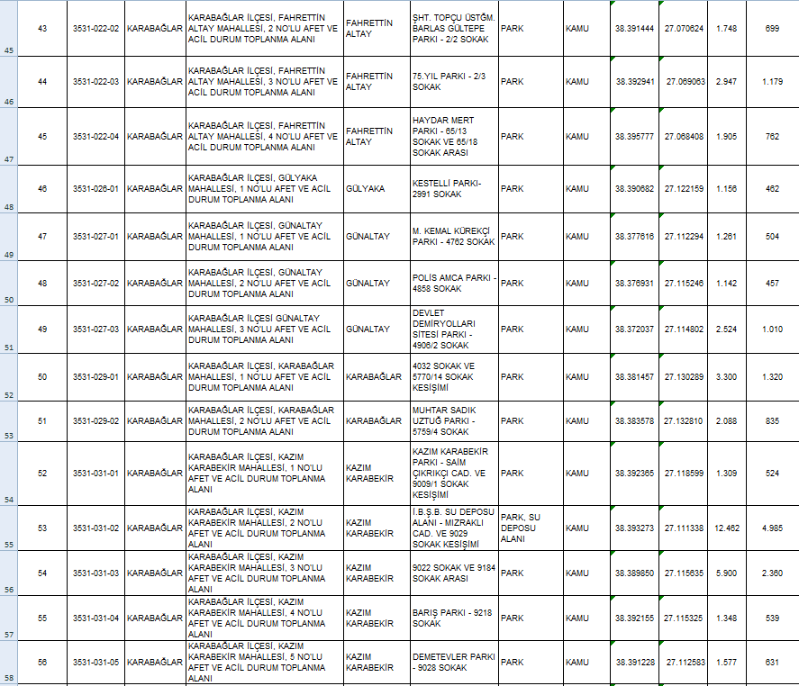 İzmir'de olası bir afet sonrası toplanma alanlarının (korunaklı alanlar) ilçe ilçe, mahalle mahalle listesi...