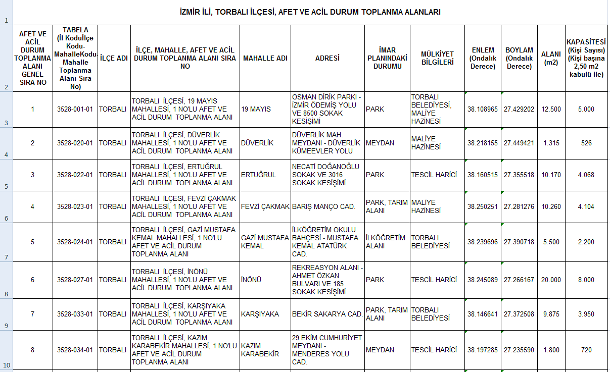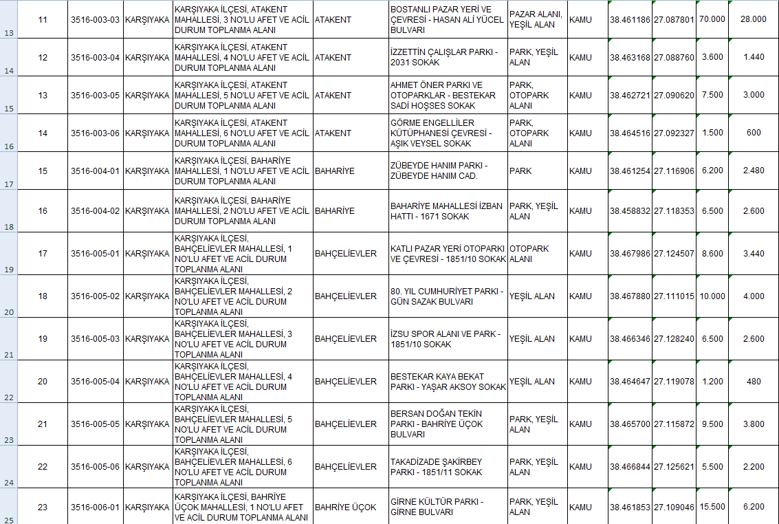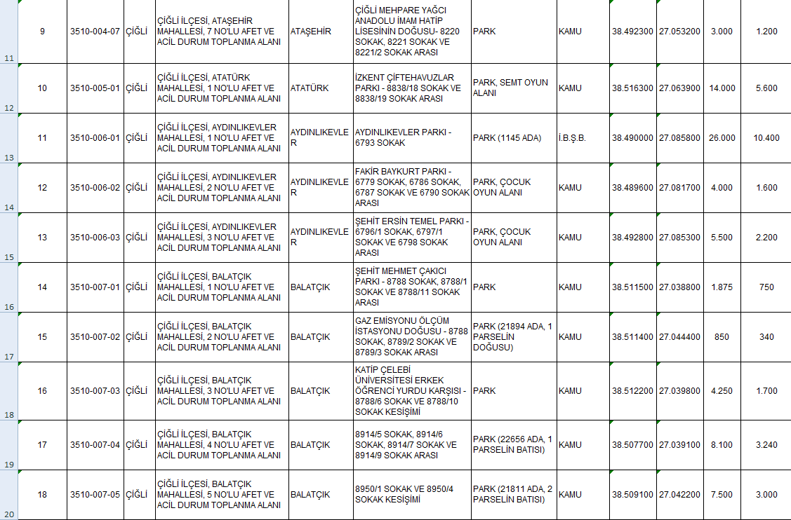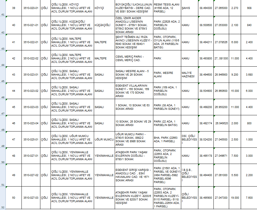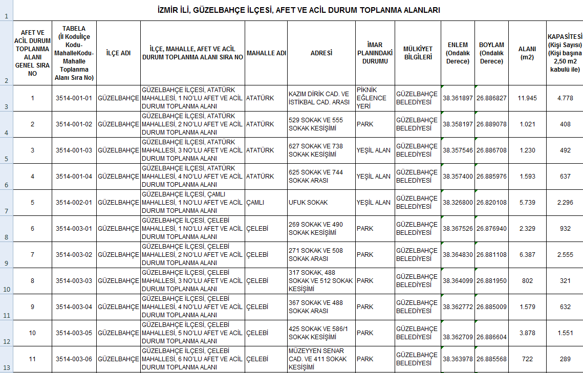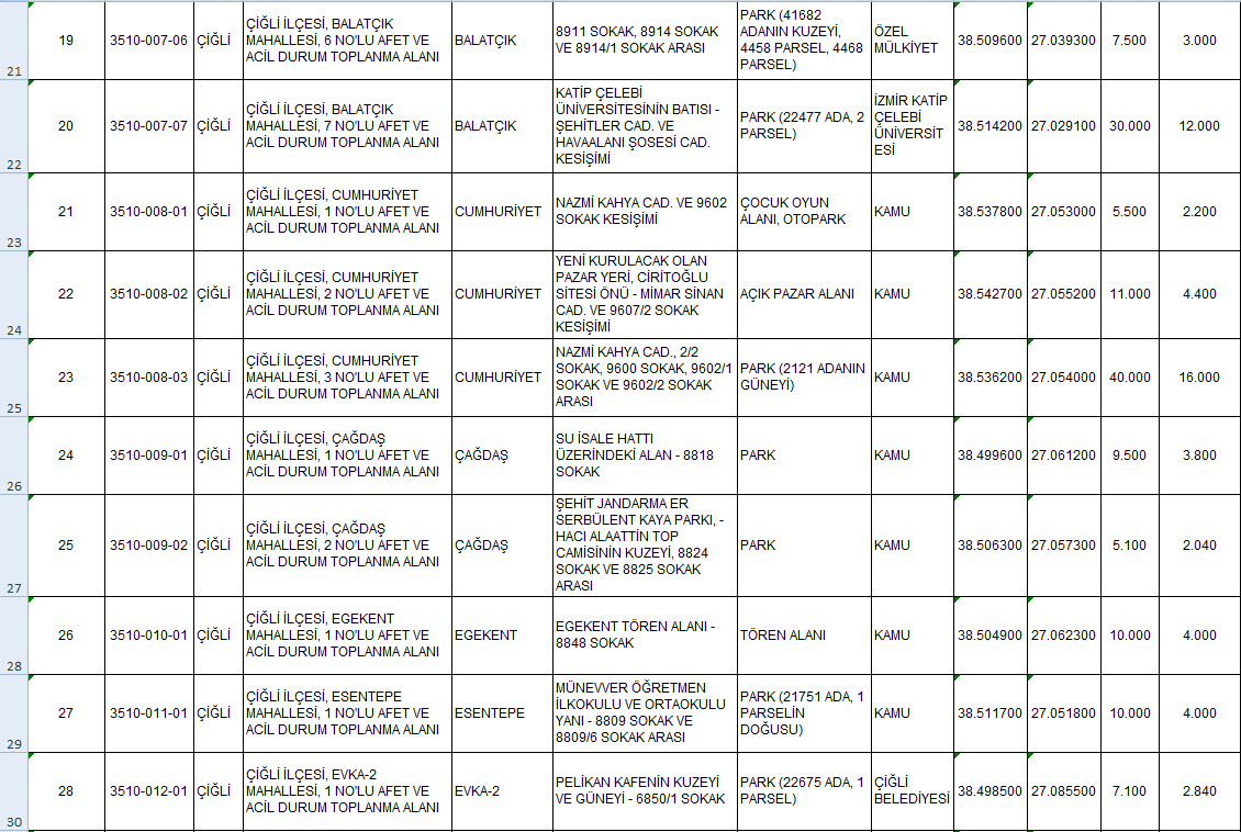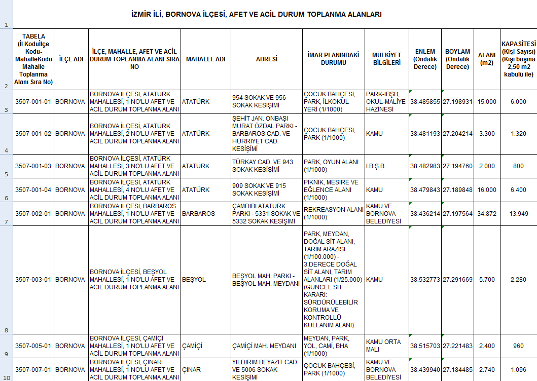 İzmir'de olası bir afet sonrası toplanma alanlarının (korunaklı alanlar) ilçe ilçe, mahalle mahalle listesi...