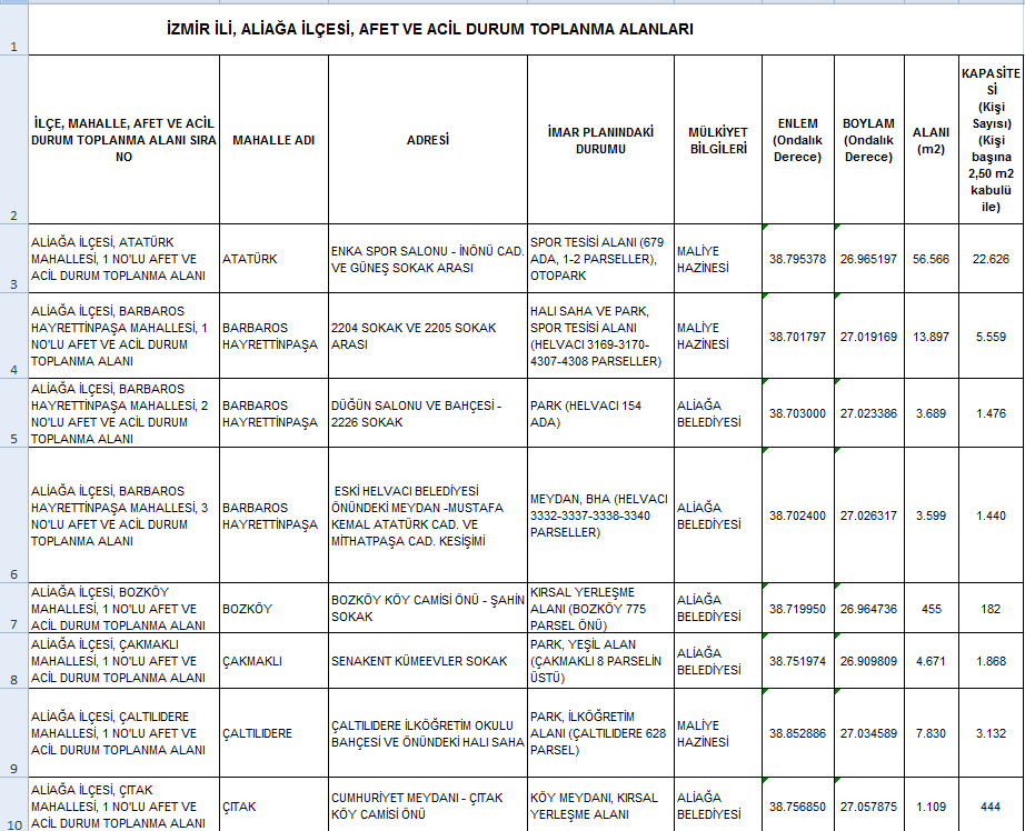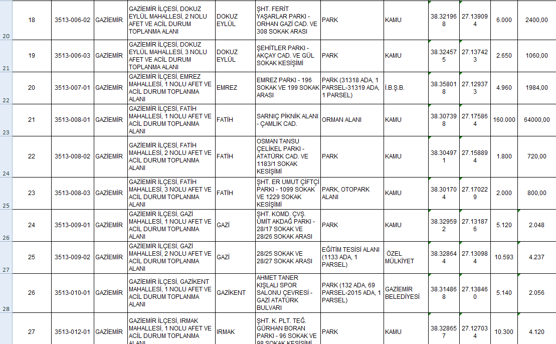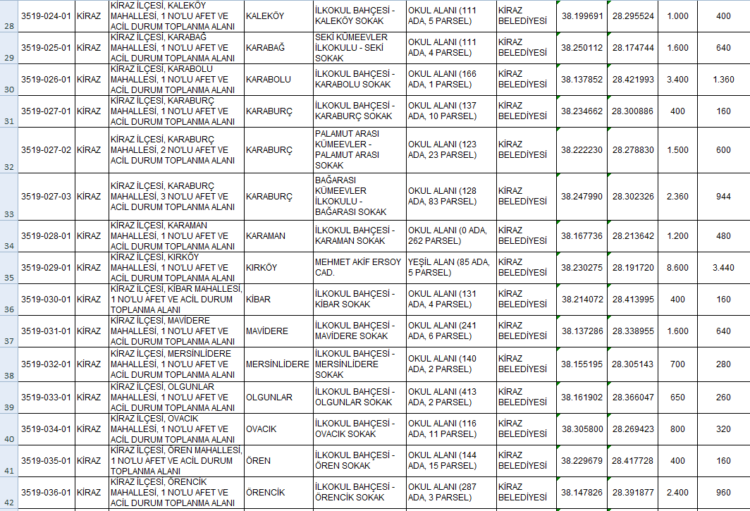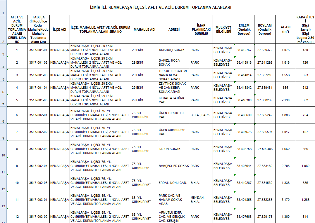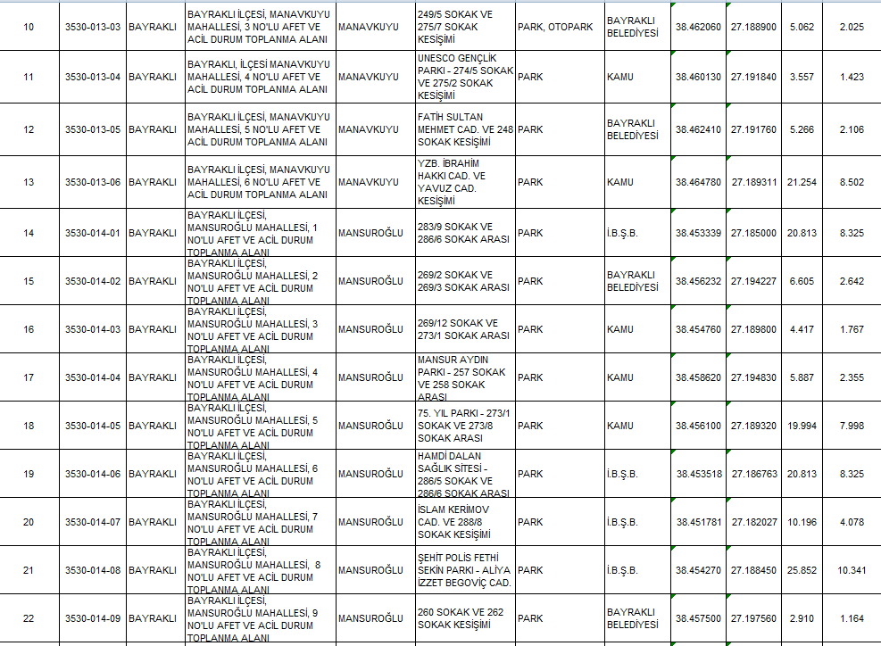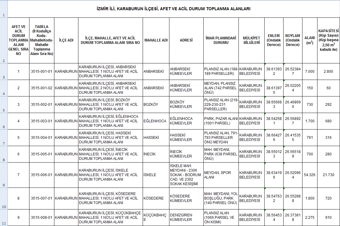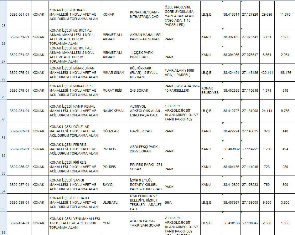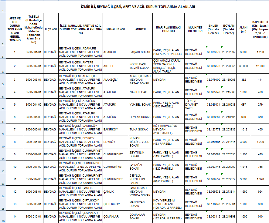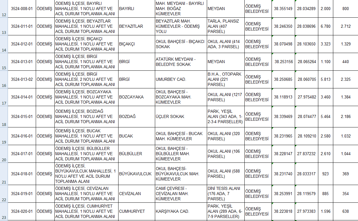 İzmir'de olası bir afet sonrası toplanma alanlarının (korunaklı alanlar) ilçe ilçe, mahalle mahalle listesi...