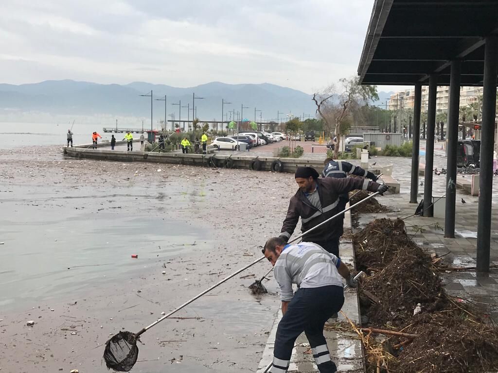 Körfez Denetim ekibi ise Körfez'e derelerden gelen yüzer çöpleri temizledi. Mavi Körfez 2 ve Mavi Körfez 3 deniz süpürge gemileri ve 15 kişilik kara çöp toplama ekibi, Bostanlı ve Karşıyaka’da 25 ton çöp topladı.