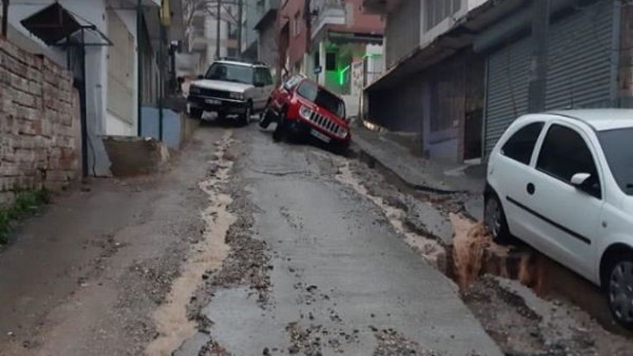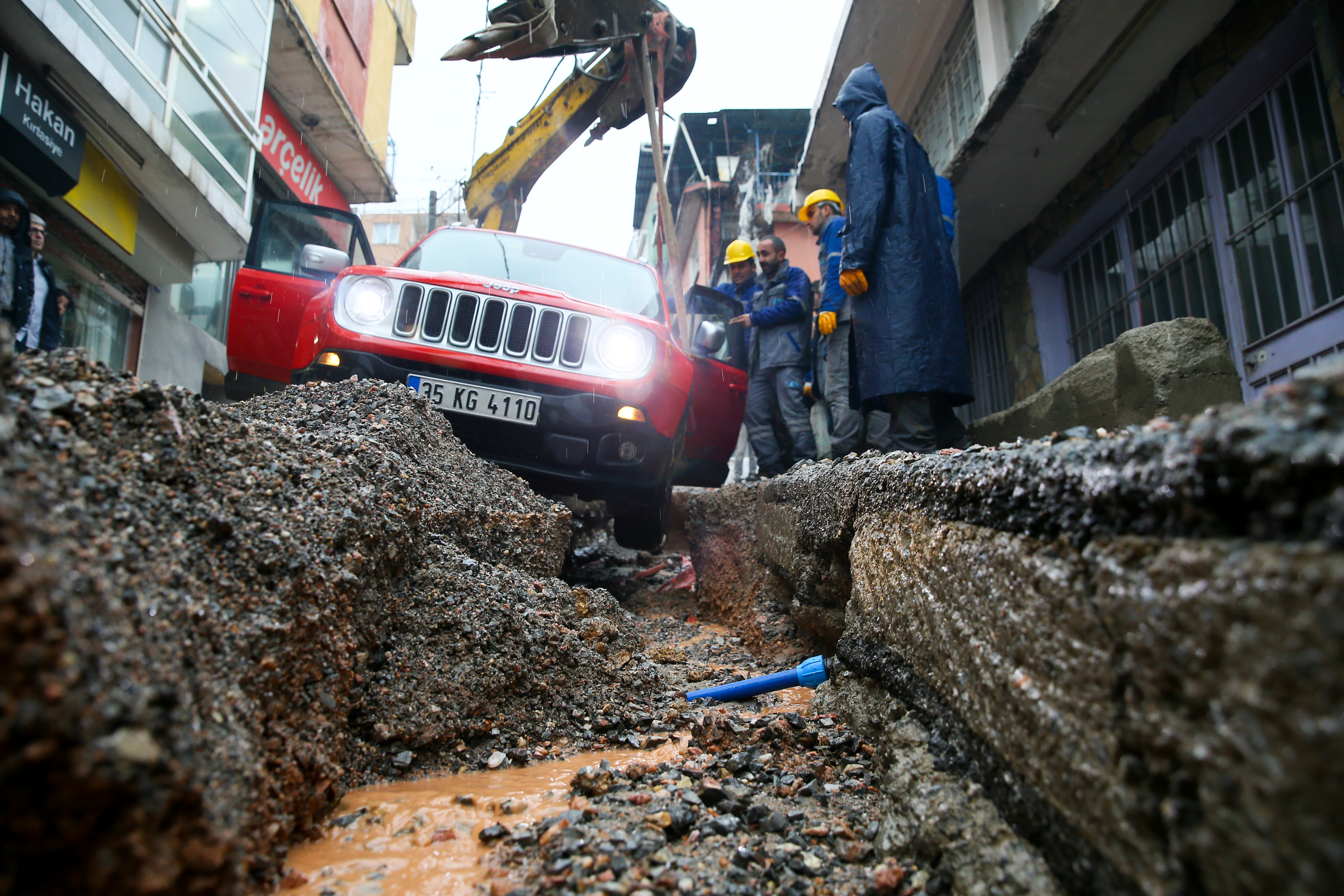 İzmir'in Bayraklı ilçesinde, etkisini artıran sağanak nedeniyle sokakta çökme meydana gelirken, bazı araçlar oluşan çukura düştü. Mahalle halkı, her yağmurda benzer görüntülerin yaşandığı belirterek, çözüm bulunmasını istedi.