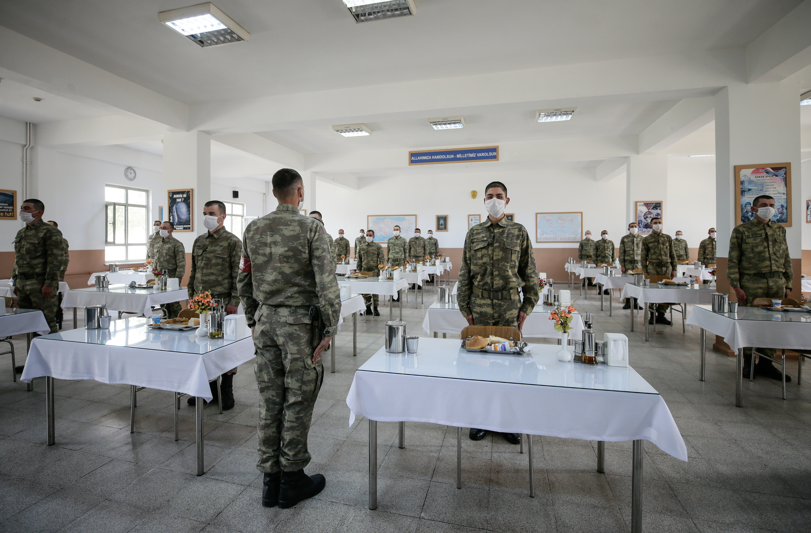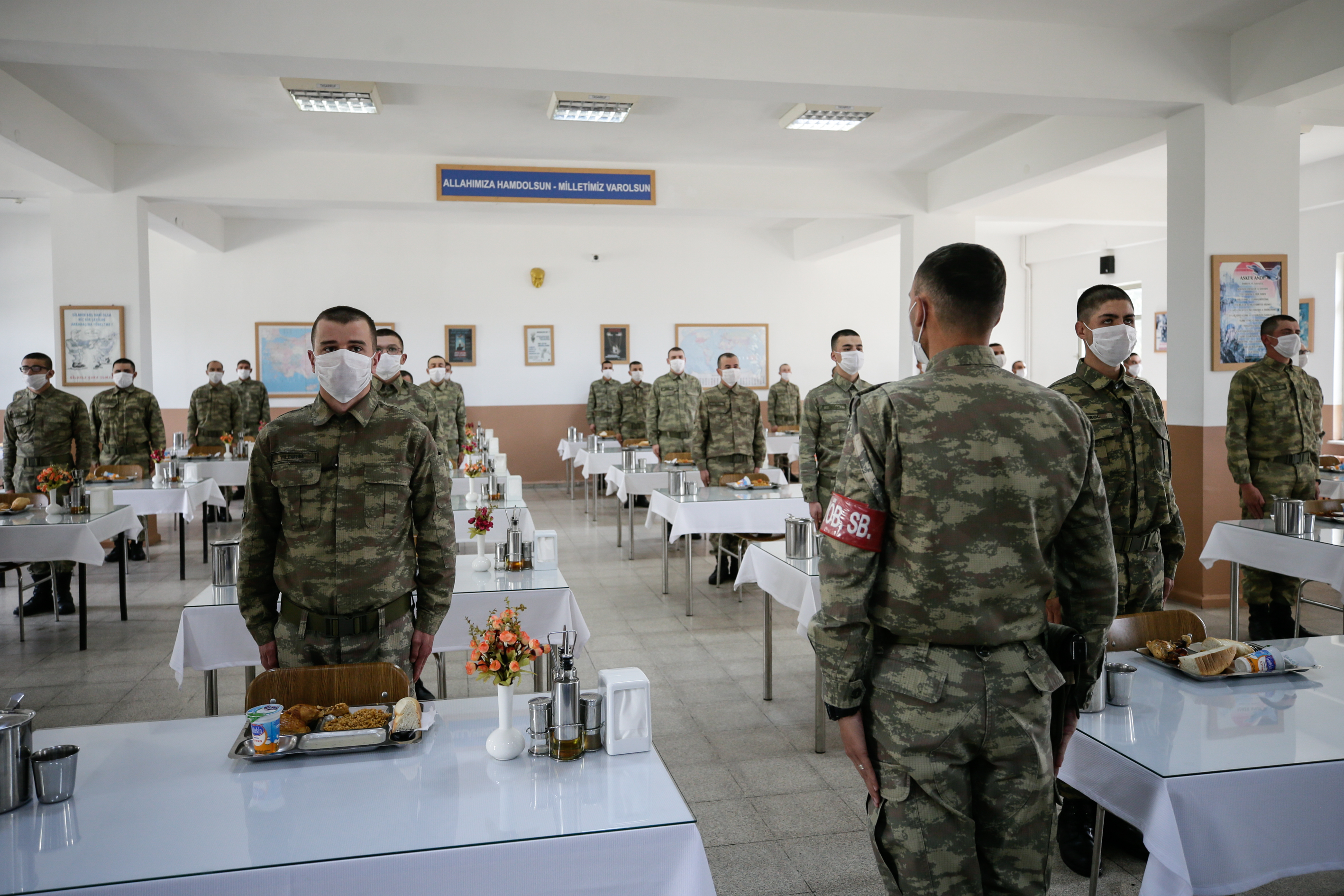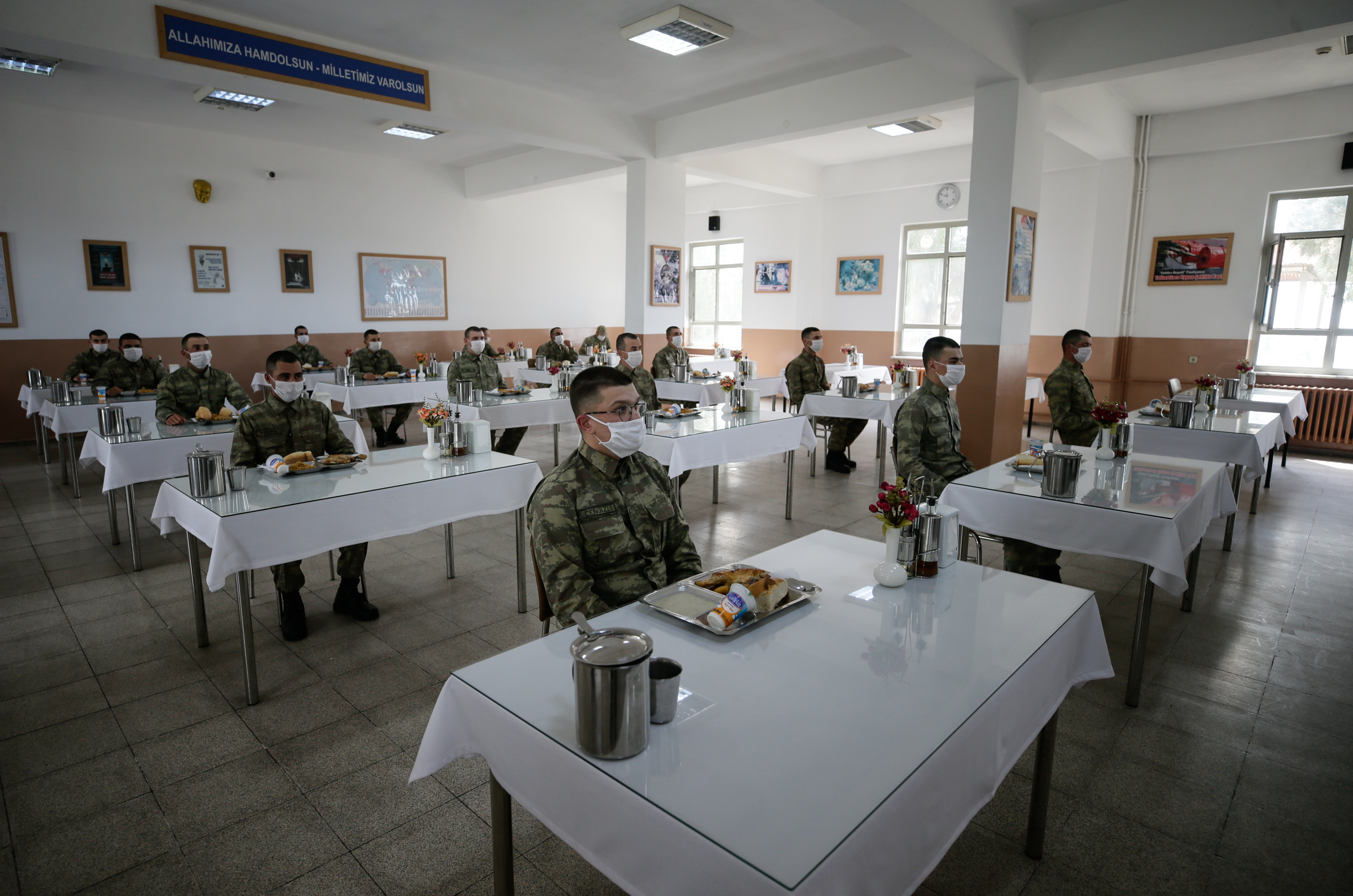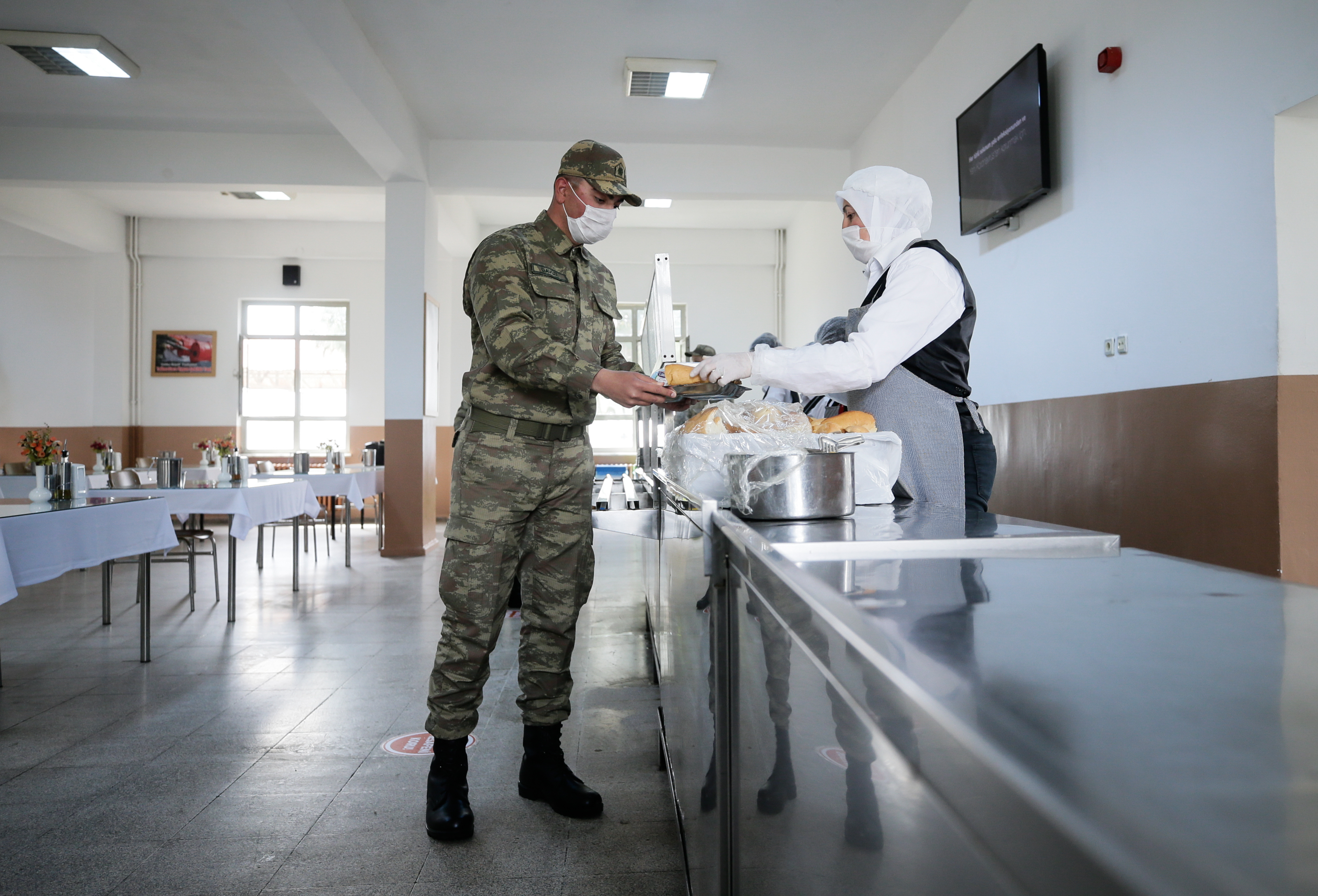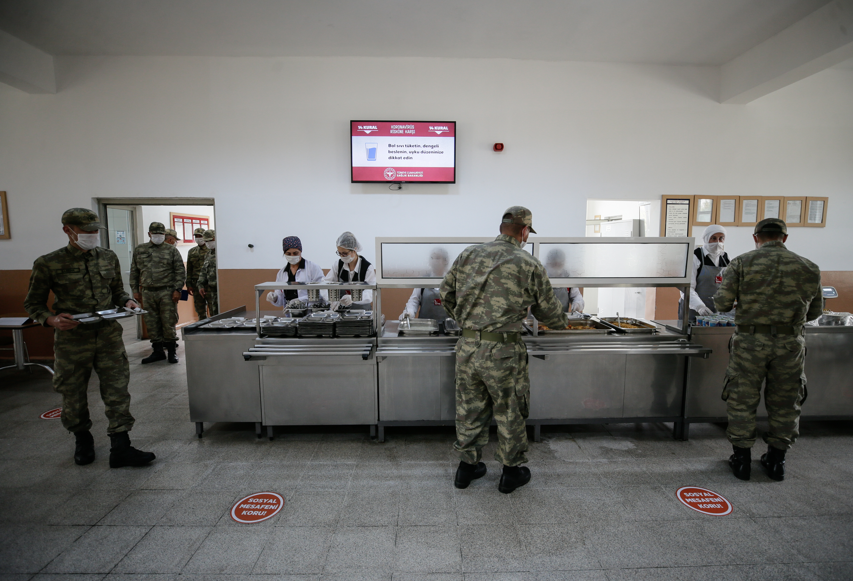 Askerlerin gruplar halinde yemekhaneye girmeleri ve sosyal mesafeyi koruyacak şekilde her masada bir kişi oturmaları sağlanıyor.