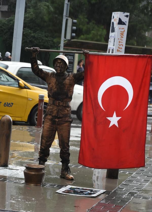 Mevsim normallerinin üzerinde sıcaklıkların yaşanmasından sonra İzmir'de yağmurlu günler başladı. Zaman zaman güneşin açmasıyla, kimi İzmirliler sevdikleriyle romantik anlar, kimisi de şemsiyelerinin altında günlük işlerinin koşuşturmasını yaşadı. Yağmur altında olmasına rağmen mesleğini icra edip performansını sergileyen canlı mankeni, bazı vatandaşlar şemsiyelerinin altında ilgiyle izledi. (DHA)