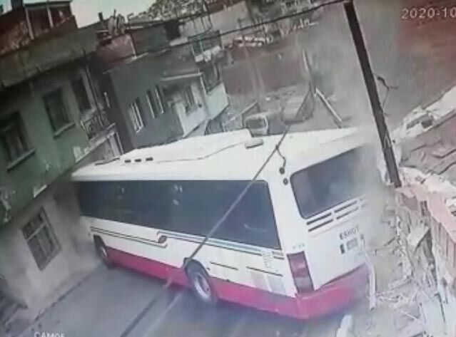 Zeytinlik Mahallesi 1171 Sokak'ta yol alan ESHOT otobüsü, yoldaki su birikintisi nedeniyle kontrolden çıkarak kaydı ve sokak üzerindeki evlere çarptı.