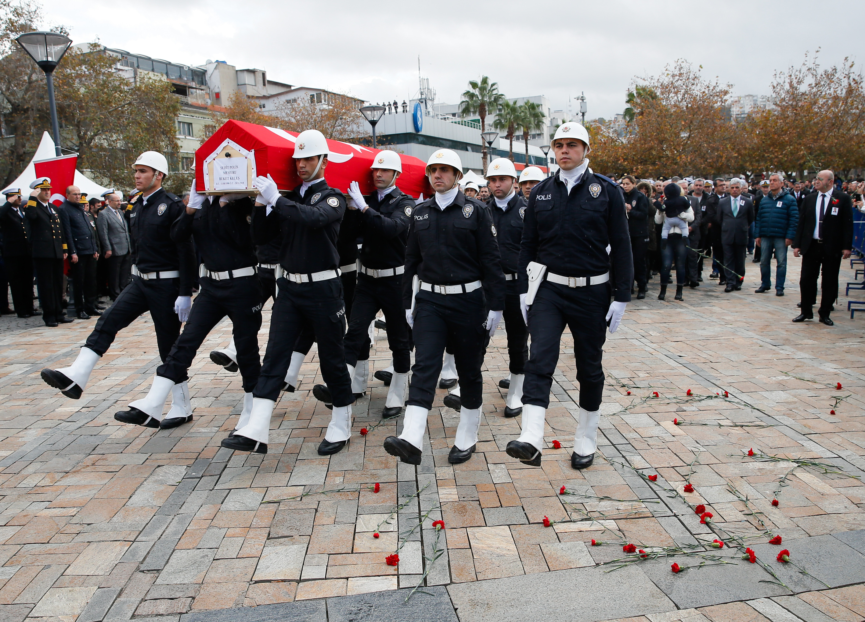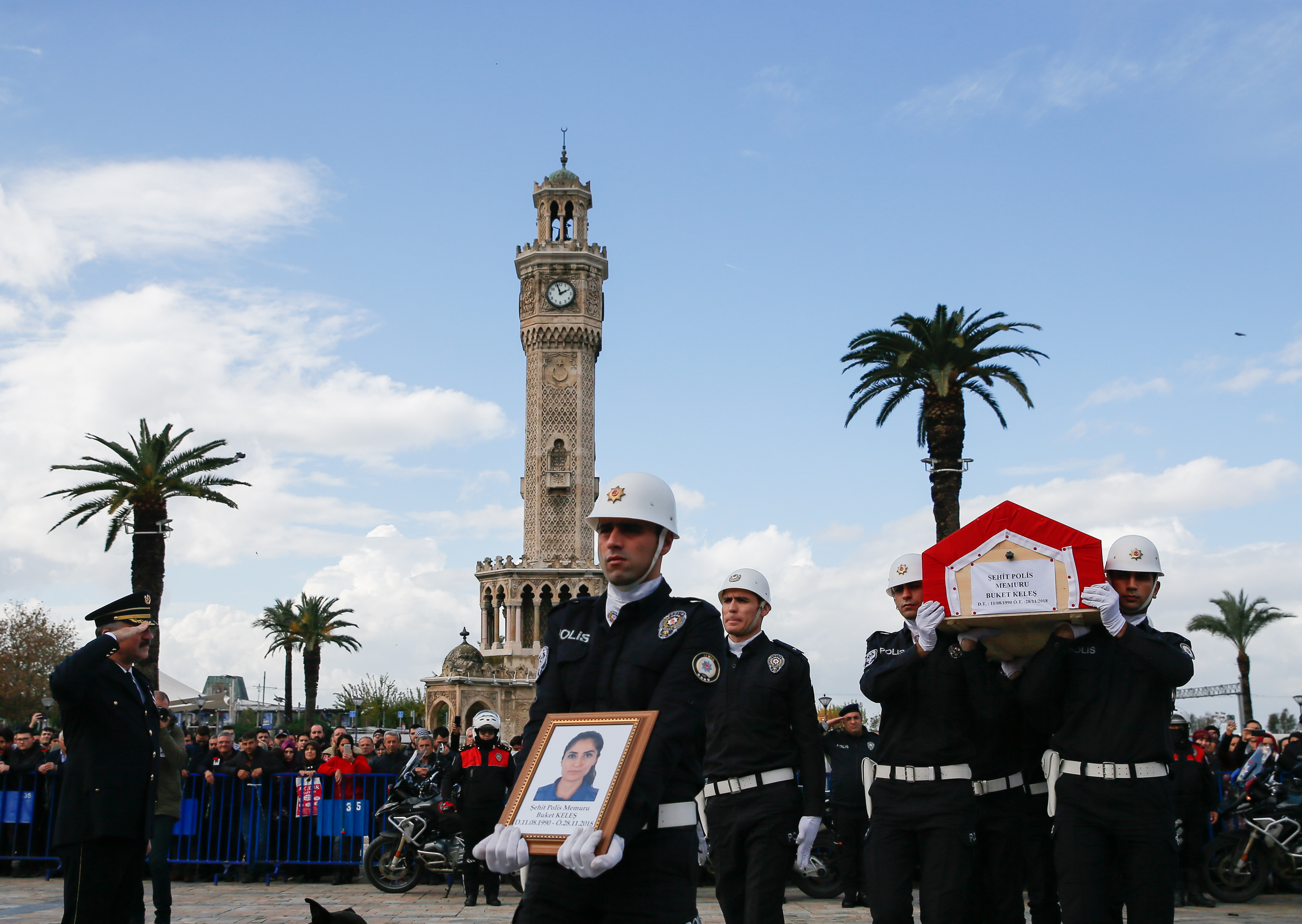 İzmir'in Gaziemir ilçesinde, uyuşturucunun etkisindeki sürücünün kullandığı aracın çarpması sonucu kaldırıldığı hastanede 8 gün sonra hayatını kaybeden polis memuru Buket Keleş için İzmir Valiliği önünde tören düzenlendi.