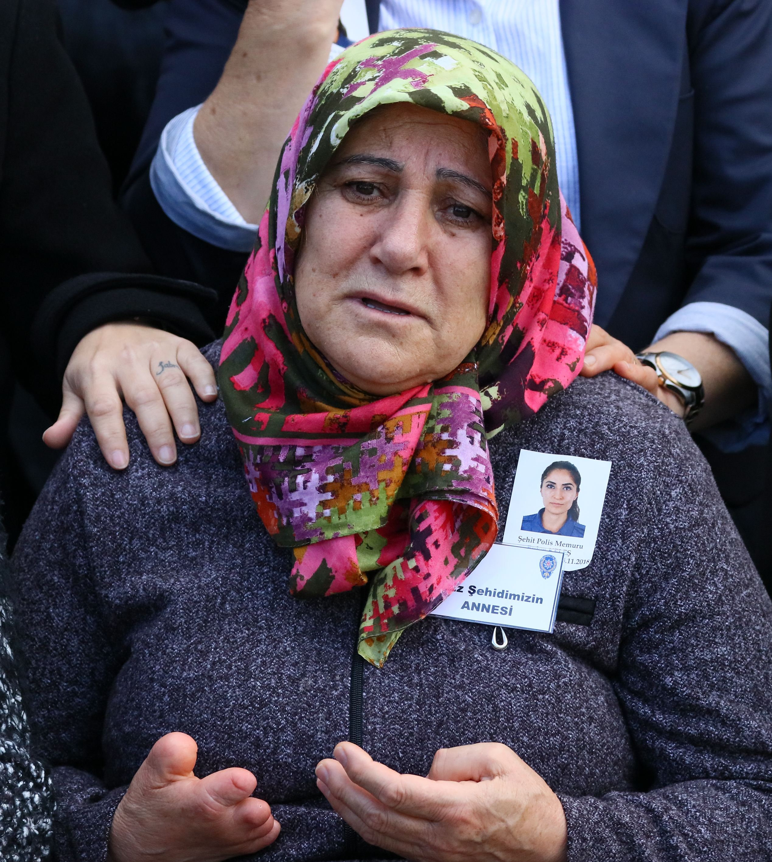 Daha sonra şehidin naaşı, dualar eşiliğinde omuzlarda taşınarak tören mangası eşiliğinde cenaze aracına götürüldü. Bu sırada, şehidin kız kardeşi Dilek Tuna, bir polis memurunun şapkasını başına taktı.