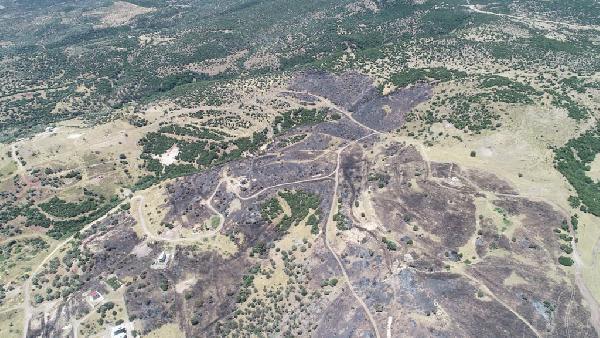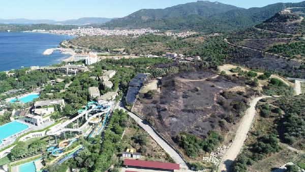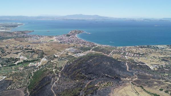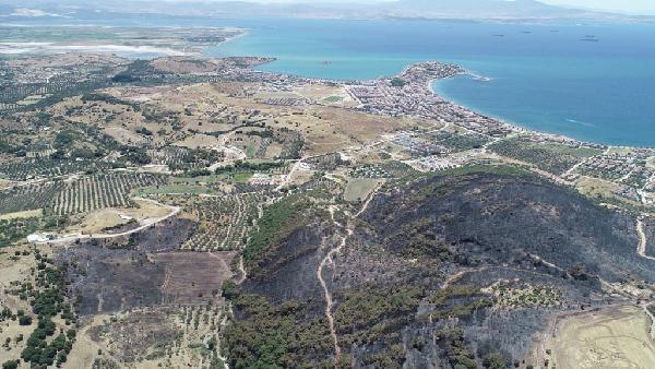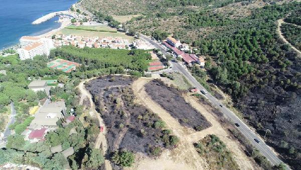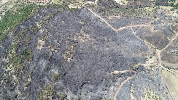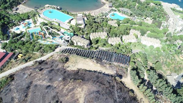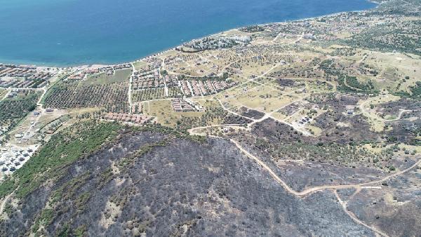 Bölgede, ilk belirlemelere göre, alevlerin sardığı 10 hektarlık alan yandı. Yangının kül ettiği bölge, DHA ekibince drone ile havadan görüntülendi. Tatil beldesinin sahile bakan yamaçlarının simsiyah olduğu görüldü.