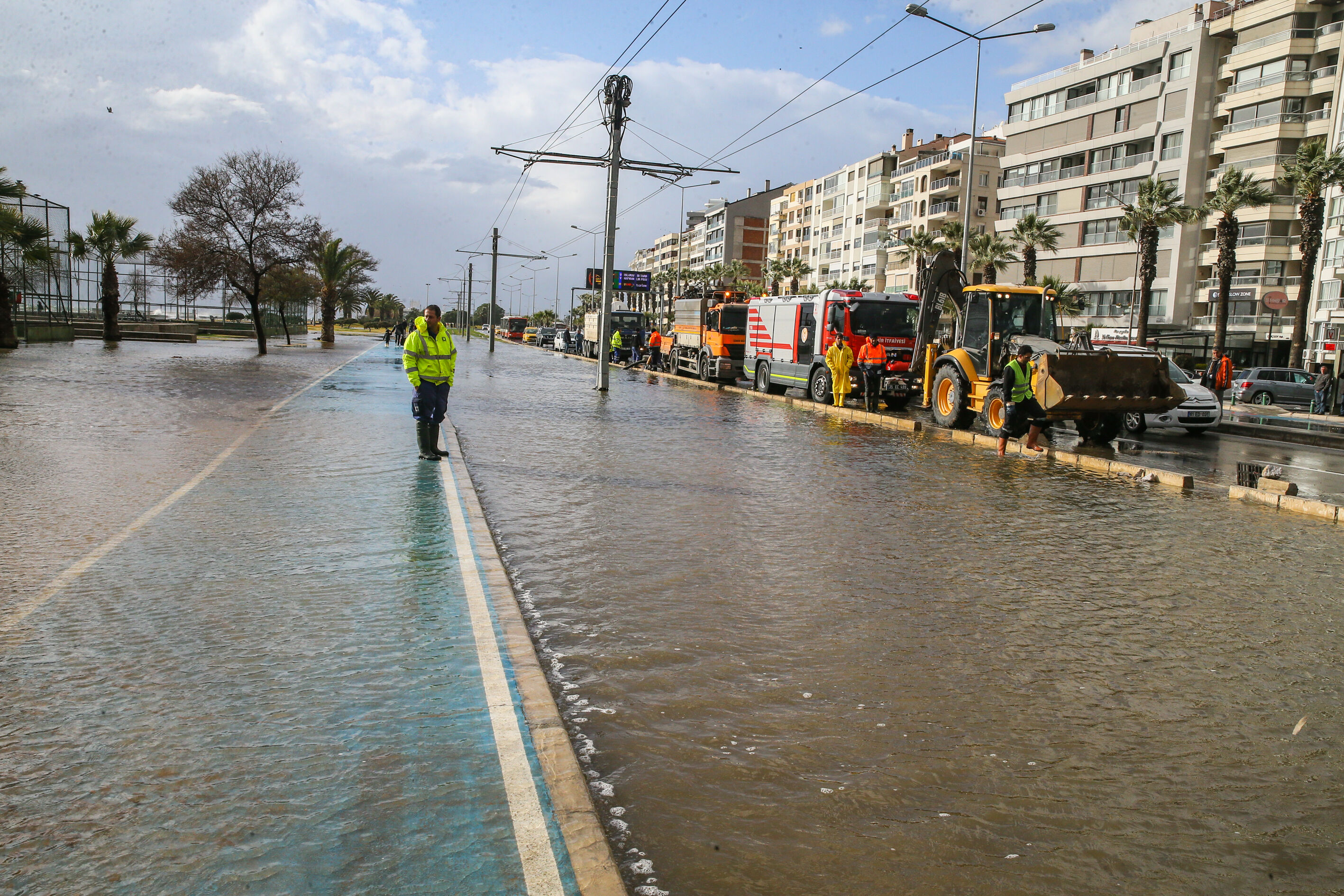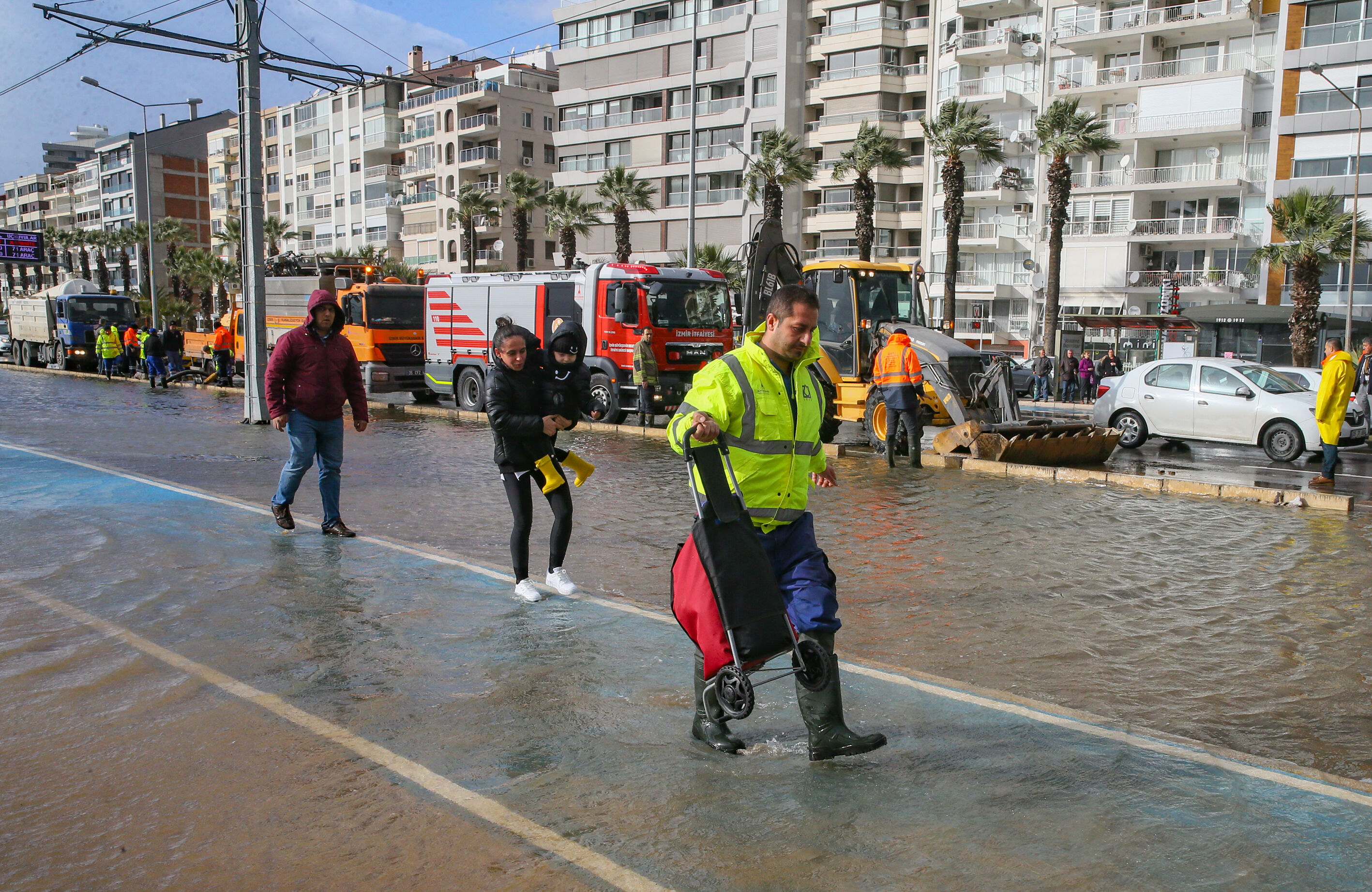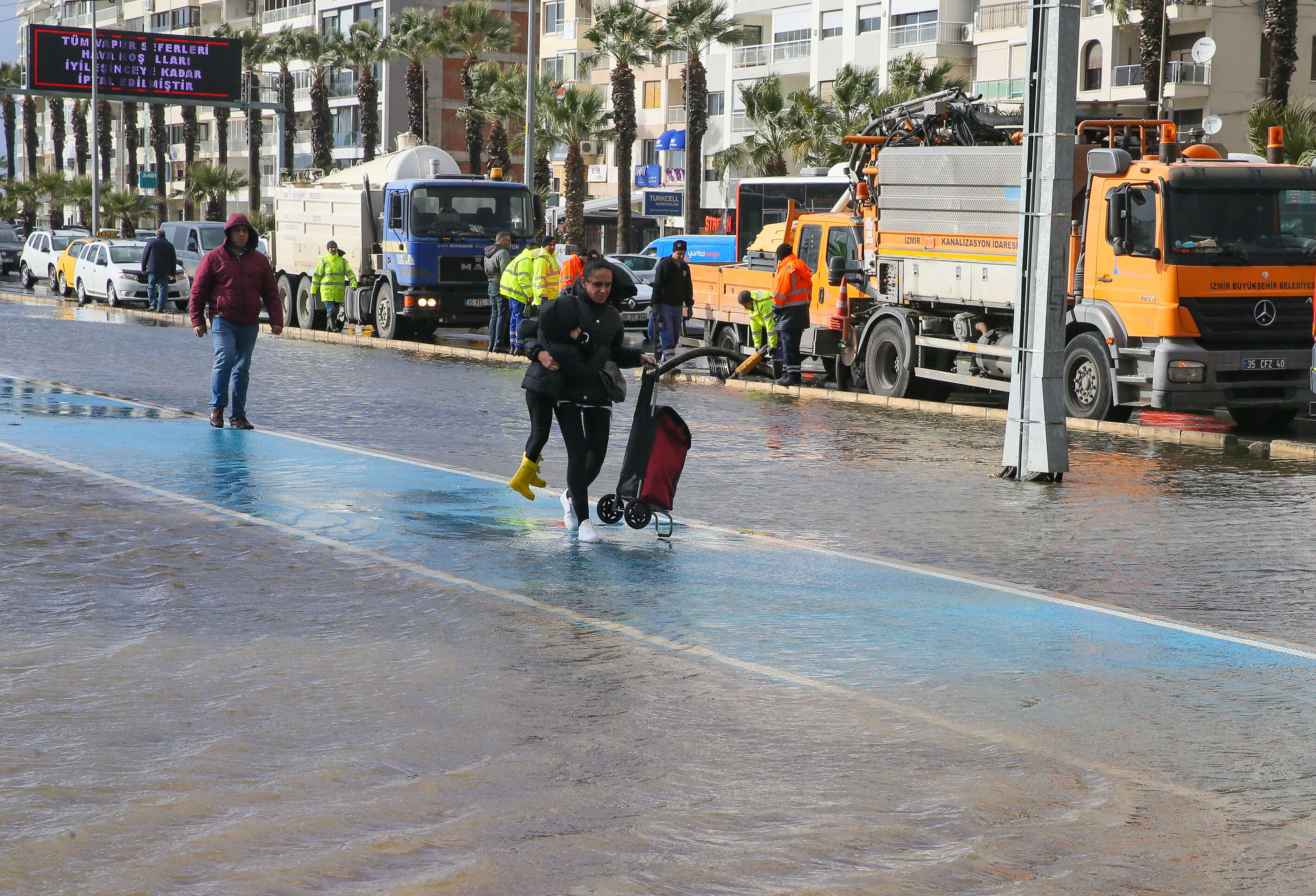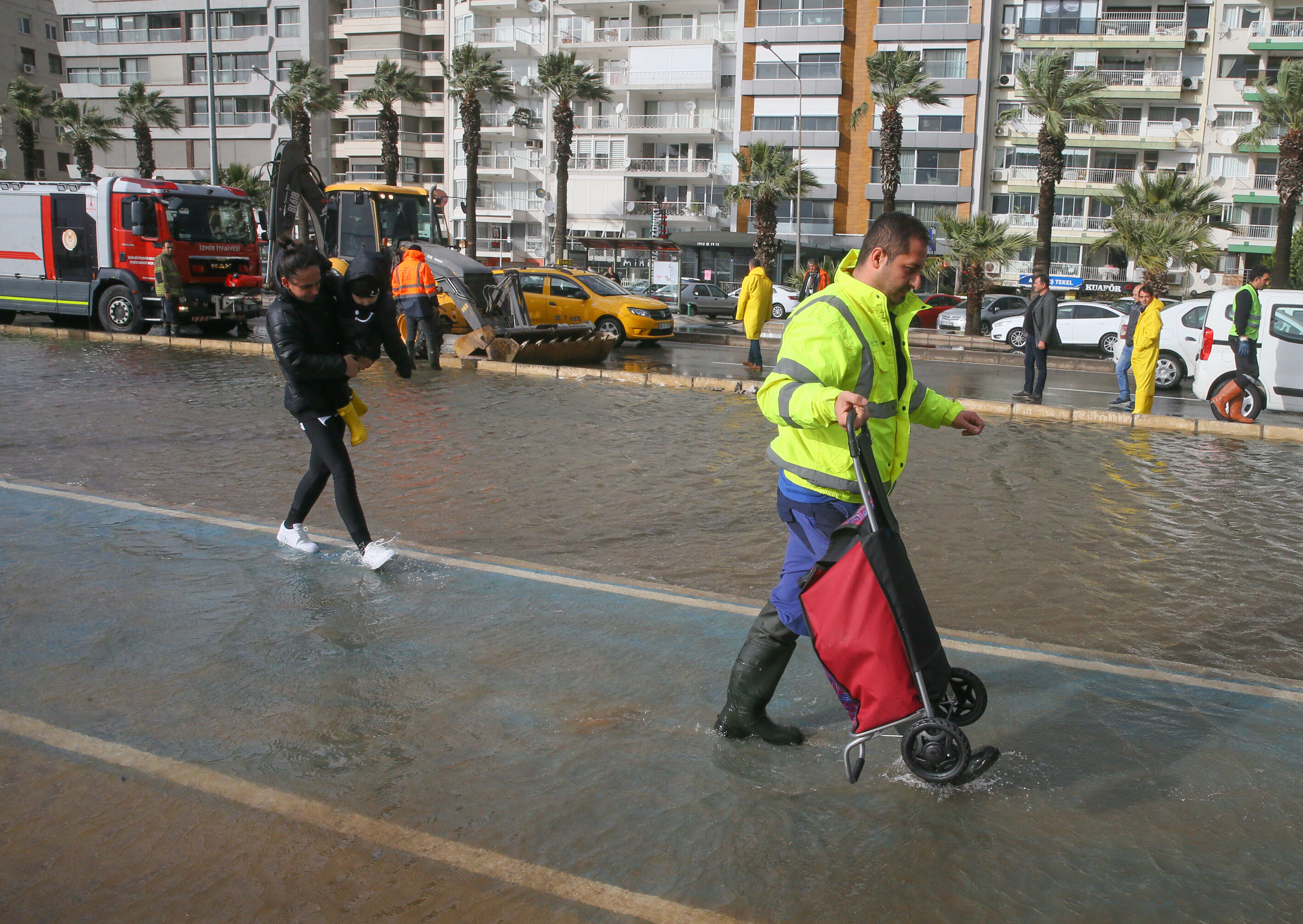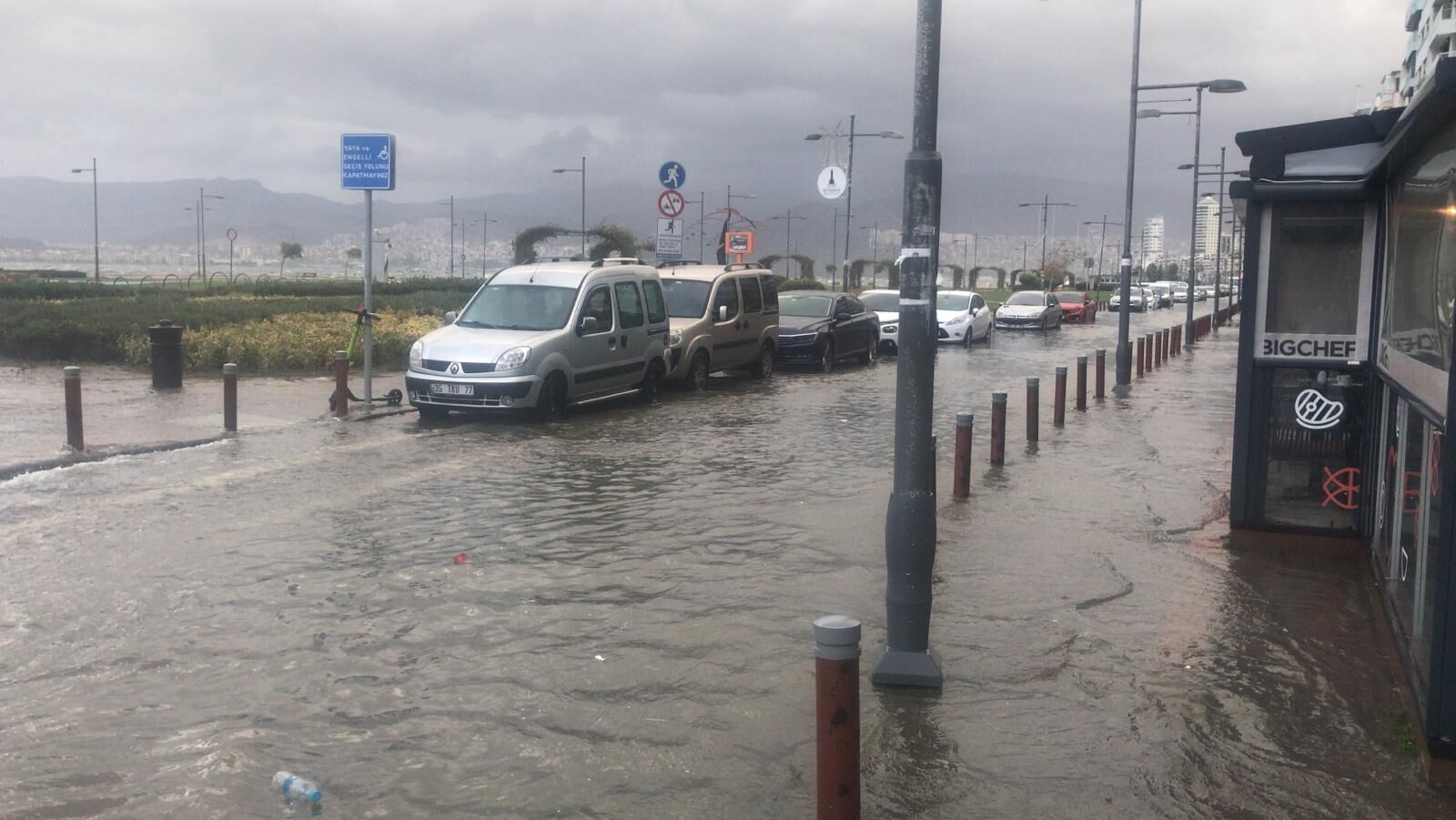 İzmir Birinci Kordon da yağmur ve deniz suyuyla doldu. Cumhuriyet ve Gündoğdu meydanları su altında kaldı. Esnaf, tentelerinin uçmaması için önlem aldı. Yağış, trafikte aksamalara neden oldu.