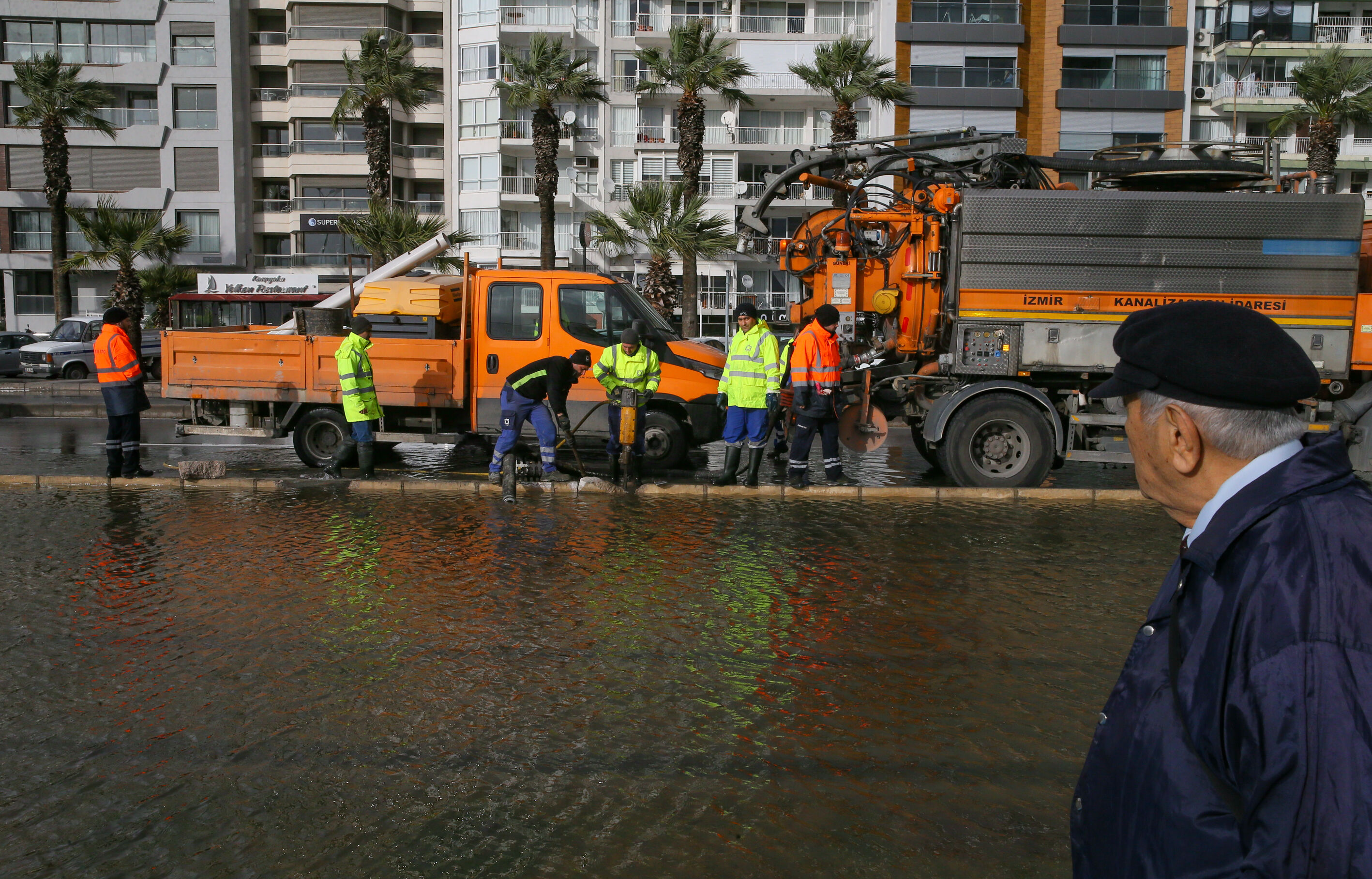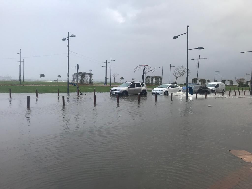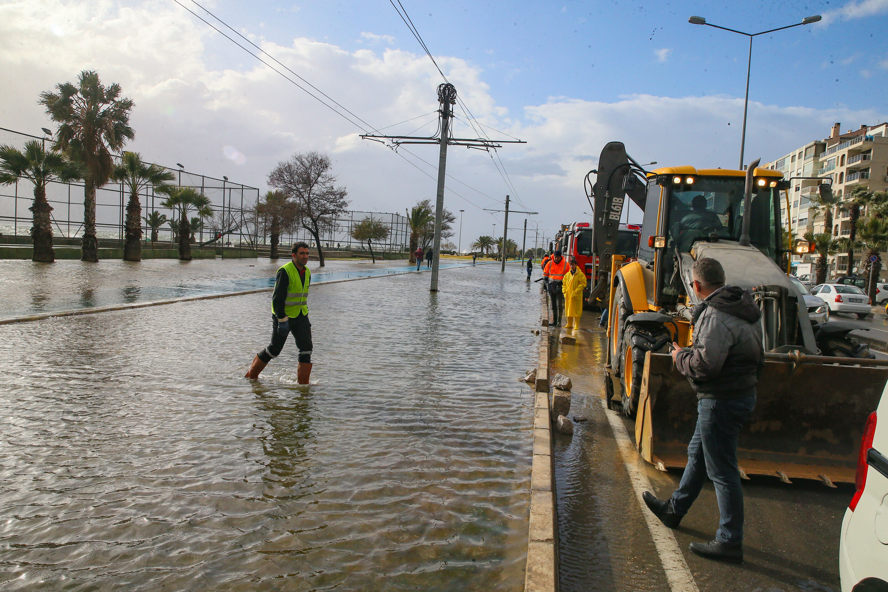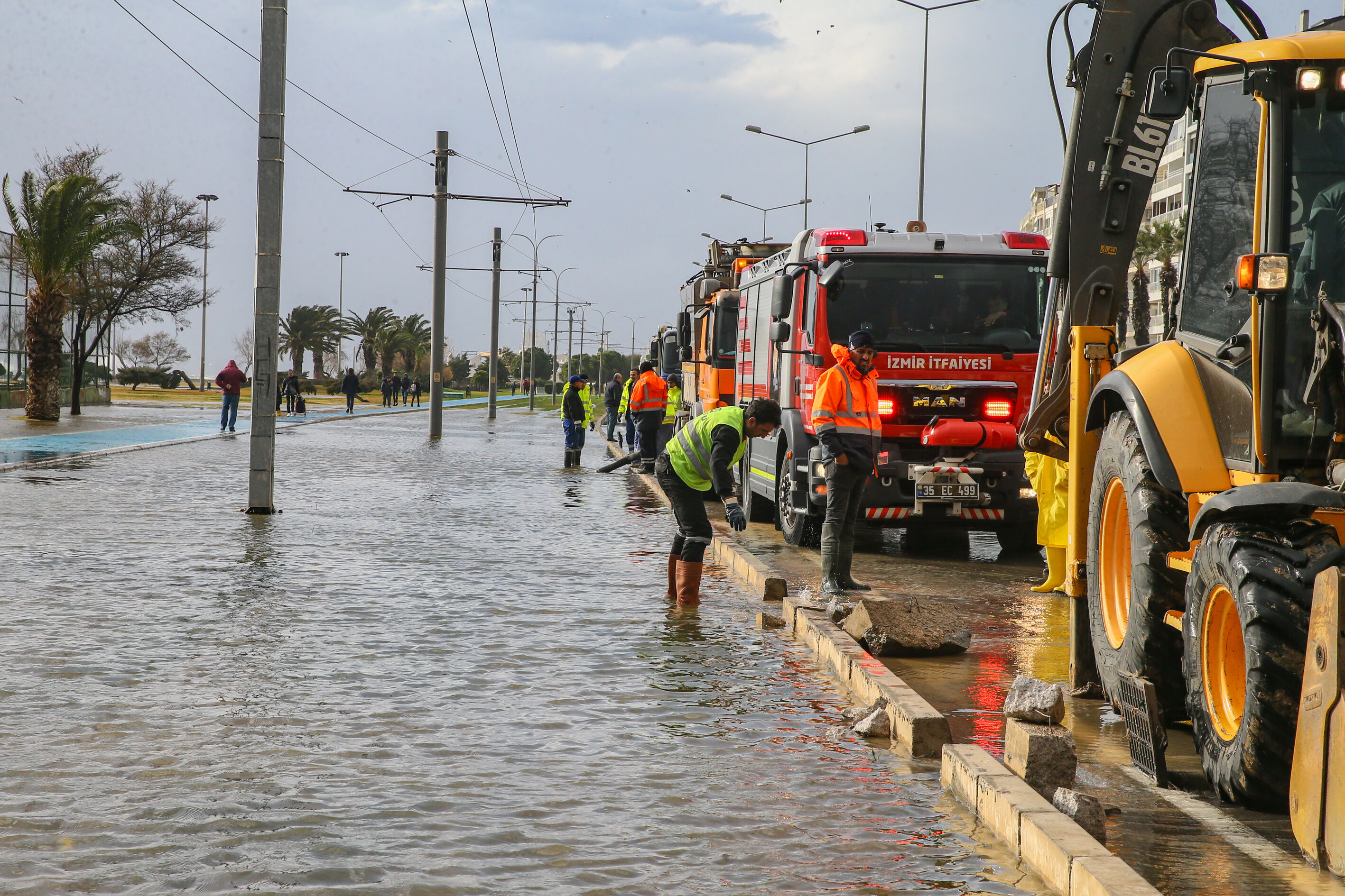 İzmir Birinci Kordon da yağmur ve deniz suyuyla doldu. Cumhuriyet ve Gündoğdu meydanları su altında kaldı. Esnaf, tentelerinin uçmaması için önlem aldı. Yağış, trafikte aksamalara neden oldu.