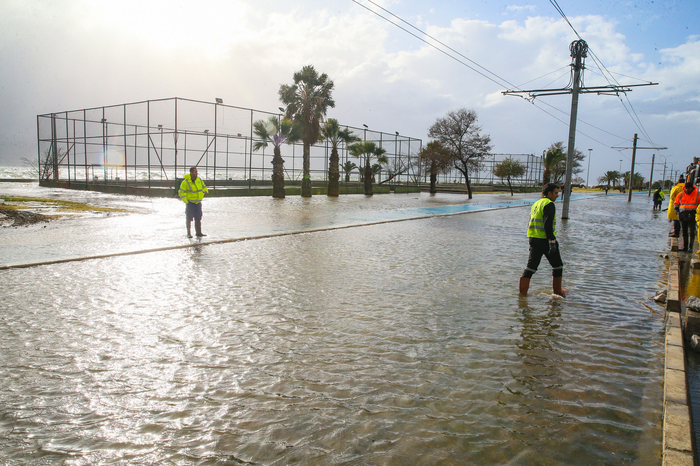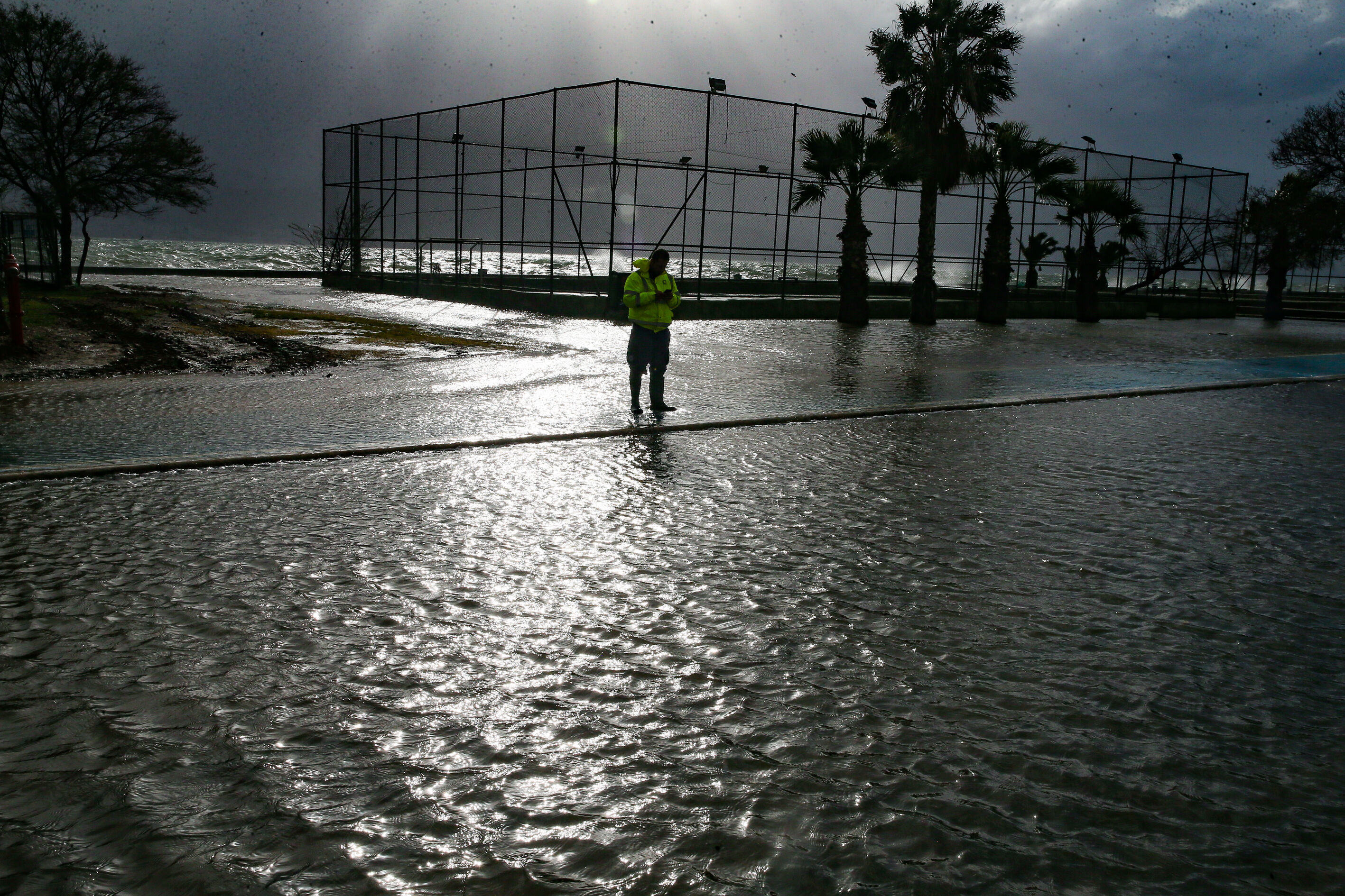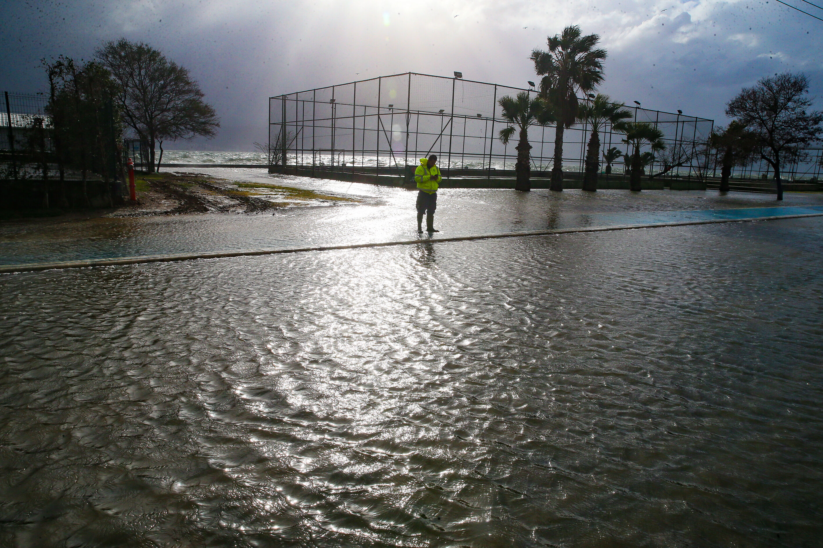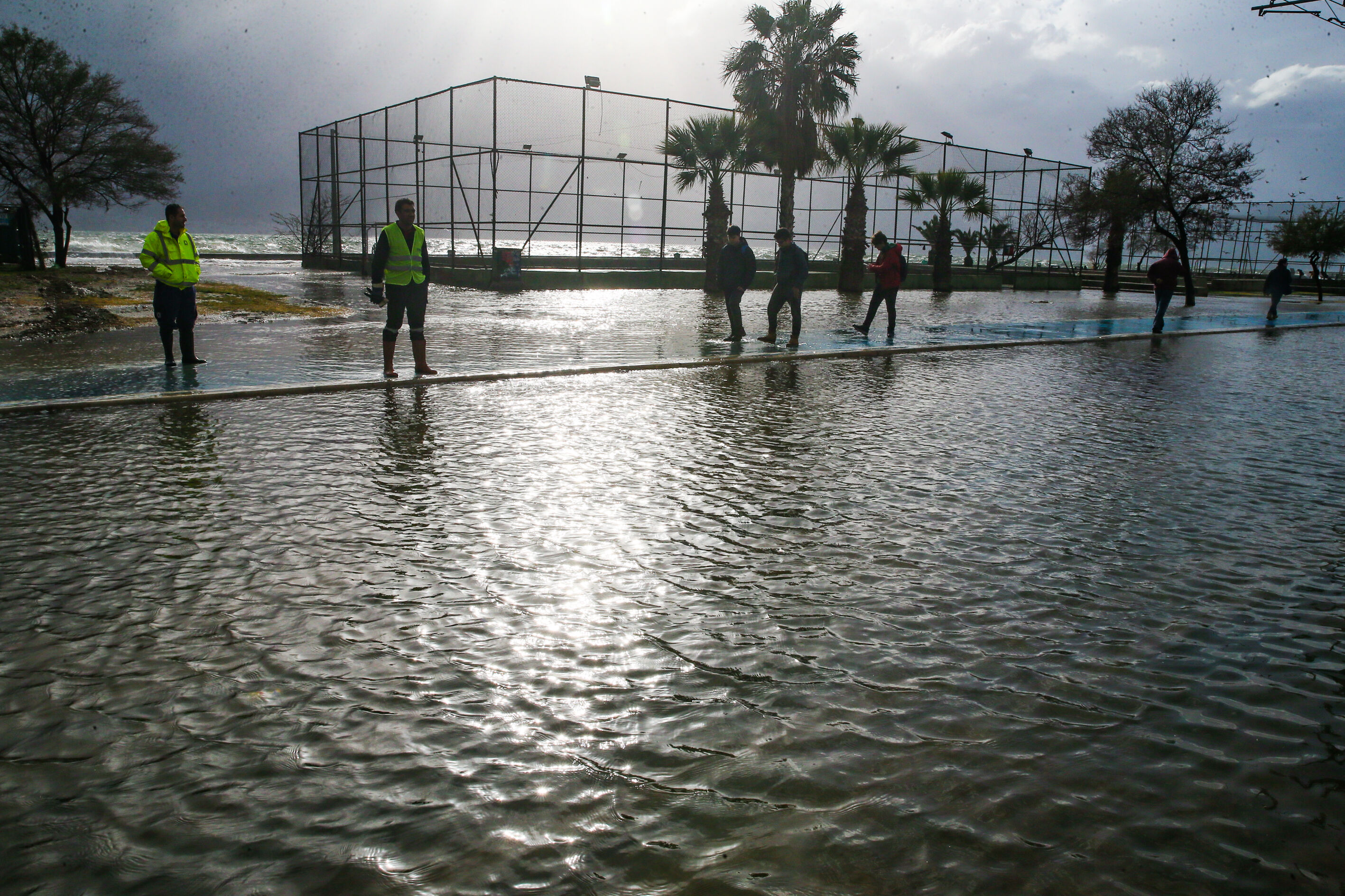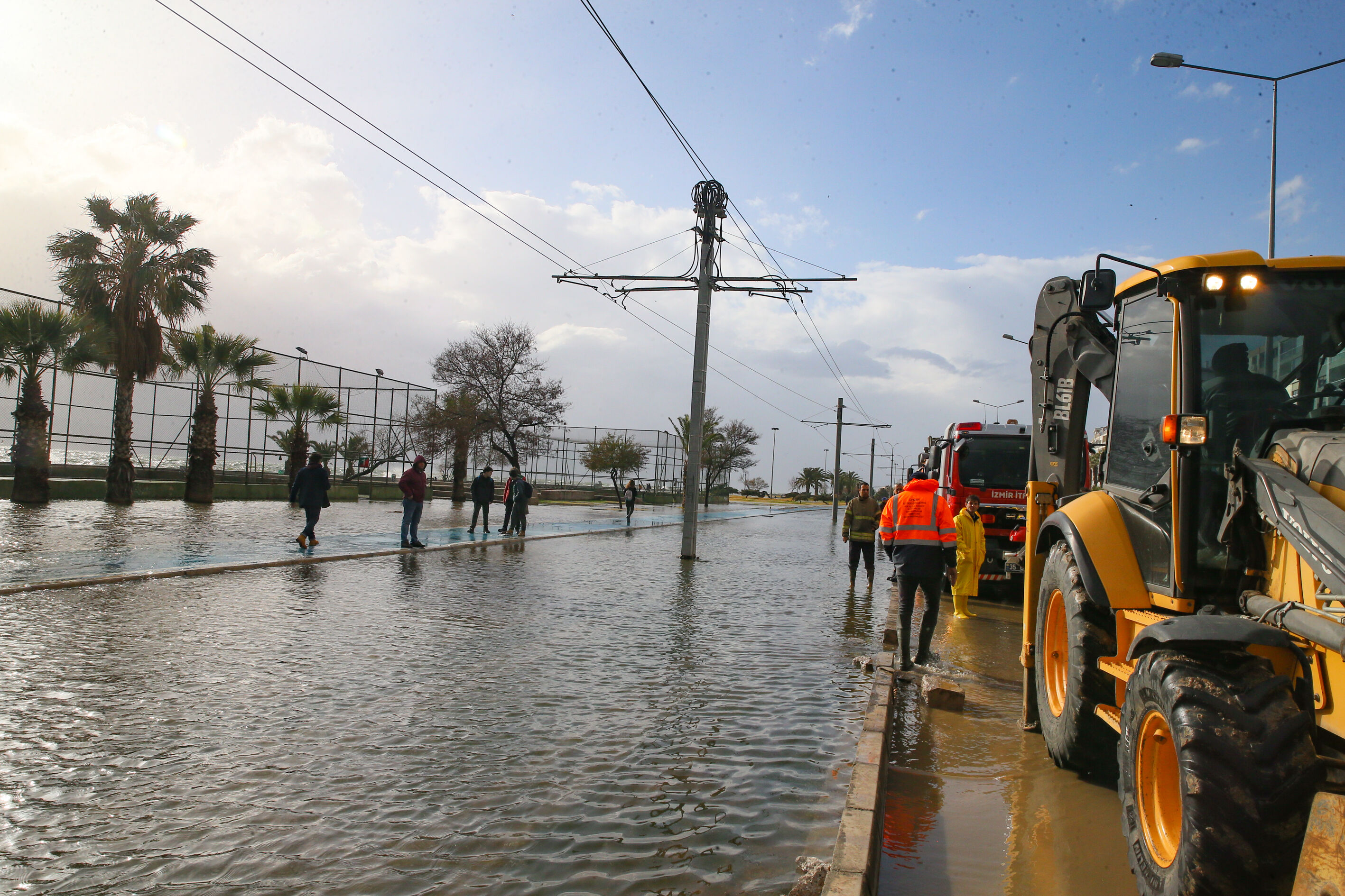 İzmir Birinci Kordon da yağmur ve deniz suyuyla doldu. Cumhuriyet ve Gündoğdu meydanları su altında kaldı. Esnaf, tentelerinin uçmaması için önlem aldı. Yağış, trafikte aksamalara neden oldu.