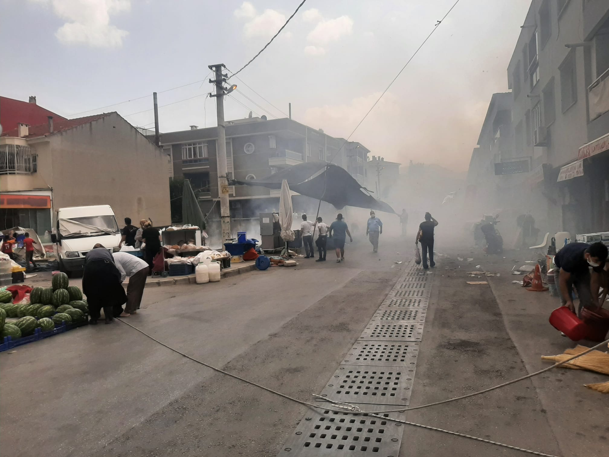 İzmir'de kısa süreli fırtına ve sağanak, bazı ilçelerde etkili oldu. Gaziemir 9 Eylül Mahallesindeki pazar yerinde fırtına nedeniyle elektrik tellerinden kaynaklanan bir yangın çıktı.