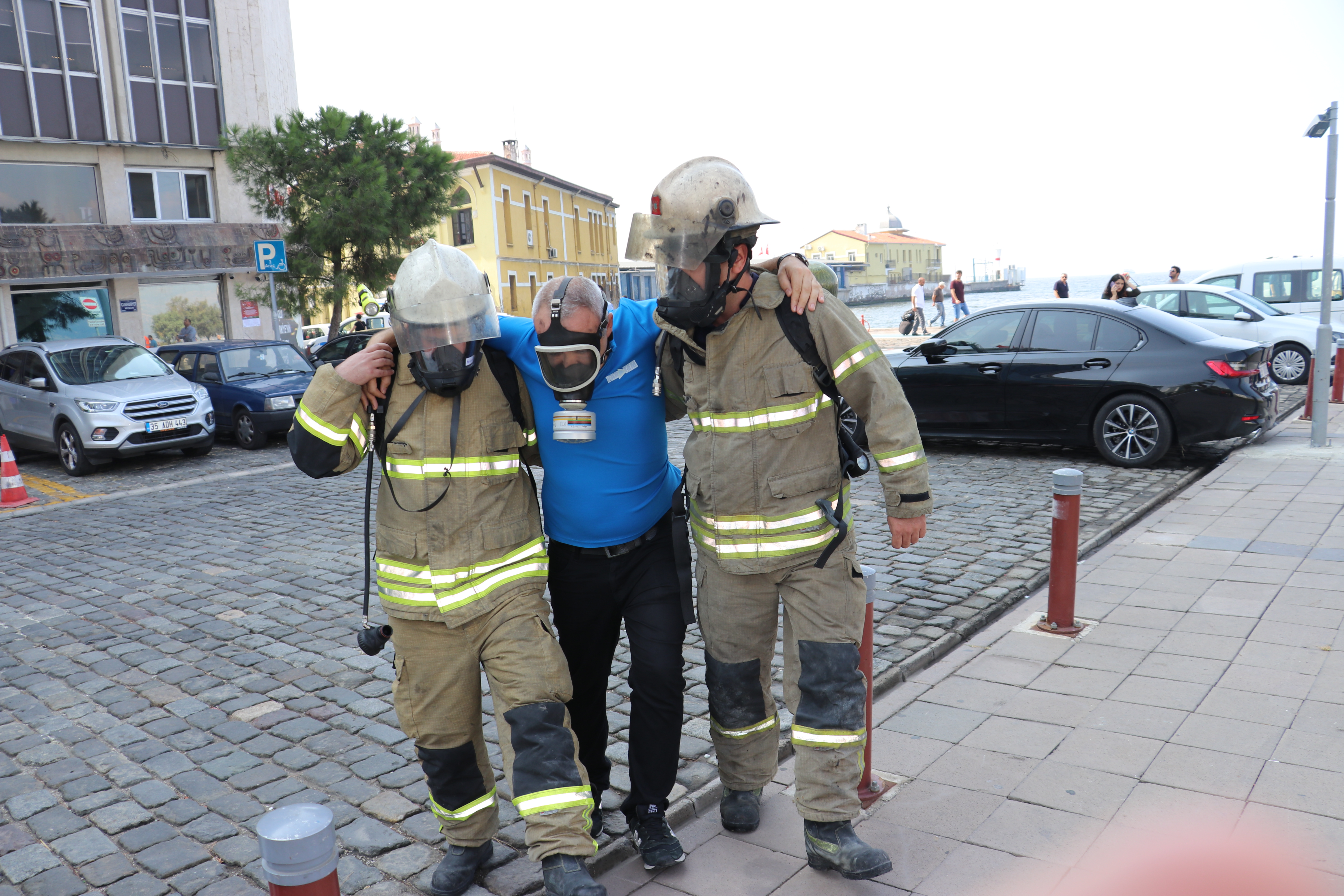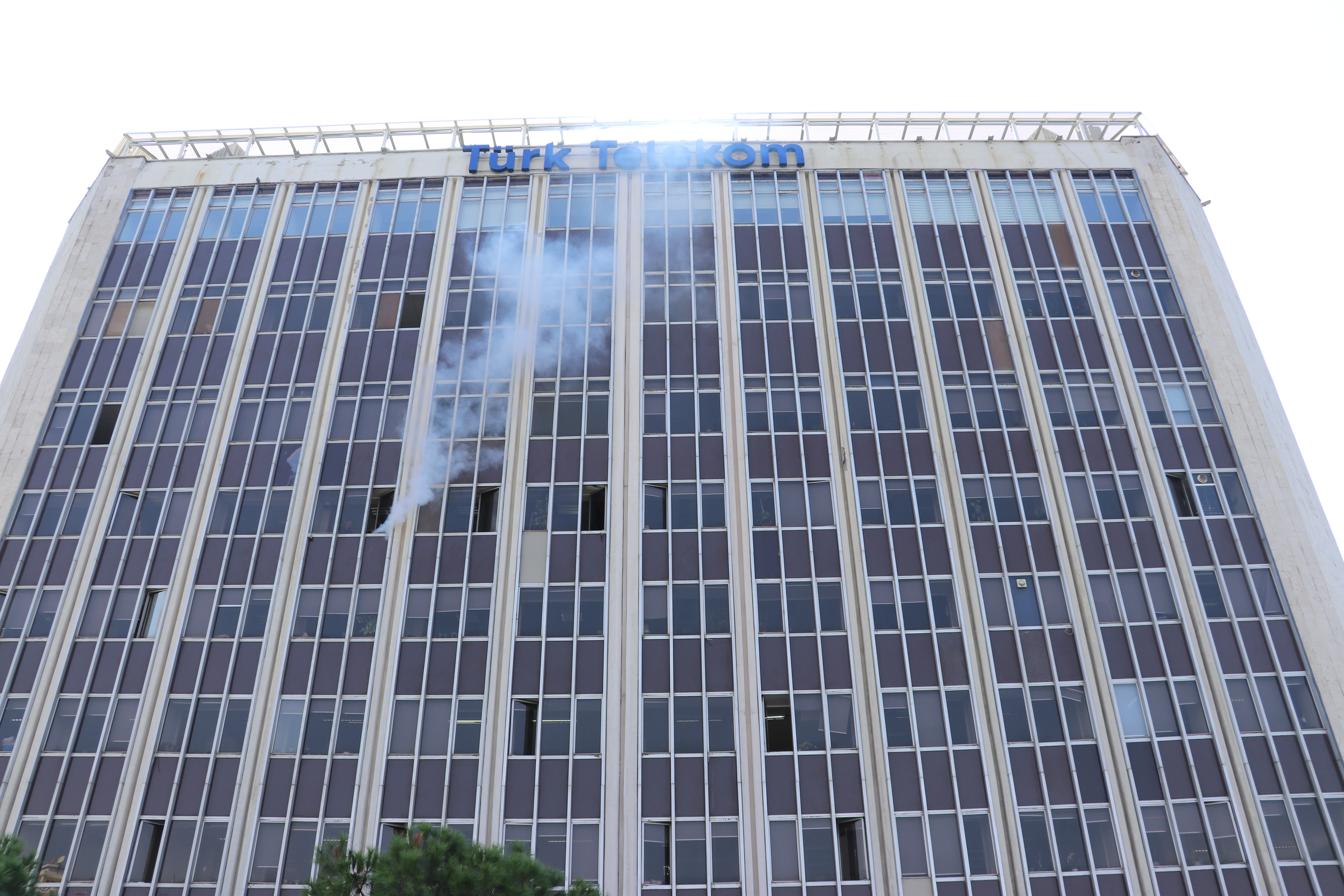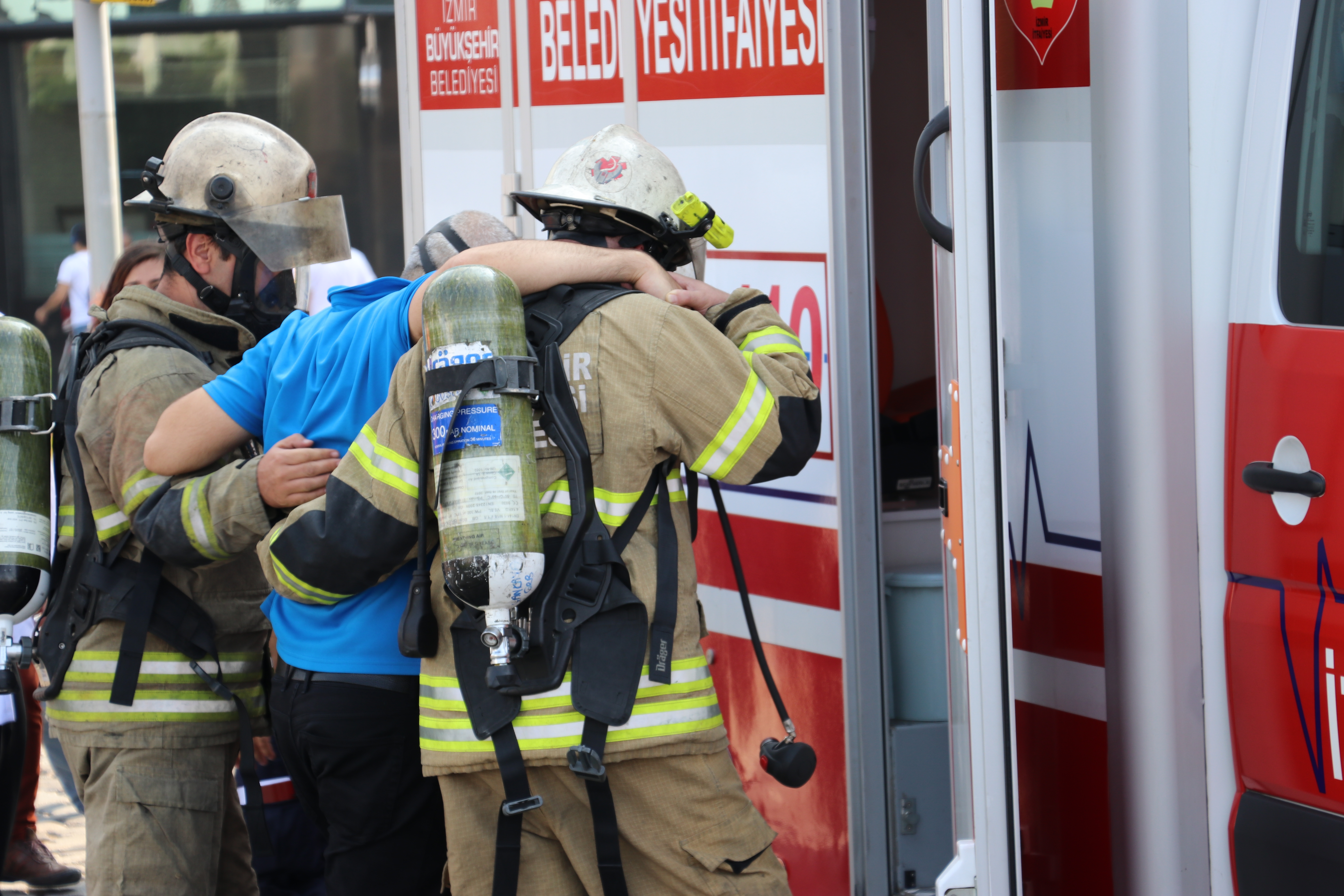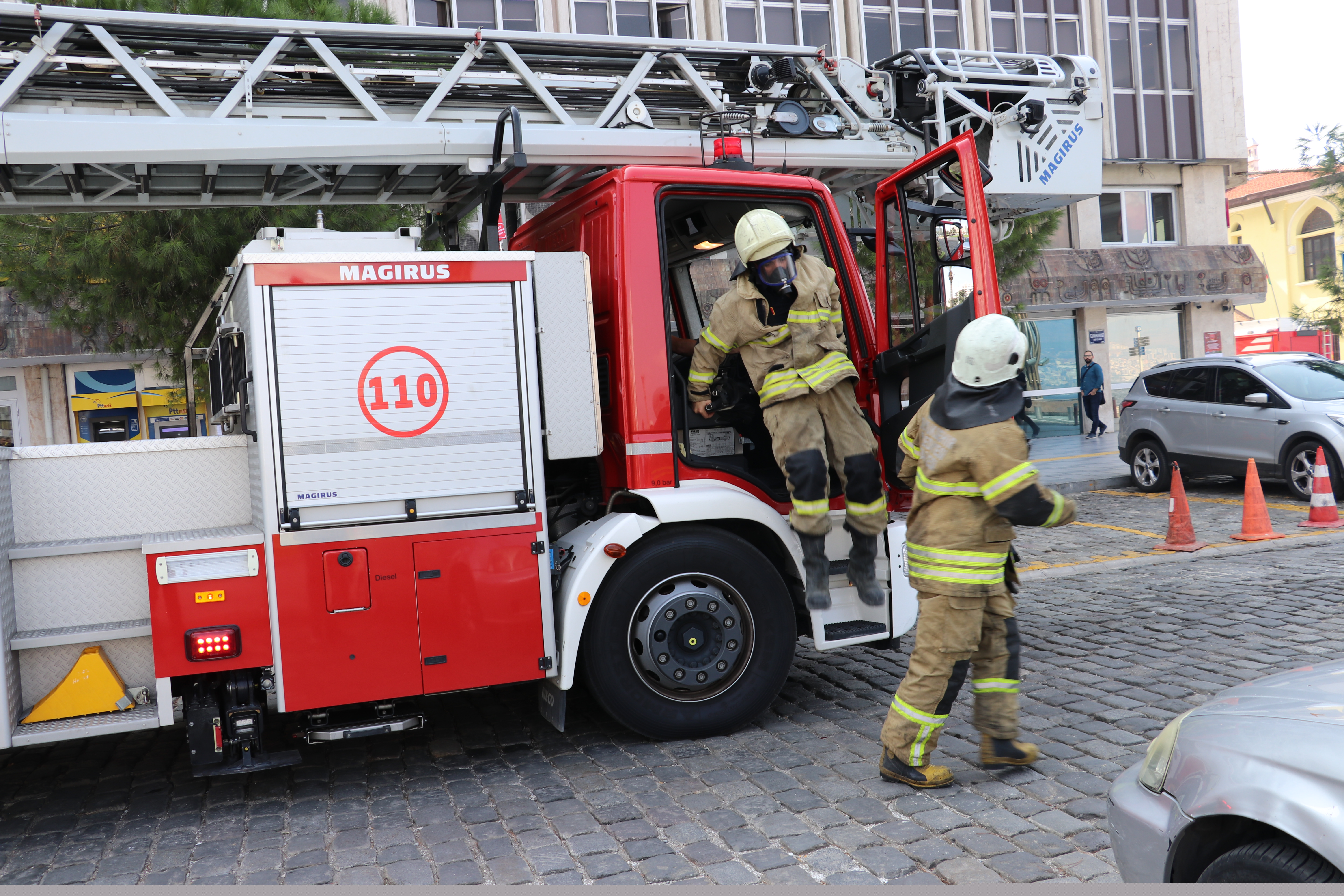 İtfaiye Haftası etkinlikleri kapsamında, Türk Telekom İzmir Bölge Müdürlüğü binasında yapılan tatbikatta senaryo gereği itfaiyeciler, ihbar üzerine merdivenli kurtarma aracı ve AKS aracıyla harekete geçti.